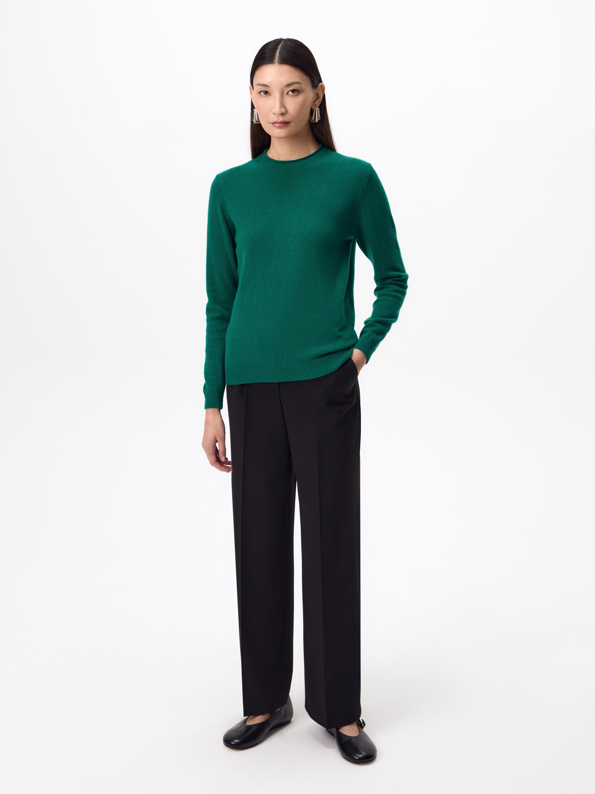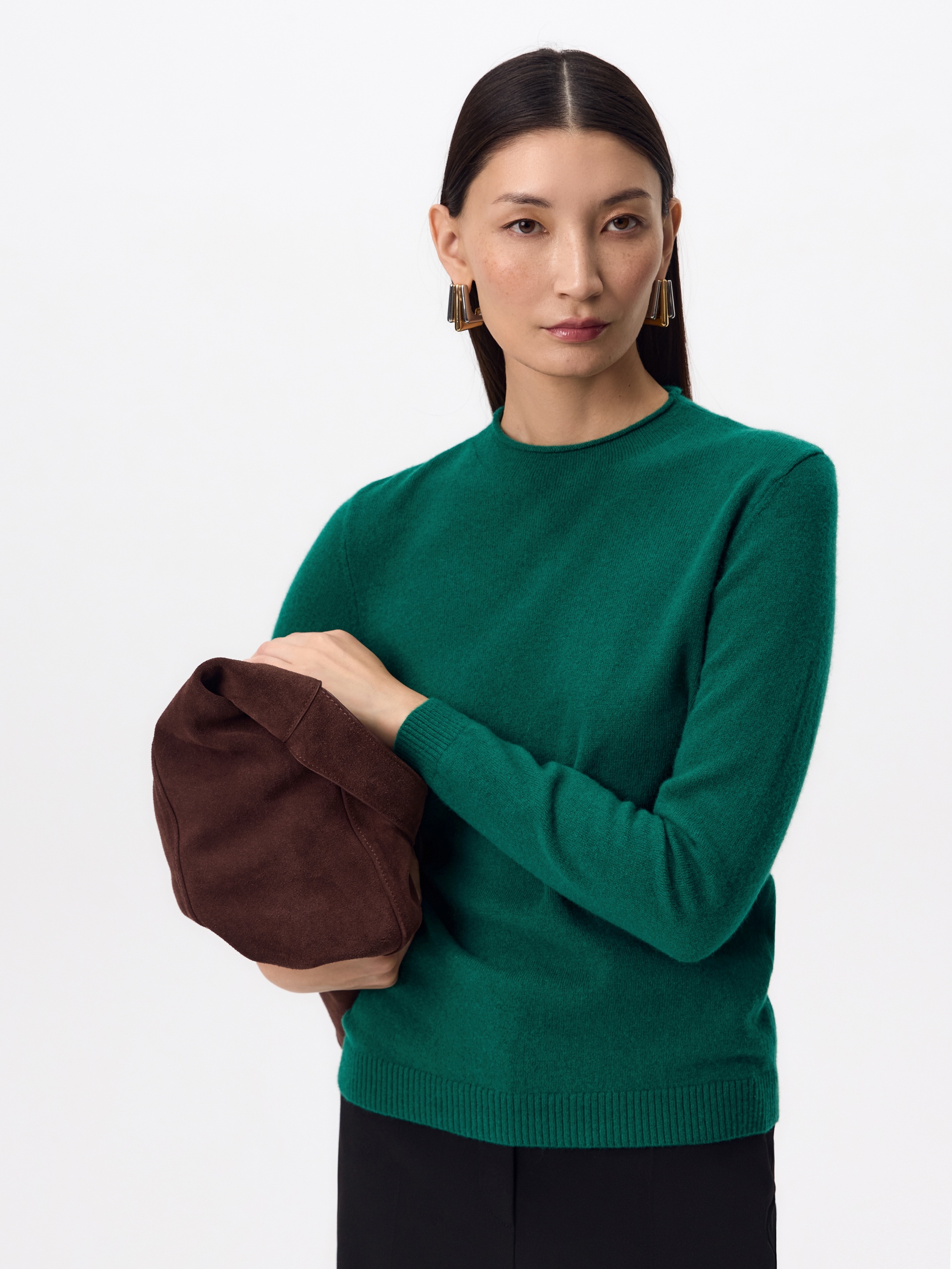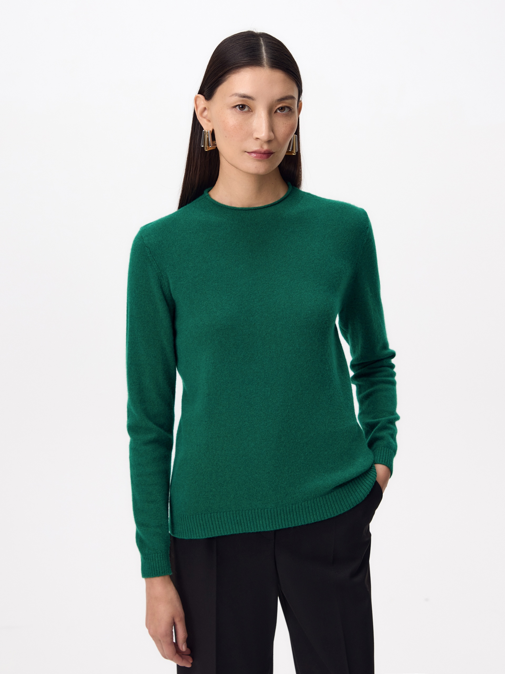 Базовый вязаный джемпер зеленого цвета. У джемпера круглая горловина и втачной рукав полной длины. Тонкая и легкая шерсть мериноса абсолютно не колется, что позволяет ей стать прекрасной базой как первый слой под жакеты в осенний период. Мериносовая пряжа и кашемир отличаются тонкостью и мягкостью волокна, высокой прочностью, влагопоглощением, а также особыми теплоизоляционными характеристиками.