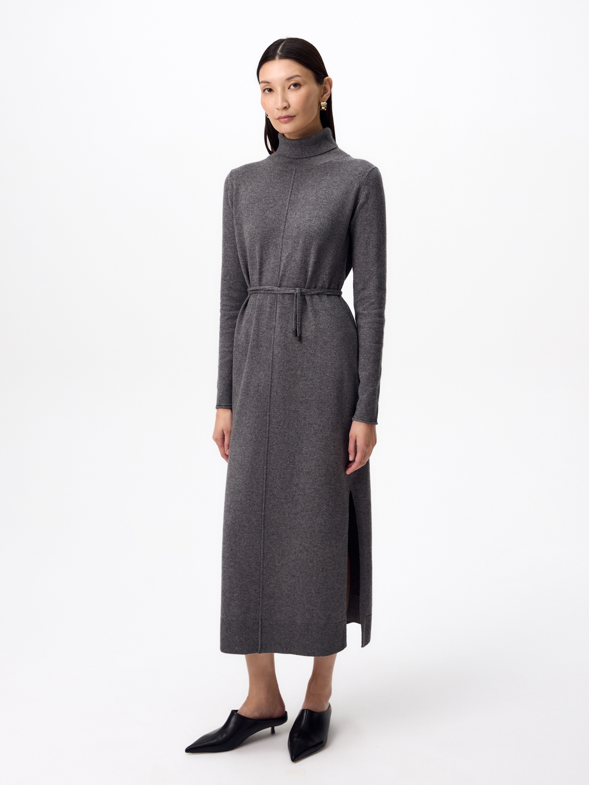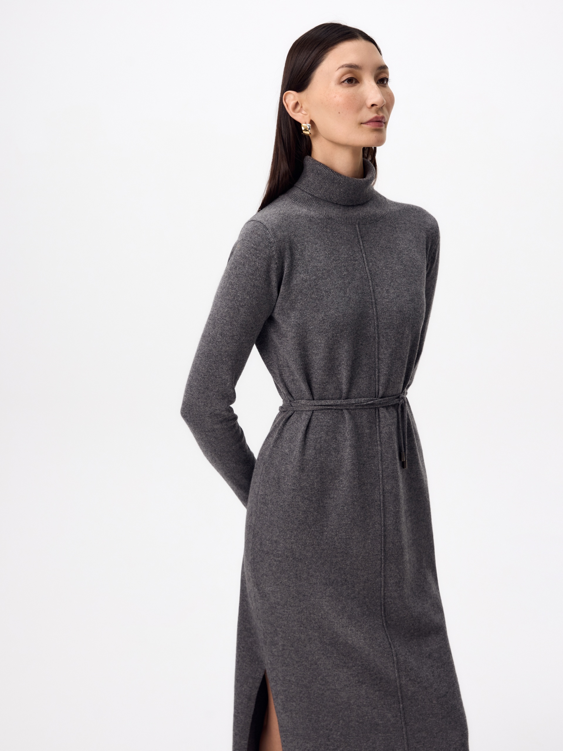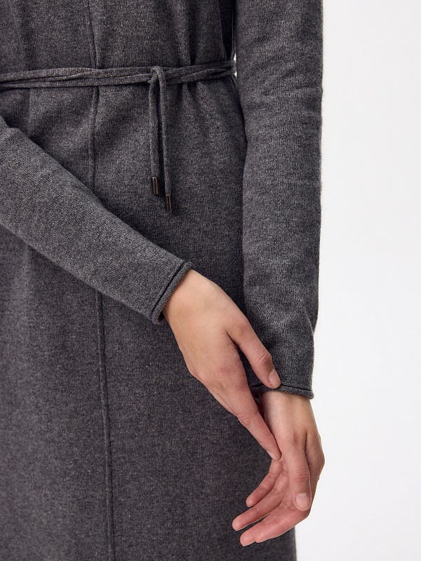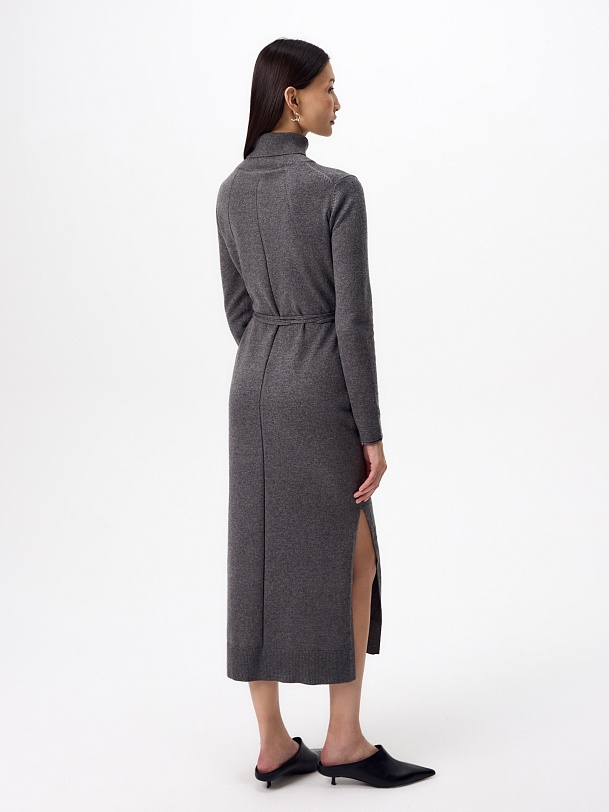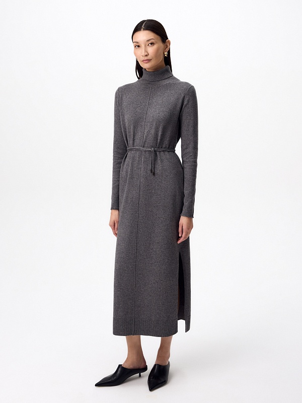 Зимнее платье из кашемира длиной макси с высоким воротником-стойкой, втачным рукавом и разрезами по боковым швам. В комплект входит тонкий пояс из основной ткани с наконечниками.