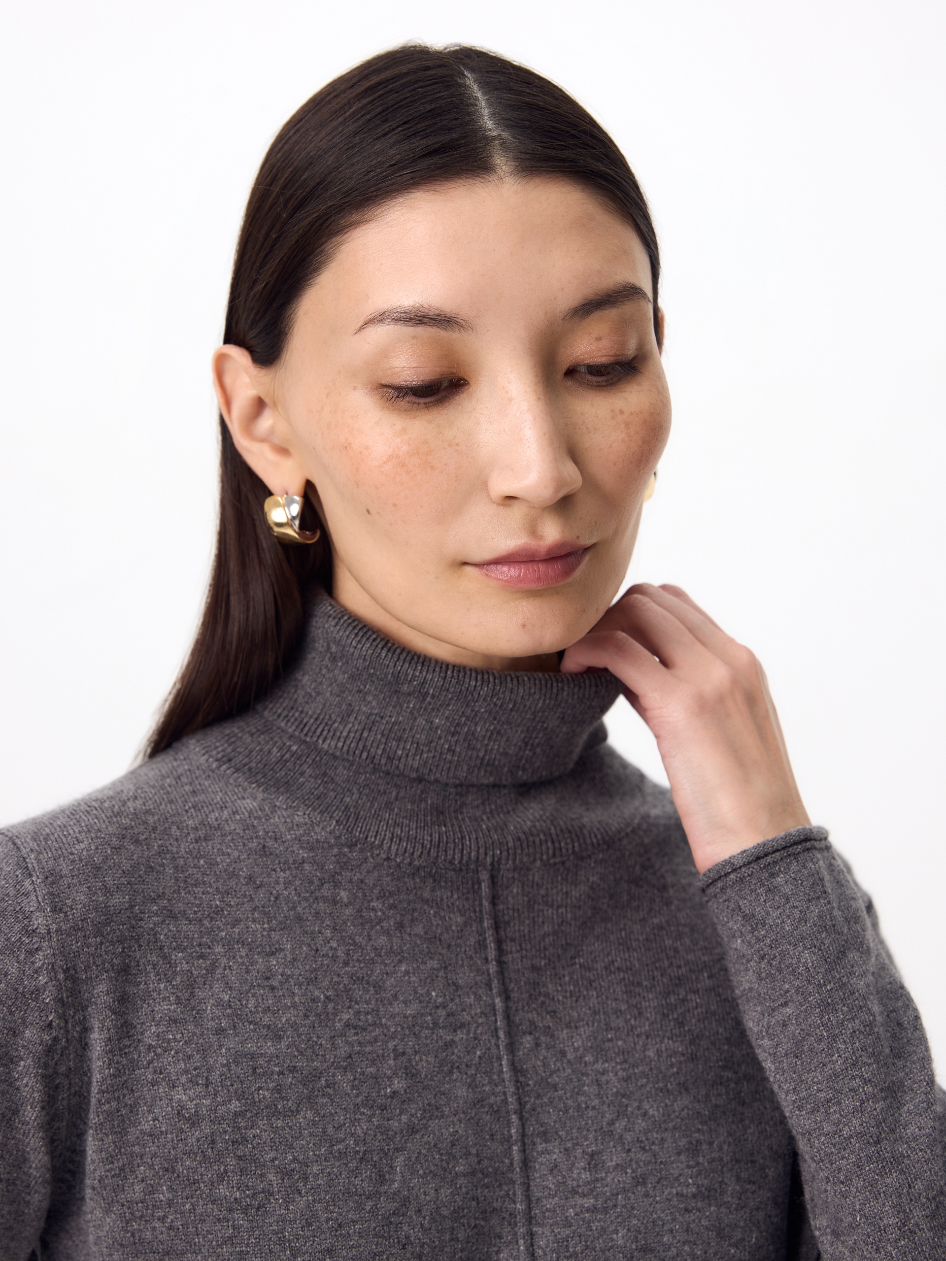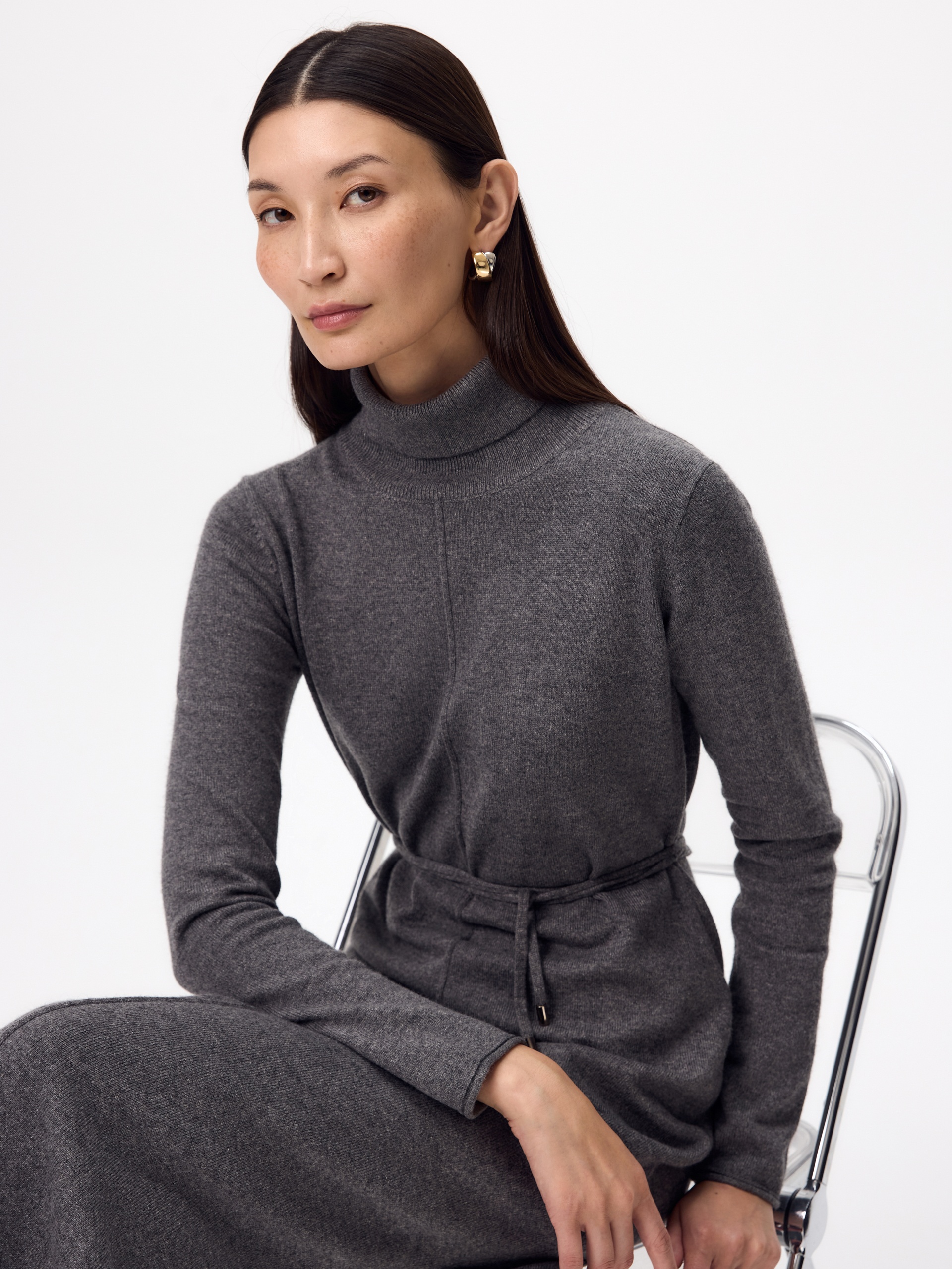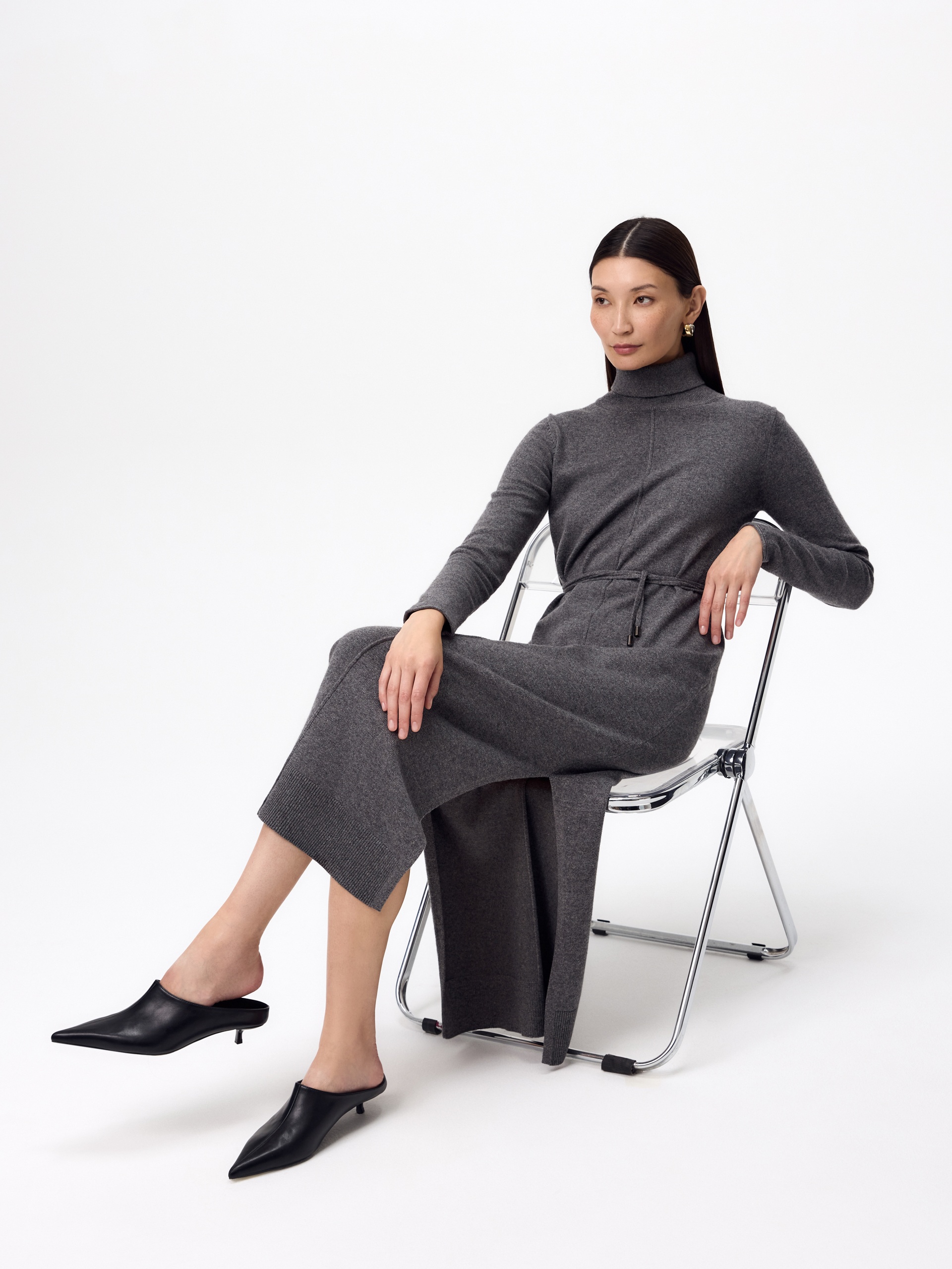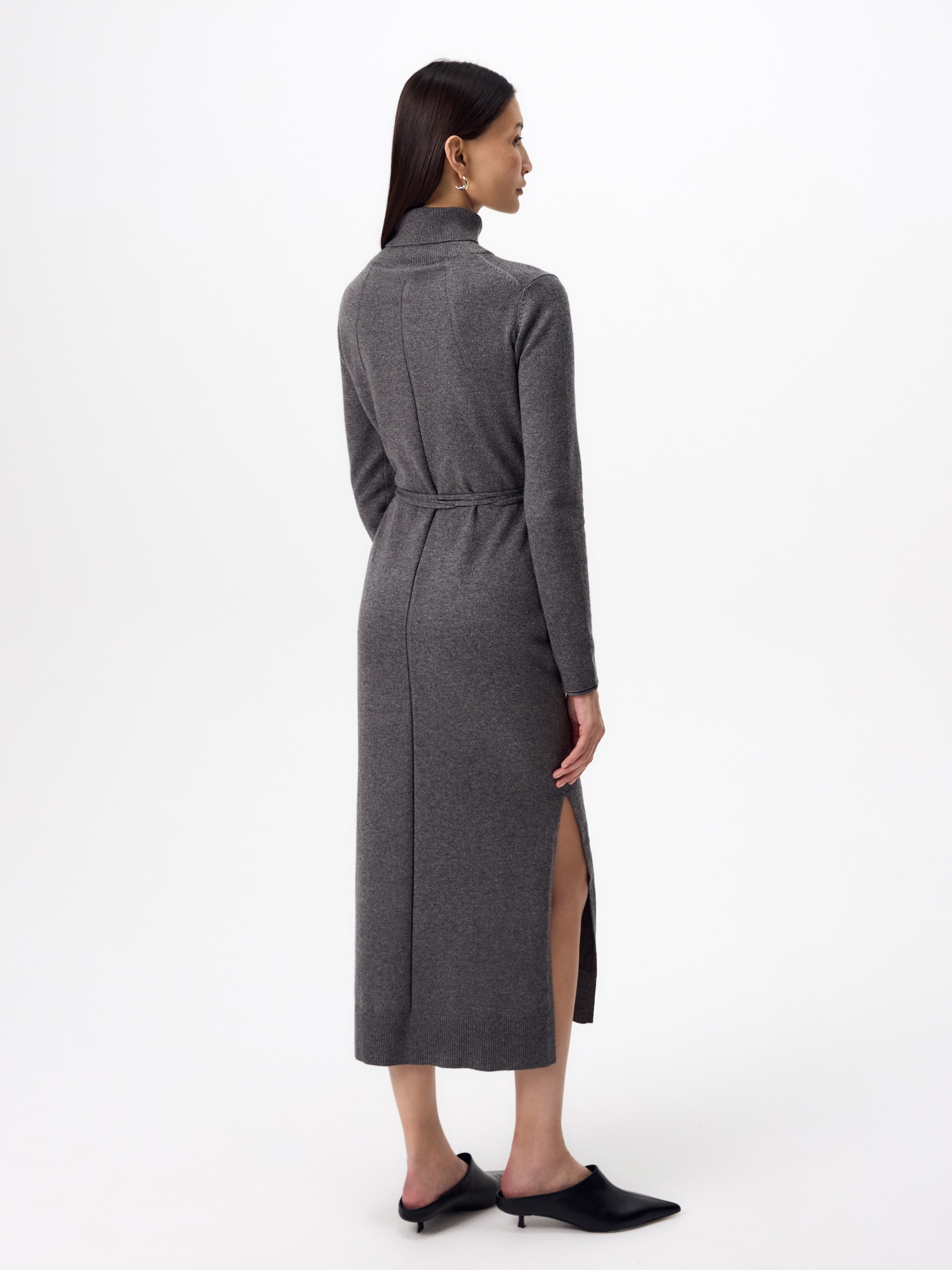 Зимнее платье из кашемира длиной макси с высоким воротником-стойкой, втачным рукавом и разрезами по боковым швам. В комплект входит тонкий пояс из основной ткани с наконечниками.