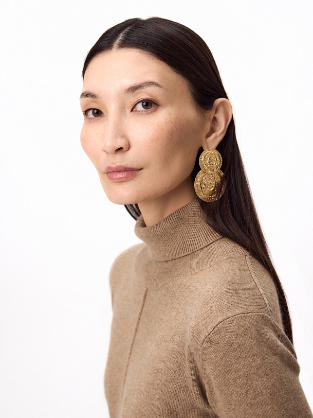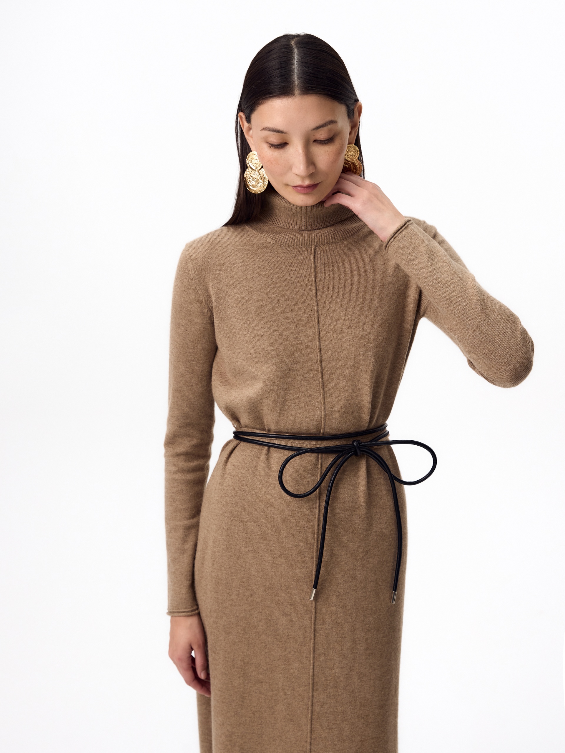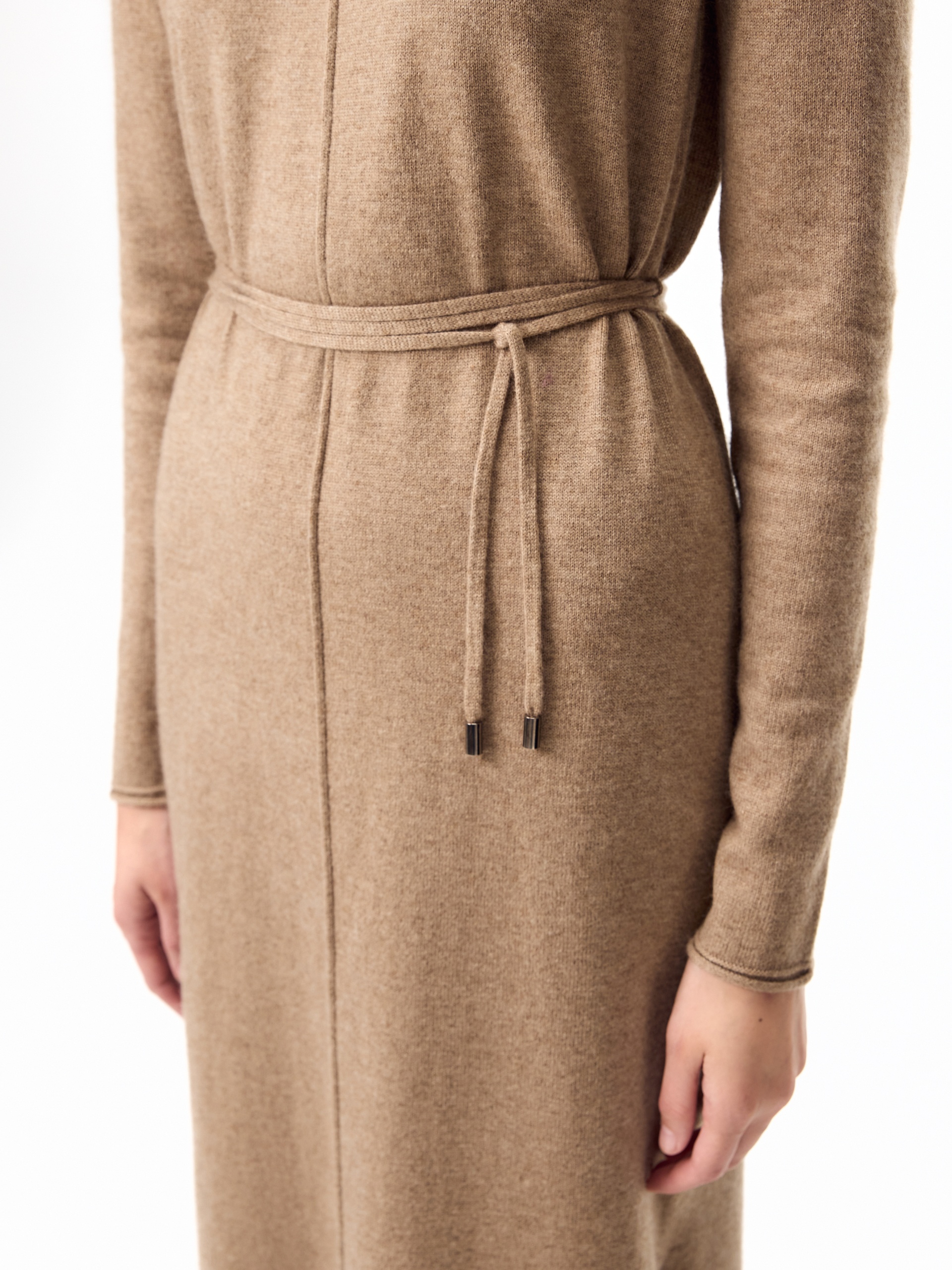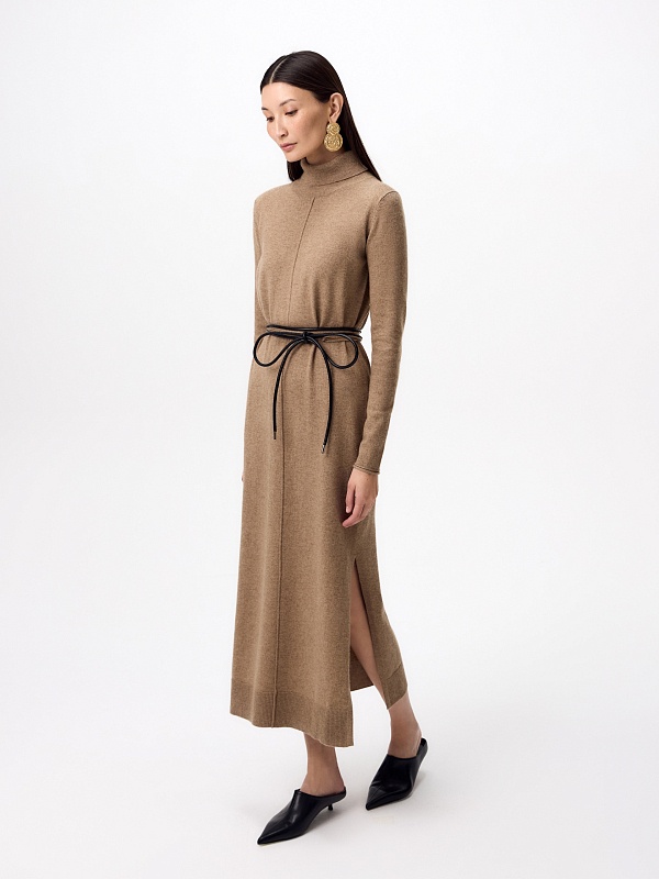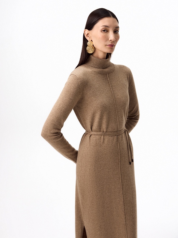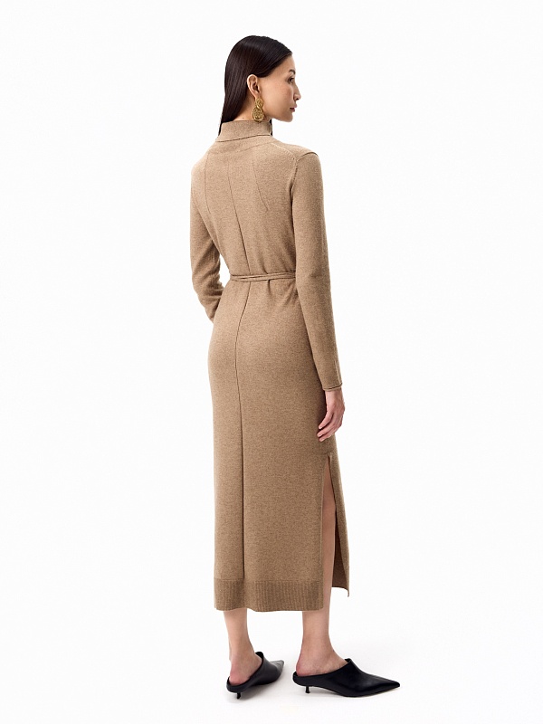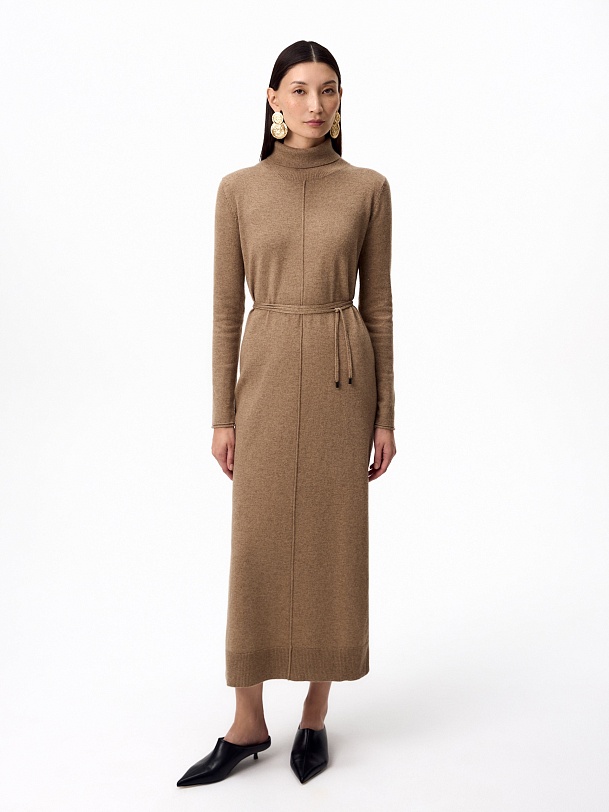 Зимнее платье из кашемира длиной макси с высоким воротником-стойкой, втачным рукавом и разрезами по боковым швам. В комплект входит тонкий пояс из основной ткани с наконечниками.