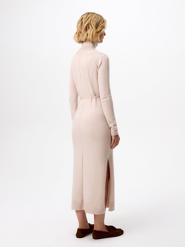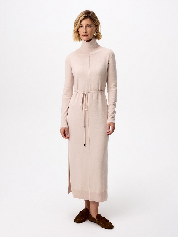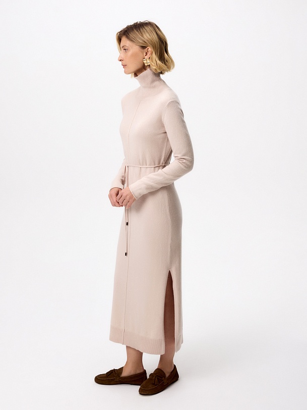 Зимнее платье из кашемира длиной макси с высоким воротником-стойкой, втачным рукавом и разрезами по боковым швам. В комплект входит тонкий пояс из основной ткани с наконечниками.