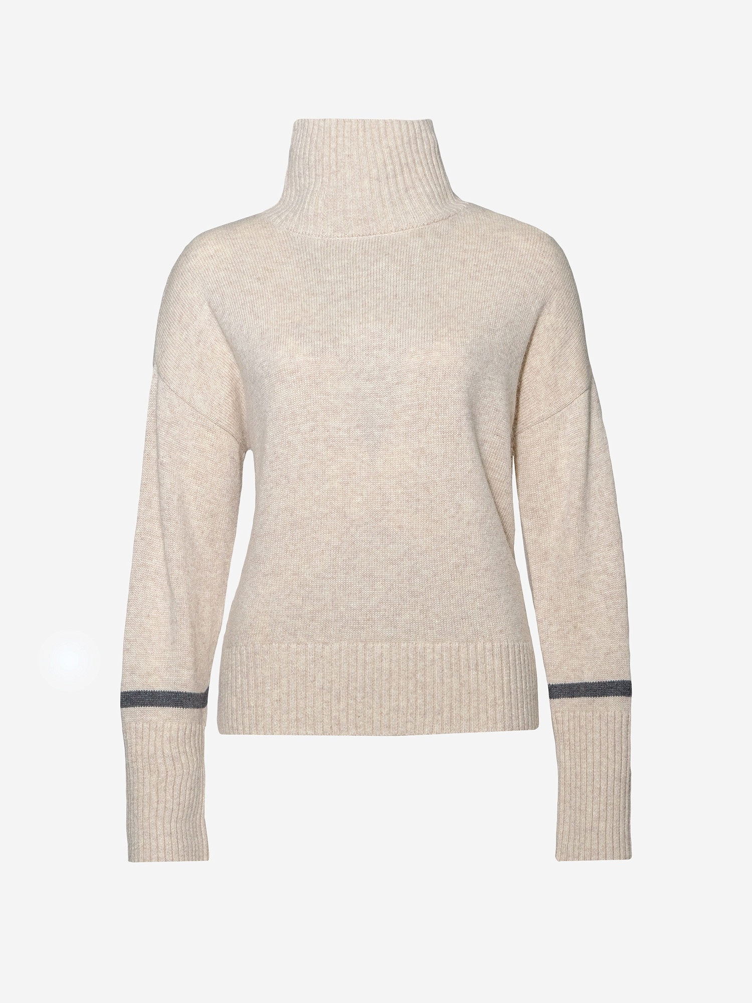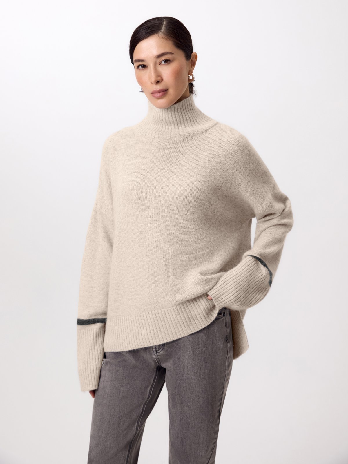 Уютный свитер свободного силуэта с воротником-стойкой, спущенной линией плеча и декоративной контрастной полоской по низу рукава, есть небольшие разрезы по боковым швам.