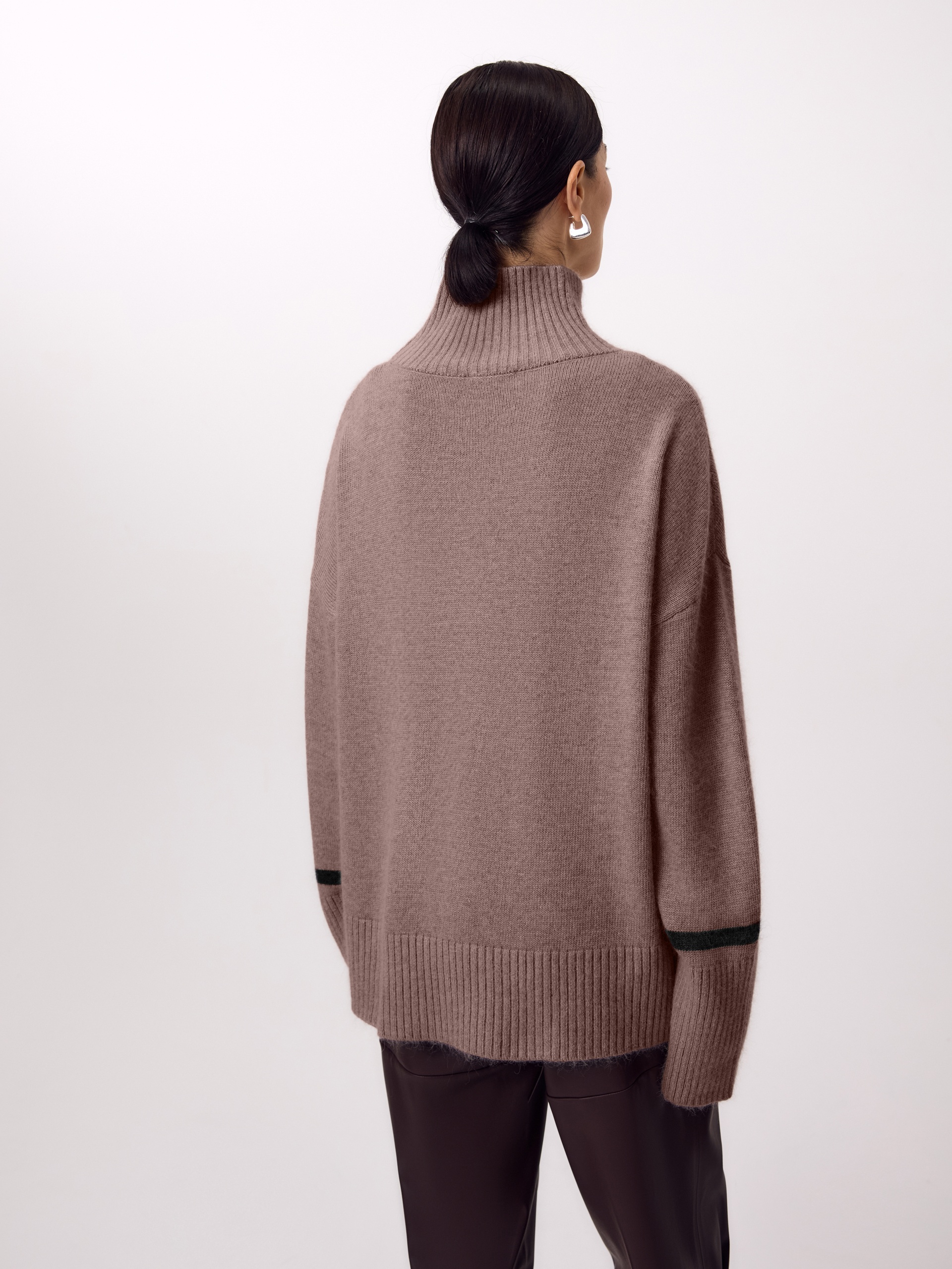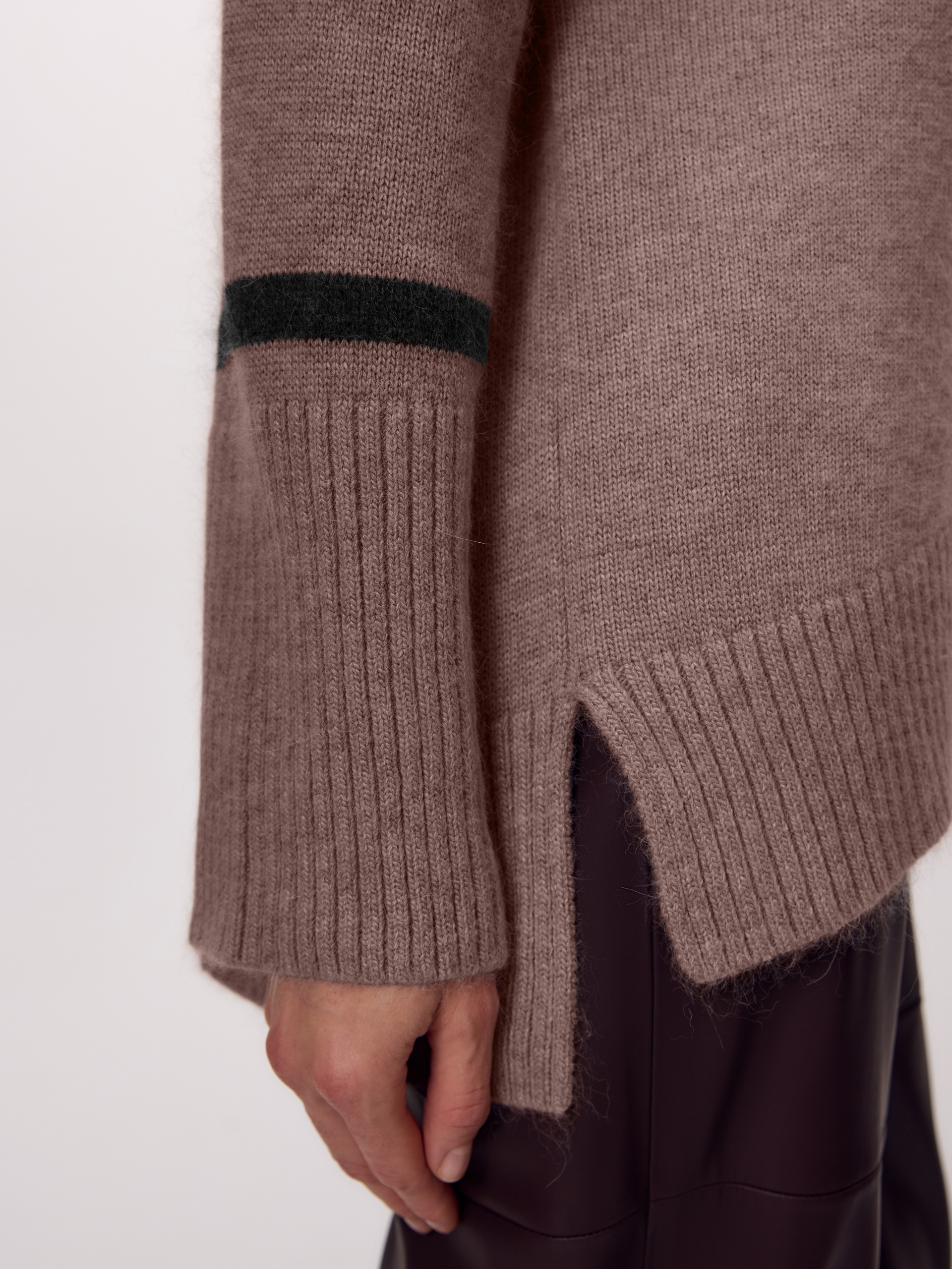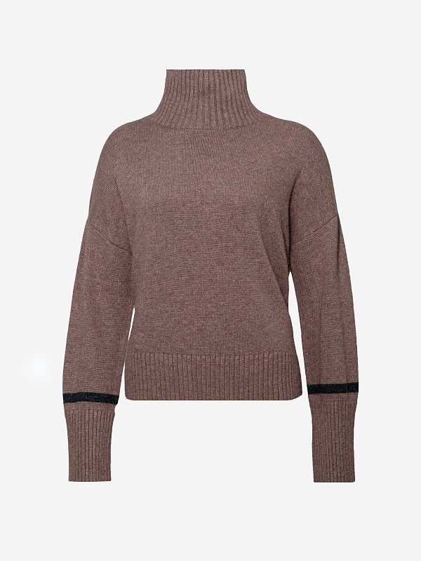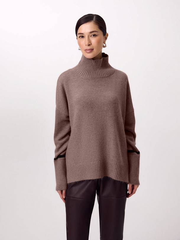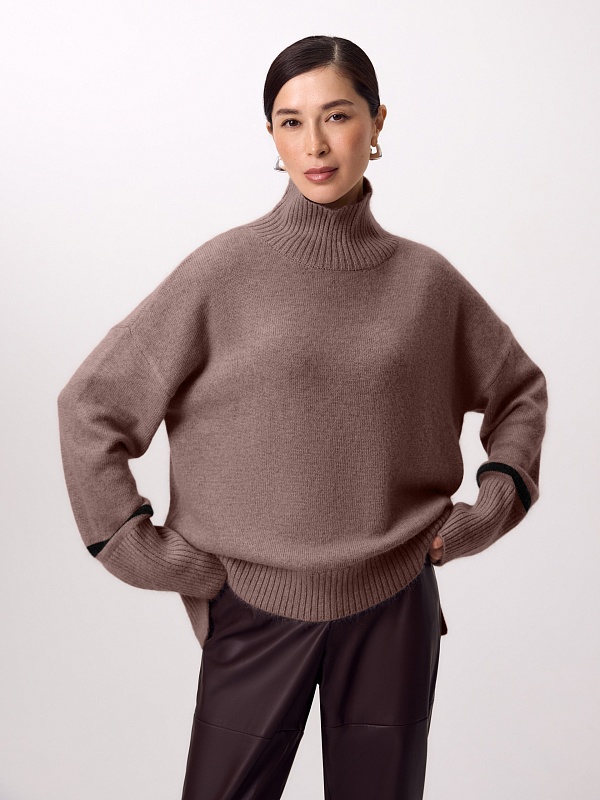 Уютный свитер свободного силуэта с воротником-стойкой, спущенной линией плеча и декоративной контрастной полоской по низу рукава, есть небольшие разрезы по боковым швам.