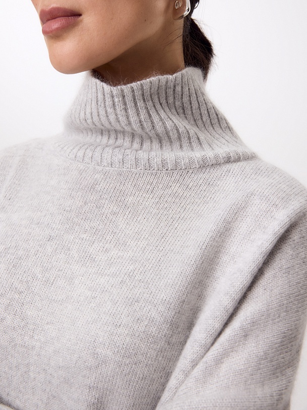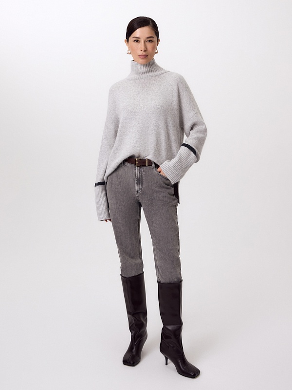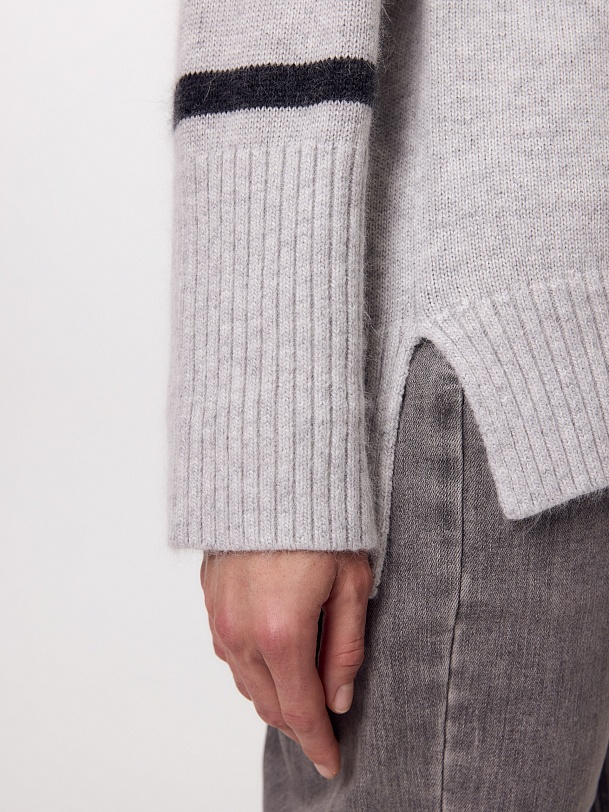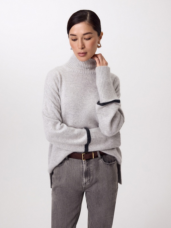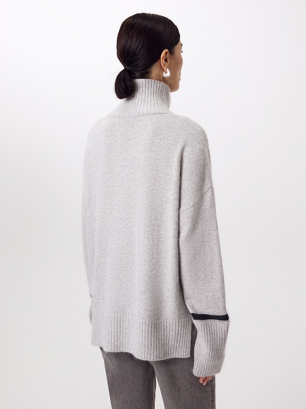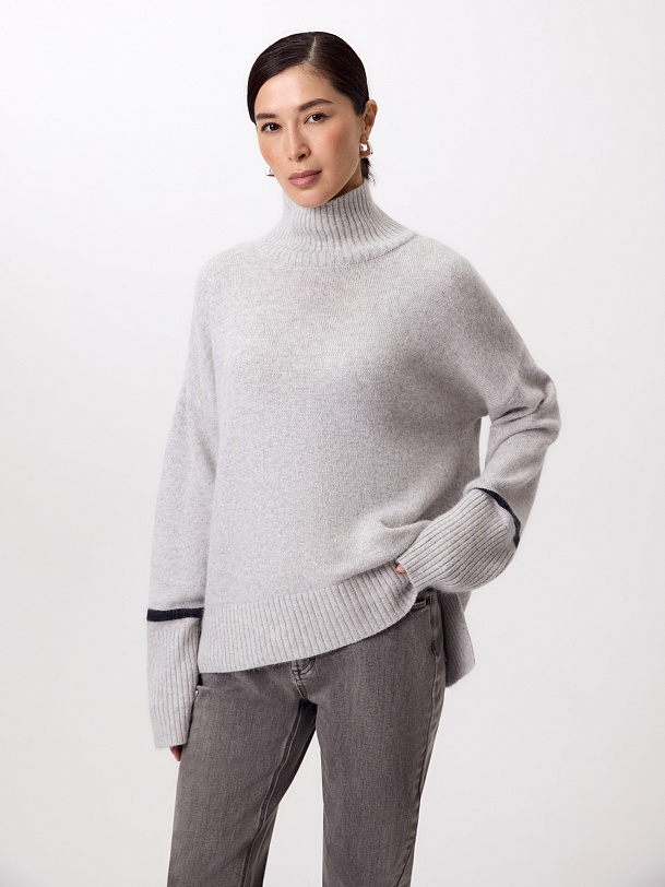 Уютный свитер свободного силуэта с воротником-стойкой, спущенной линией плеча и декоративной контрастной полоской по низу рукава, есть небольшие разрезы по боковым швам.