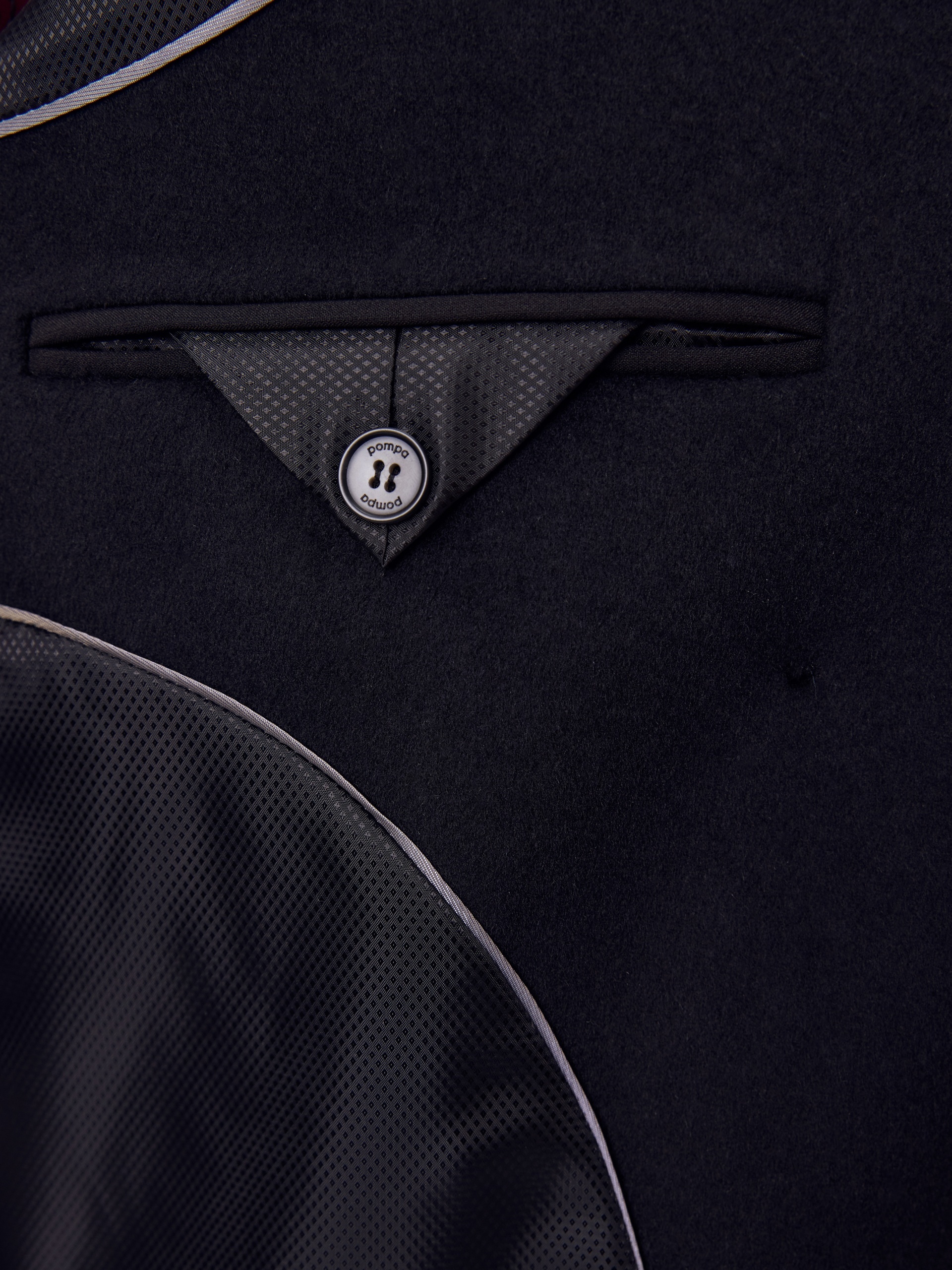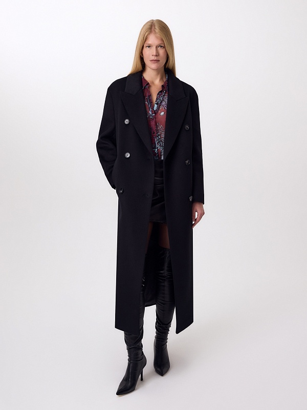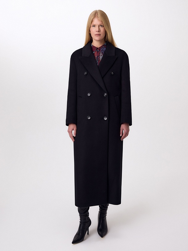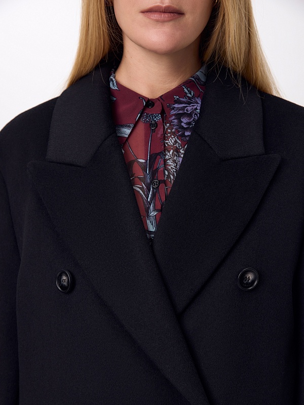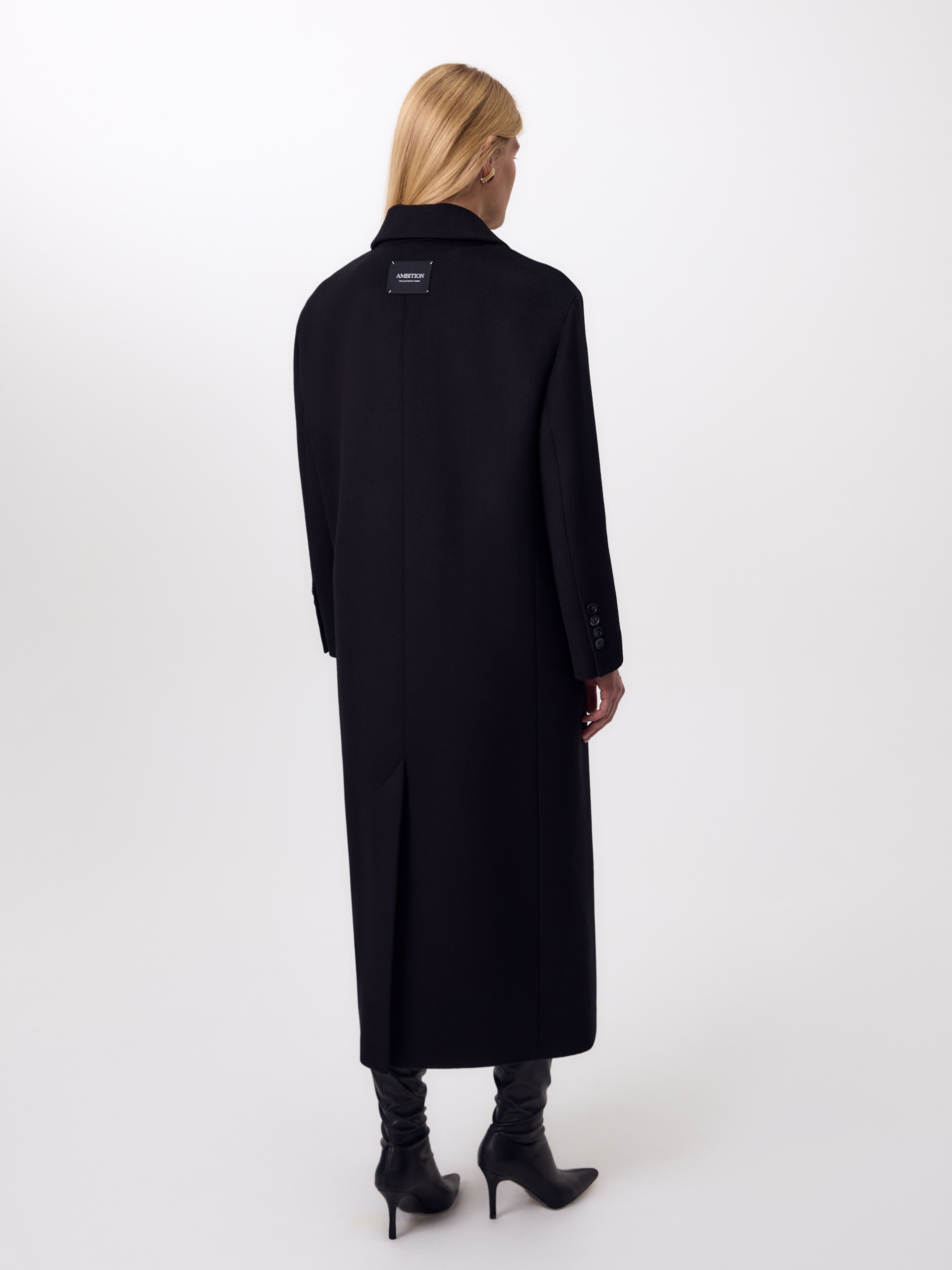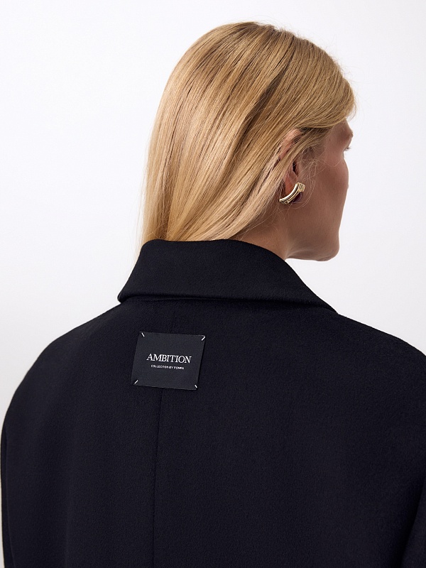 Двубортное стильное пальто прямого силуэта в мужском стиле из линейки Ambition, с расширенной линией плеча. Выполнено из ворсовой ткани с эффектом диагонали в глубоком черном цвете. Пальто имеет английский воротник и мягкий втачной рукав с застежкой по низу на ряд пуговиц. Карманы врезные листочки с клапаном. В среднем шве спинки высокая шлица. Застегивается изделие на пуговицы. Для наилучшей защиты от непогоды изделие выполнено с использованием высокотехнологичной мембраны RaftPro, а спинка пальто имеет дополнительное утепление высокотехнологичным утеплителем DUPONT SORONA. Произведено в Санкт-Петербурге.