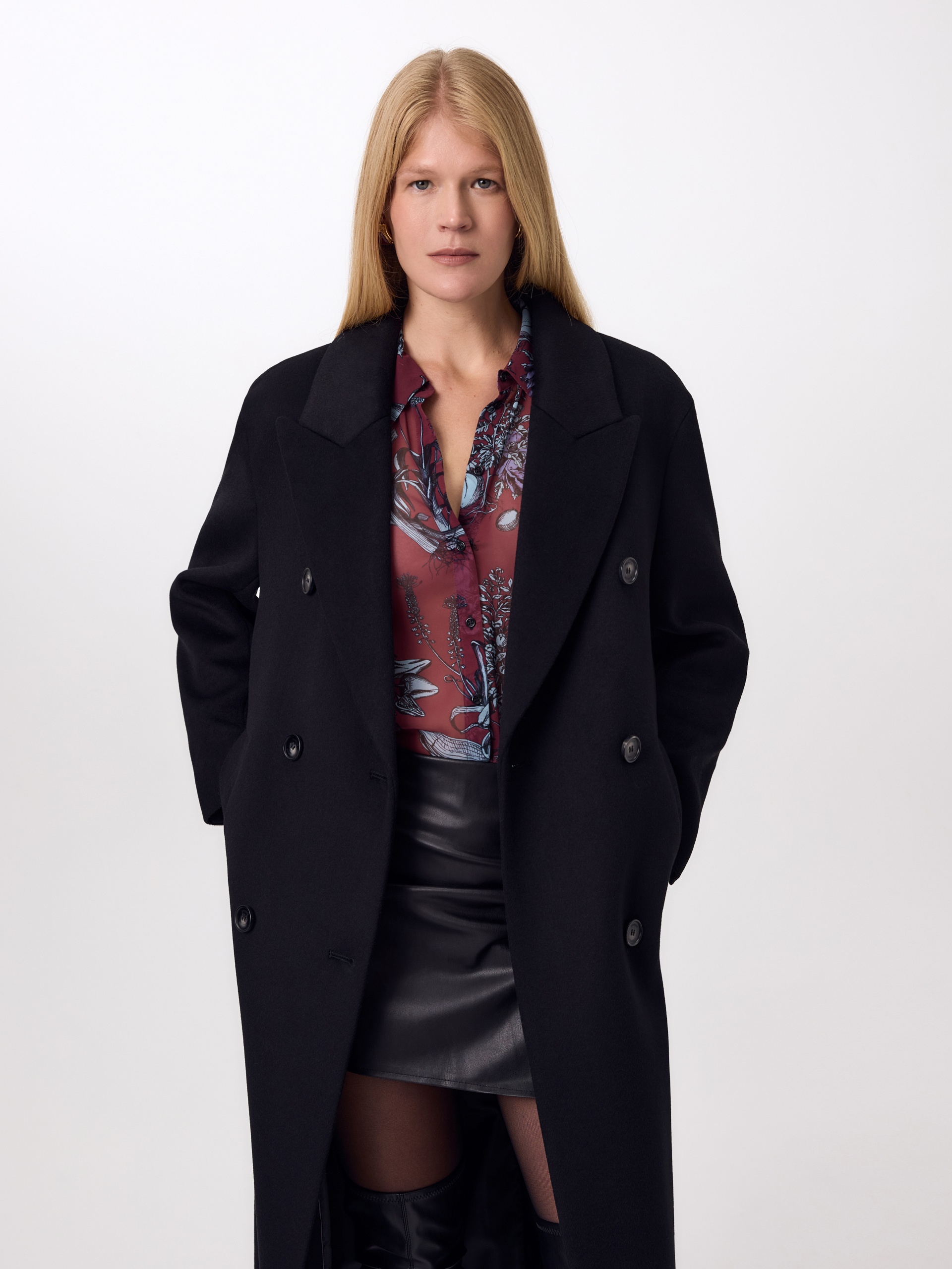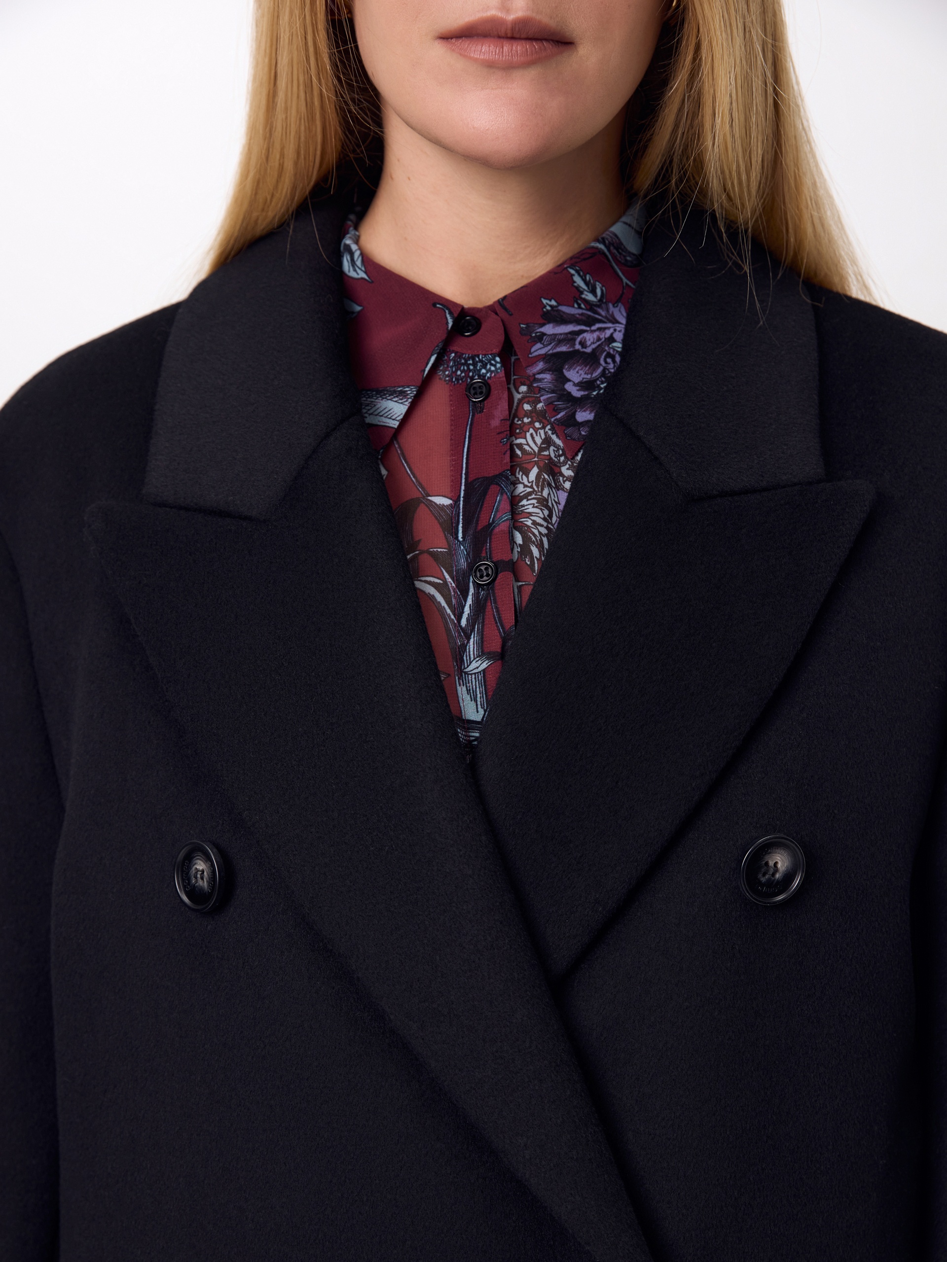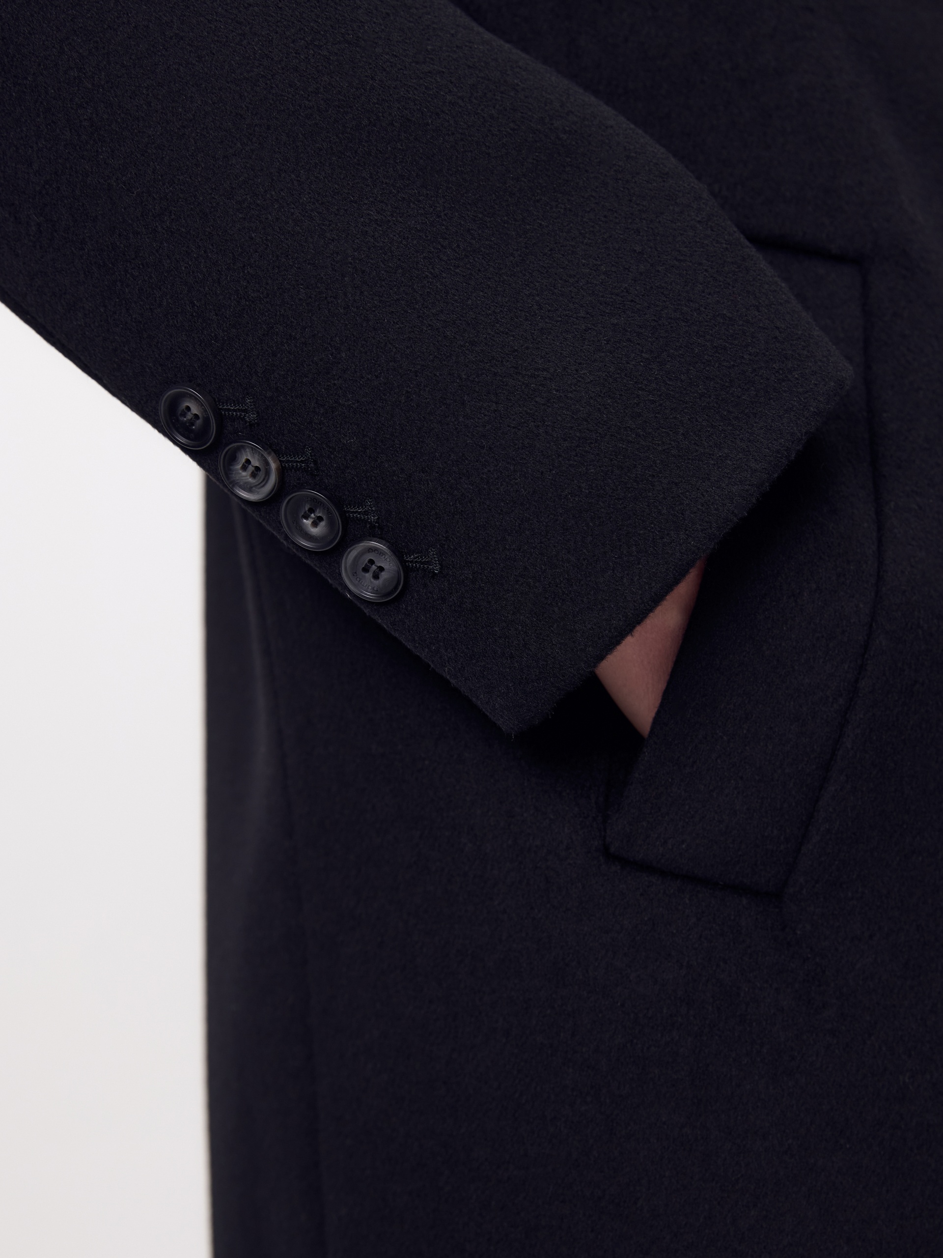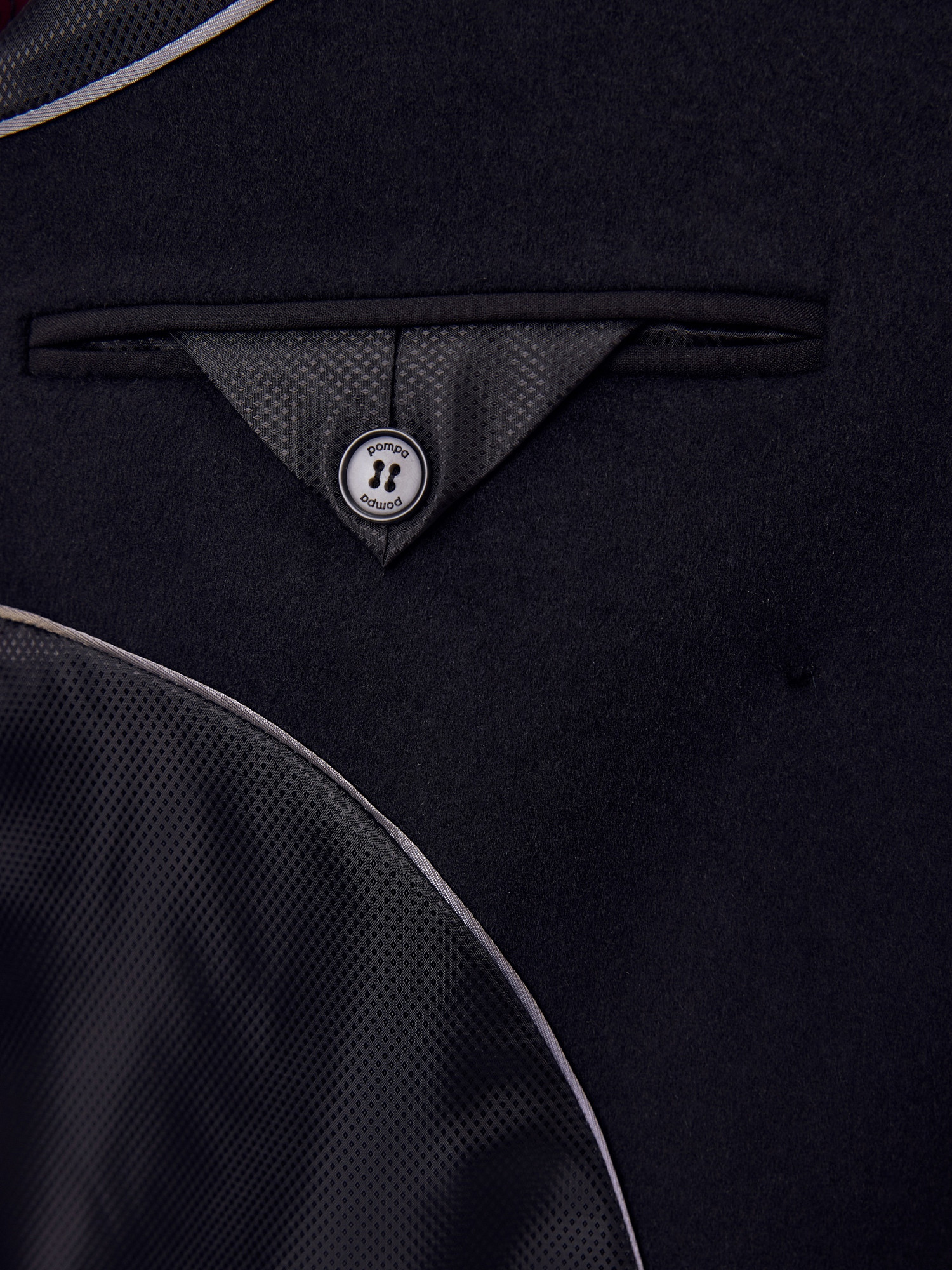 Двубортное стильное пальто прямого силуэта в мужском стиле из линейки Ambition, с расширенной линией плеча. Выполнено из ворсовой ткани с эффектом диагонали в глубоком черном цвете. Пальто имеет английский воротник и мягкий втачной рукав с застежкой по низу на ряд пуговиц. Карманы врезные листочки с клапаном. В среднем шве спинки высокая шлица. Застегивается изделие на пуговицы. Для наилучшей защиты от непогоды изделие выполнено с использованием высокотехнологичной мембраны RaftPro, а спинка пальто имеет дополнительное утепление высокотехнологичным утеплителем DUPONT SORONA. Произведено в Санкт-Петербурге.