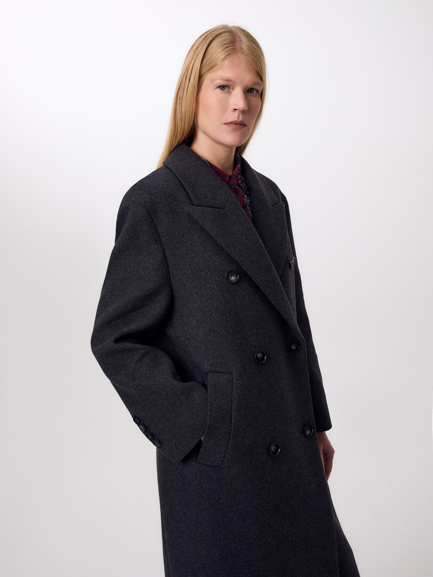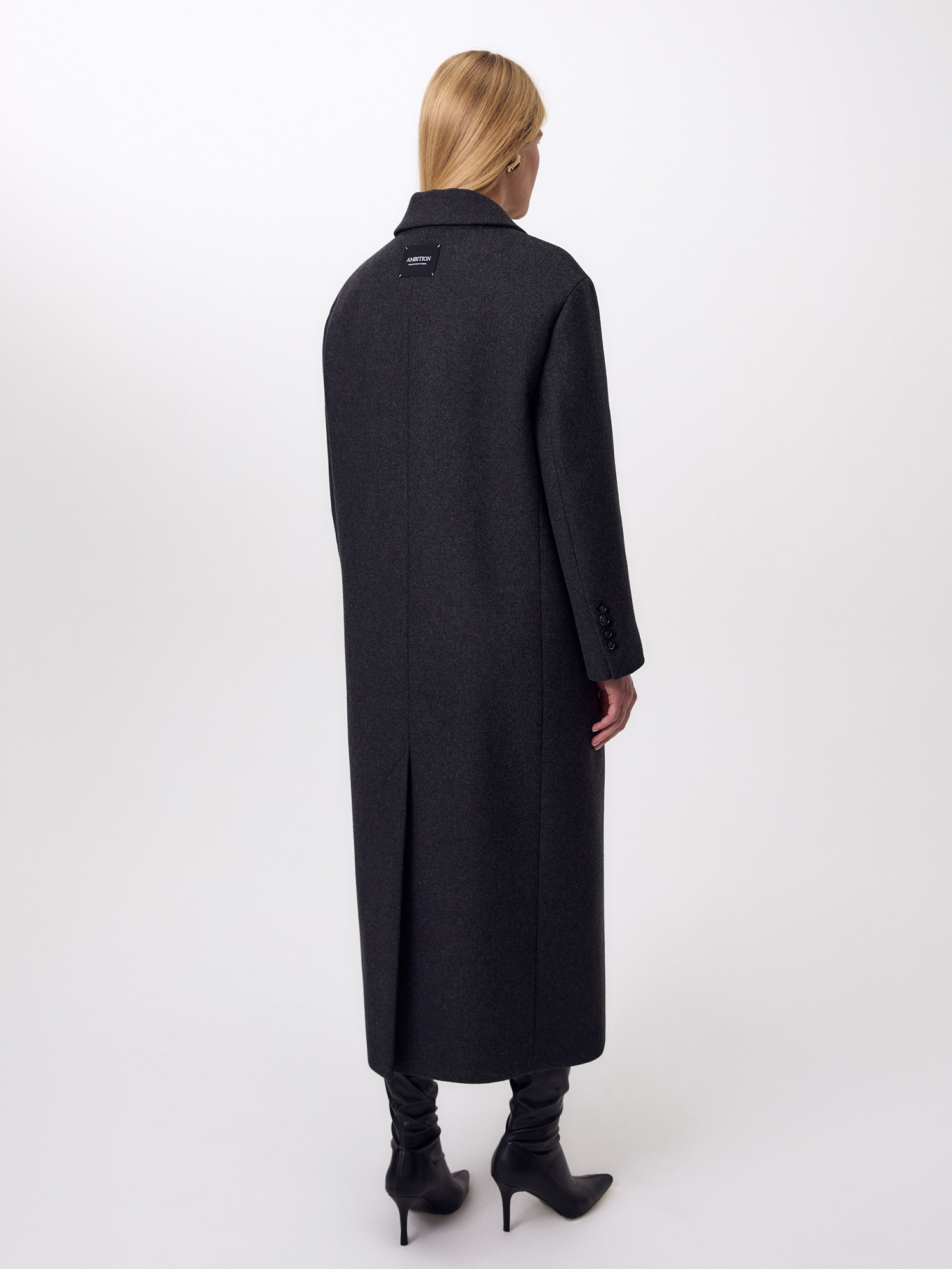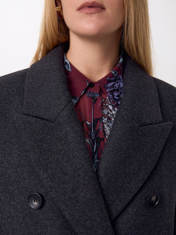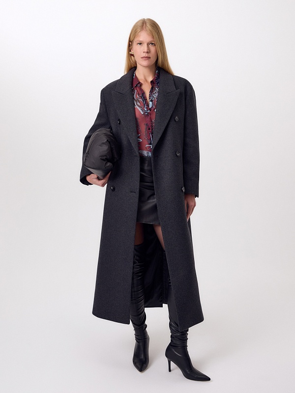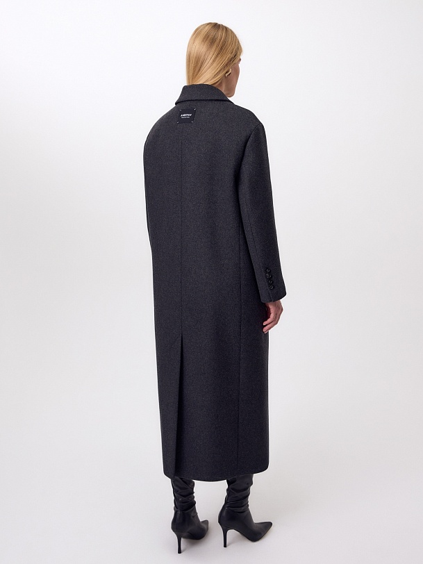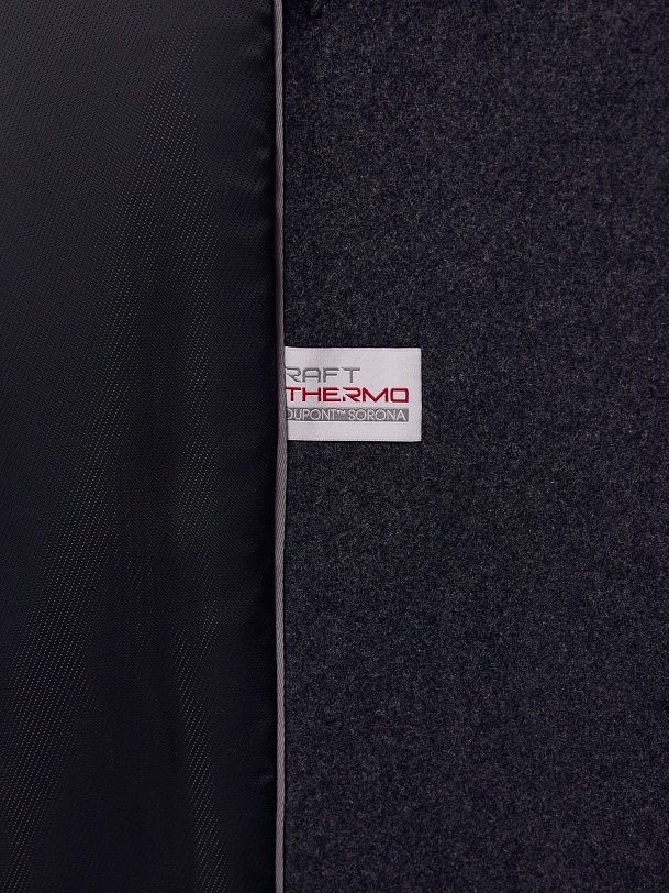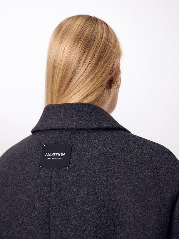 Двубортное стильное пальто прямого силуэта в мужском стиле из линейки Ambition, с расширенной линией плеча. Выполнено из теплой шерстяной ворсовой ткани в цвете графит. Пальто имеет английский воротник и мягкий втачной рукав с застежкой по низу на ряд пуговиц. Карманы врезные листочки с клапаном. В среднем шве спинки высокая шлица. Застегивается изделие на пуговицы. Для наилучшей защиты от непогоды изделие выполнено с использованием высокотехнологичной мембраны RaftPro, а спинка пальто имеет дополнительное утепление высокотехнологичным утеплителем DUPONT SORONA. Произведено в Санкт-Петербурге.