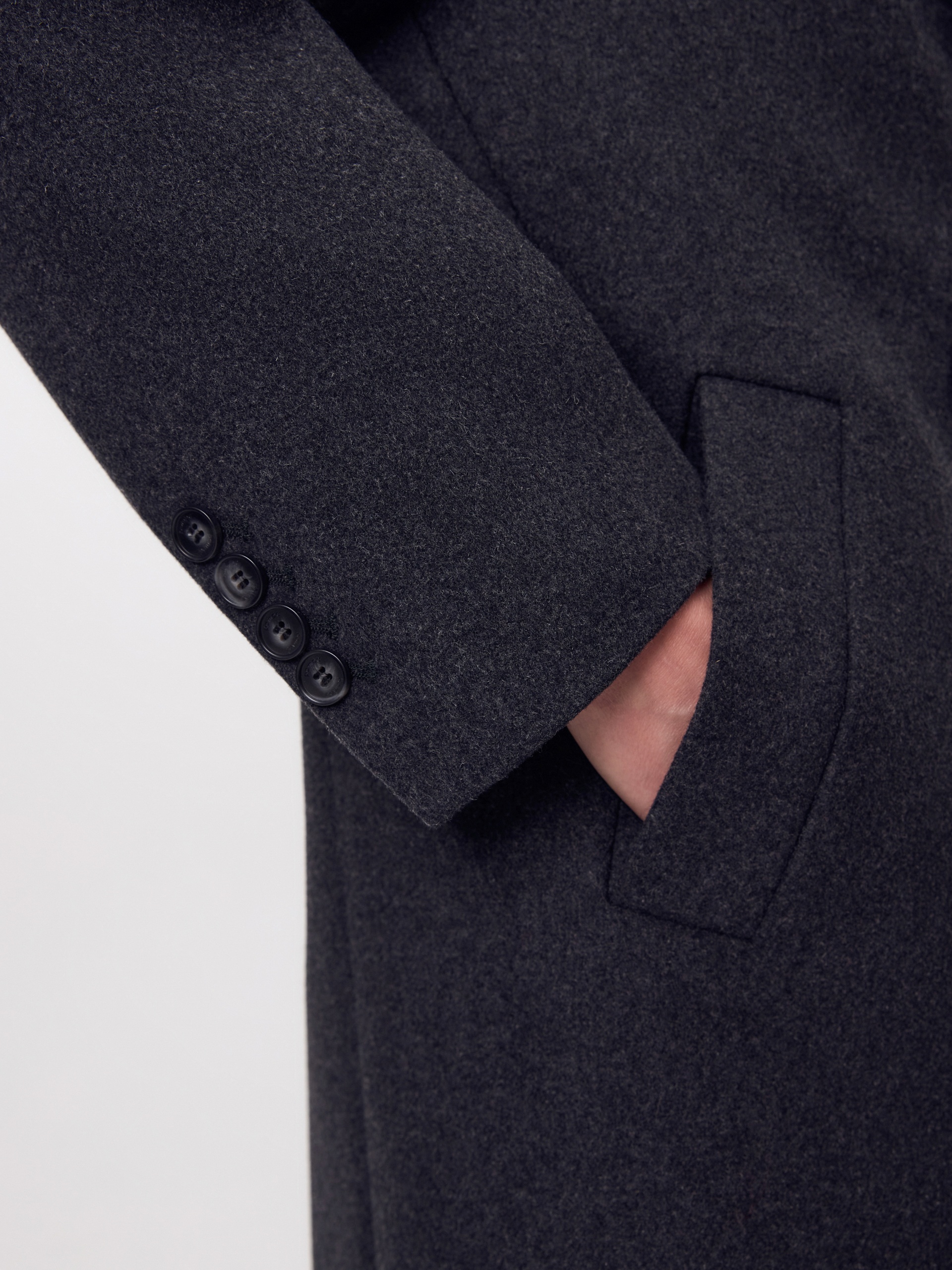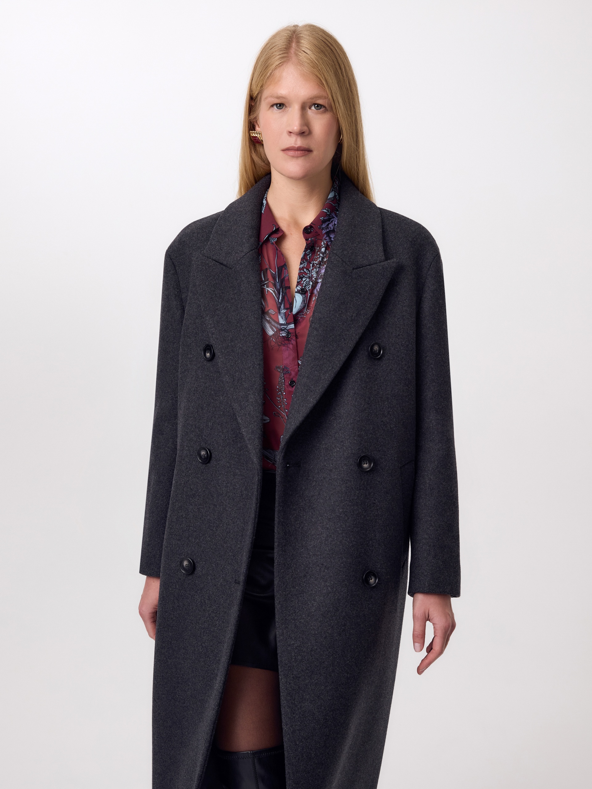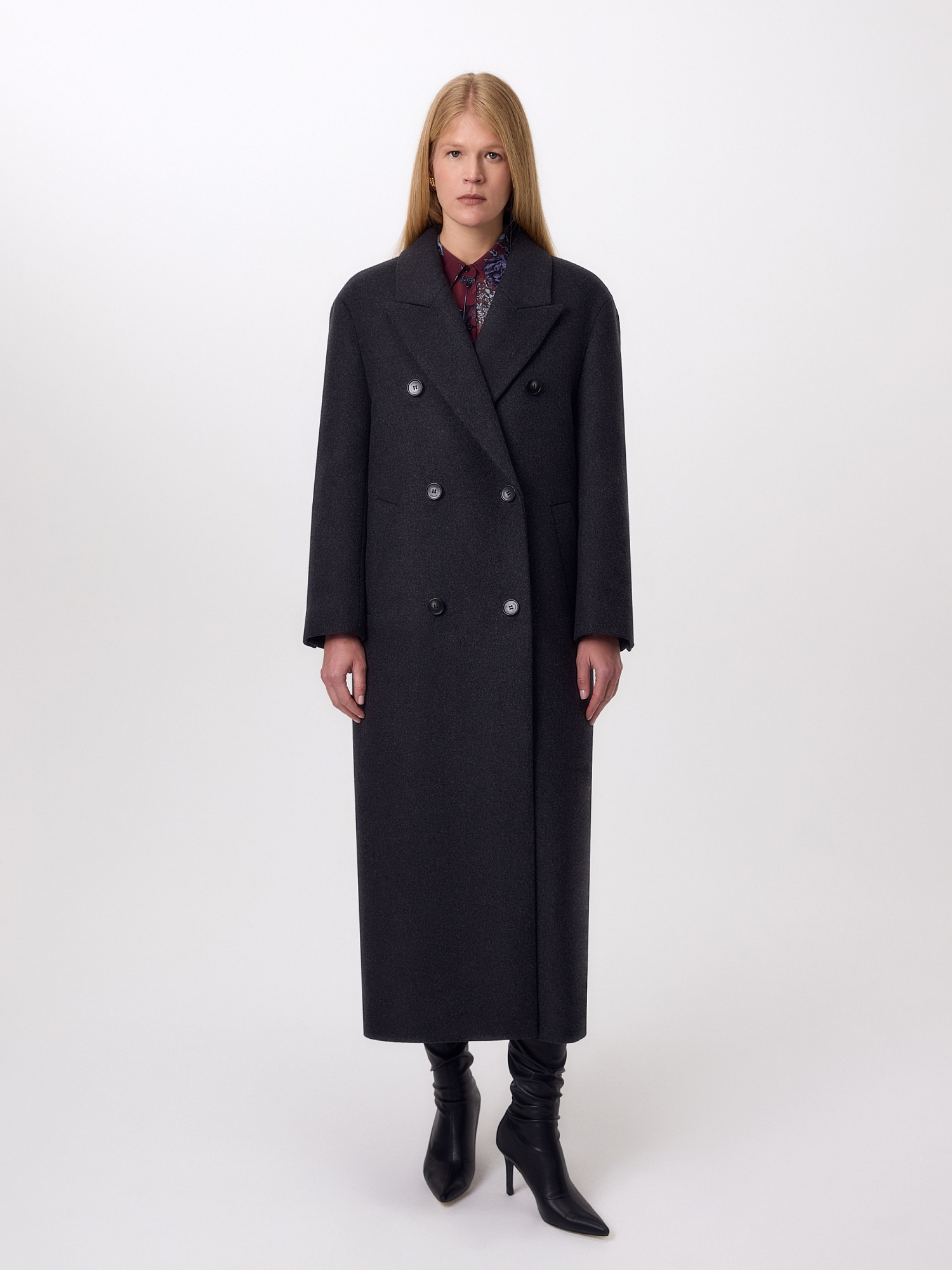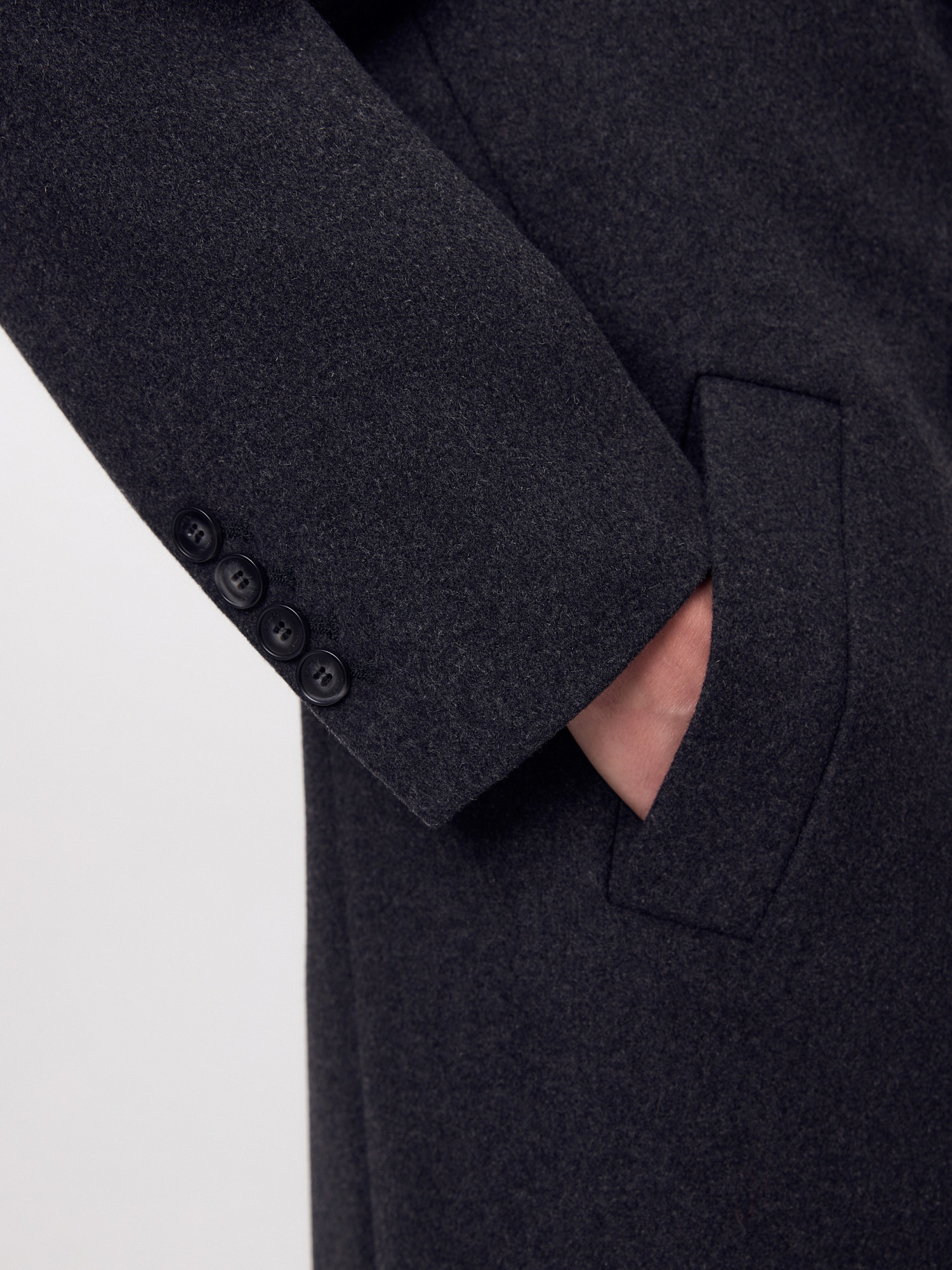 Двубортное стильное пальто прямого силуэта в мужском стиле из линейки Ambition, с расширенной линией плеча. Выполнено из теплой шерстяной ворсовой ткани в цвете графит. Пальто имеет английский воротник и мягкий втачной рукав с застежкой по низу на ряд пуговиц. Карманы врезные листочки с клапаном. В среднем шве спинки высокая шлица. Застегивается изделие на пуговицы. Для наилучшей защиты от непогоды изделие выполнено с использованием высокотехнологичной мембраны RaftPro, а спинка пальто имеет дополнительное утепление высокотехнологичным утеплителем DUPONT SORONA. Произведено в Санкт-Петербурге.