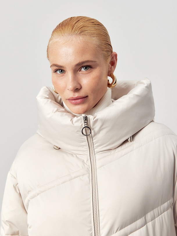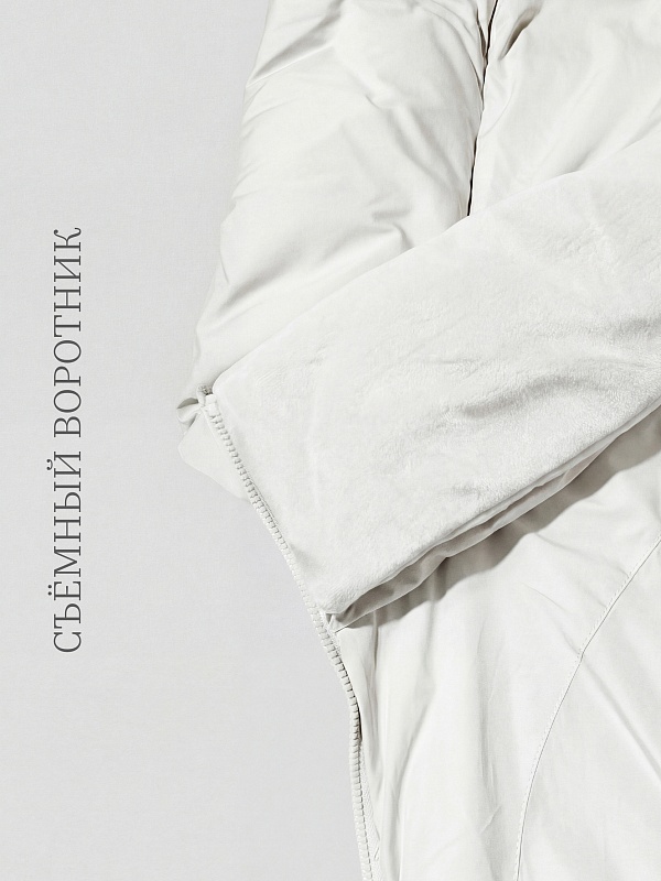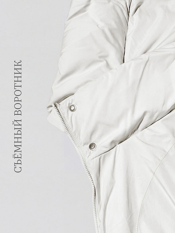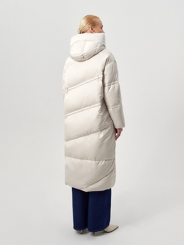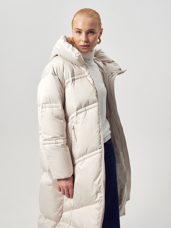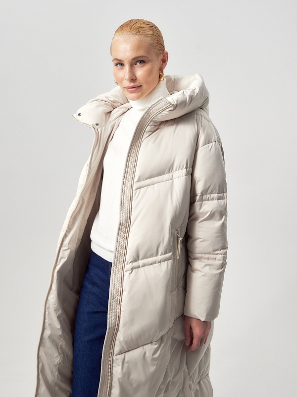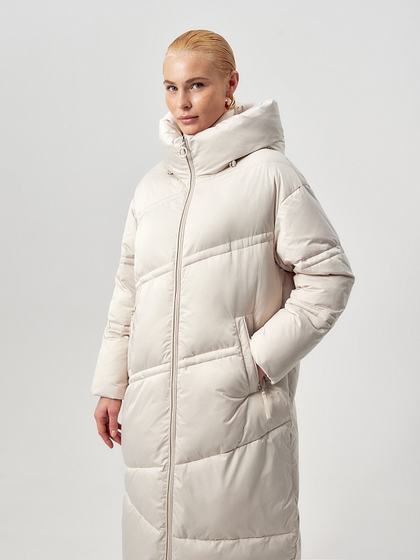 Длинное пальто из плащевой ткани в молочном цвете на натуральном утеплителе пух/перо. Высокий воротник-стойка переходит в глубокий капюшон. Внутренняя часть воротника-стойки съёмная — её легко снять и постирать отдельно. Зауженный к низу рукав защищает от ветра. Застёжка на молнию. Пуховик декорирован особой фигурной стёжкой.