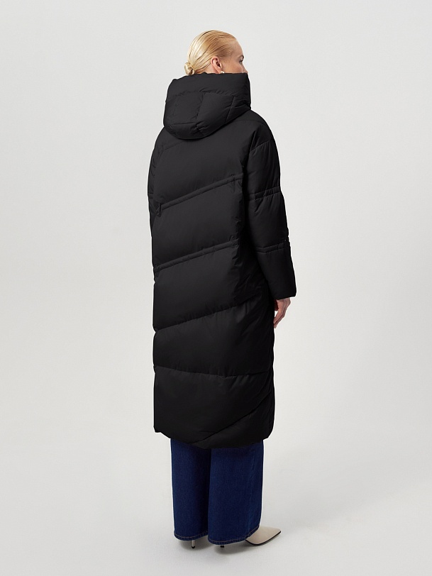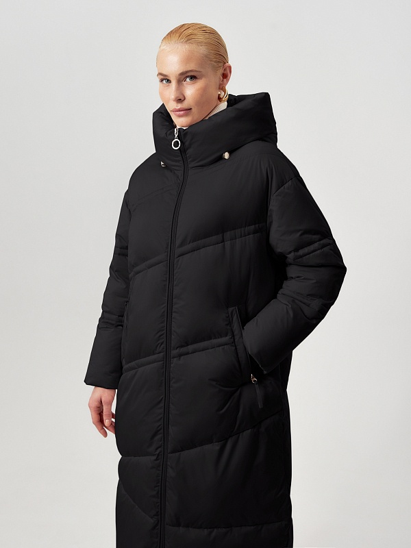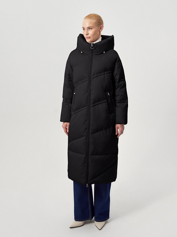 Длинное пальто из плащевой ткани в чёрном цвете на натуральном утеплителе пух/перо. Высокий воротник-стойка переходит в глубокий капюшон. Зауженный к низу рукав защищает от ветра. Застёжка на молнию. Пуховик декорирован особой фигурной стёжкой.