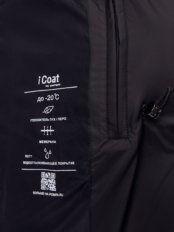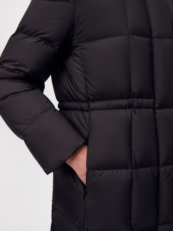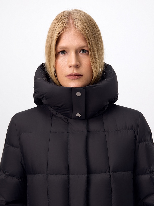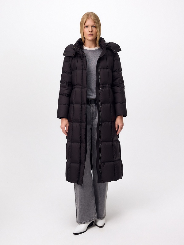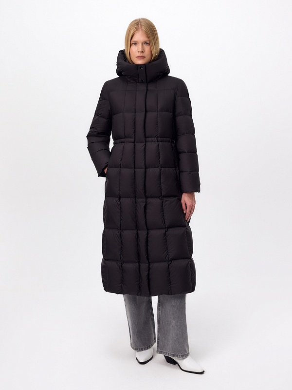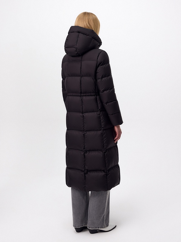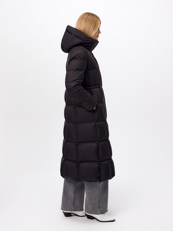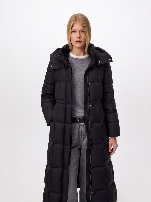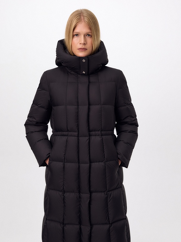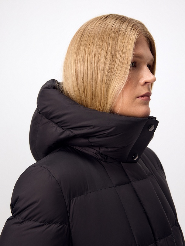 Длинное пальто полуприлегающего силуэта из плащевой ткани глубокого чёрного цвета. Пальто выполнено на натуральном утеплителе пух/перо. Высокий воротник-стойка надёжно защищает от ветра. Прилегание по линии талии обеспечивает дополнительное тепло, а расклешение по низу - ширину шага. По бокам расположены карманы с листочками. Глубокий капюшон при необходимости может быть отстёгнут.