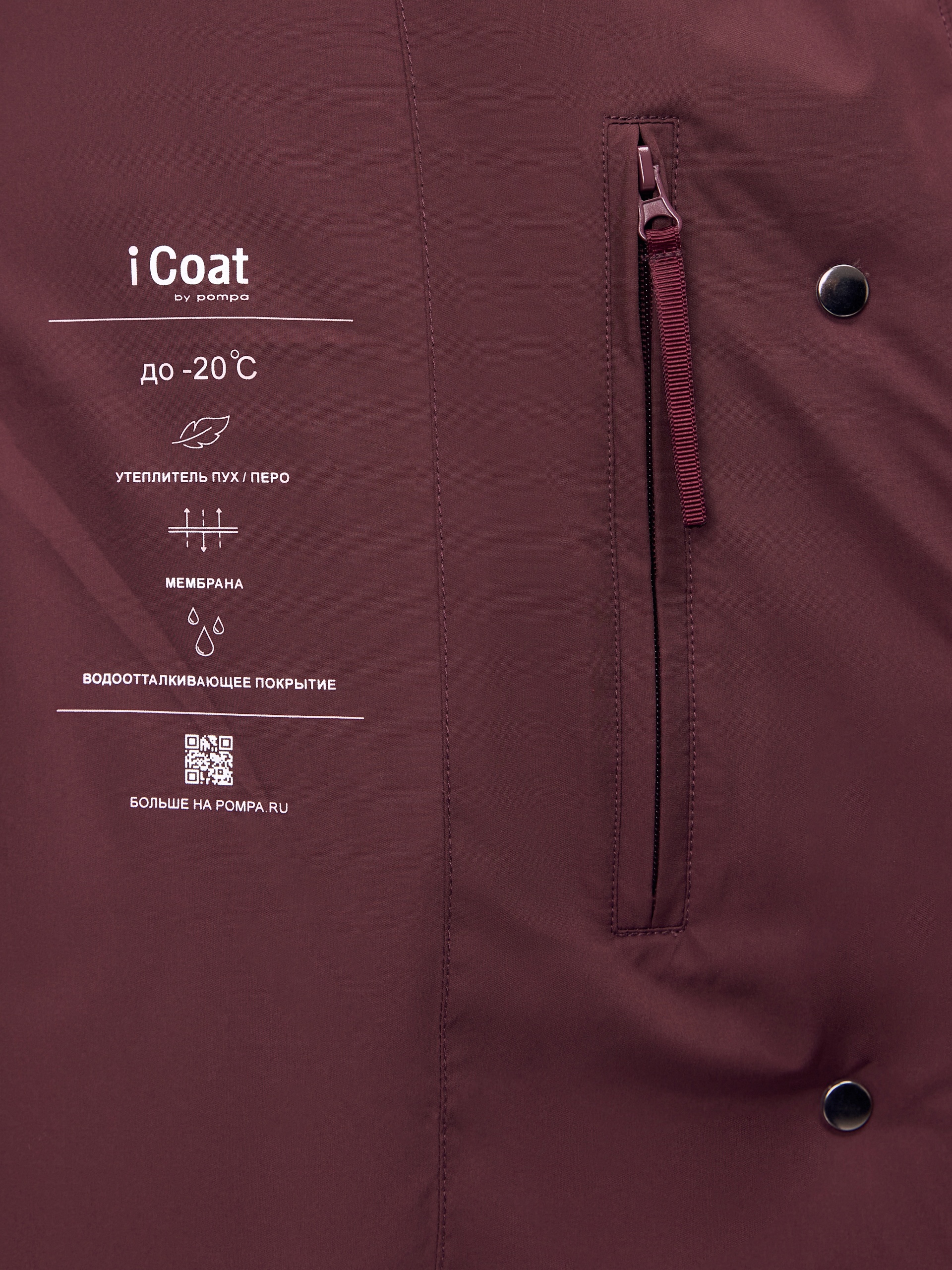 Утепленное пальто прямого силуэта из плащевой ткани в цвете вишневый мокко. Высокая горловина, переходящая в капюшон отлично сохраняют тепло. Длина пальто закрывает колено. Застегивается пальто на молнию и ряд установочных кнопок. По бокам два глубоких и функциональных кармана на молнии. По низу рукава резинка для наиболее плотного прилегания и защиты от холода.