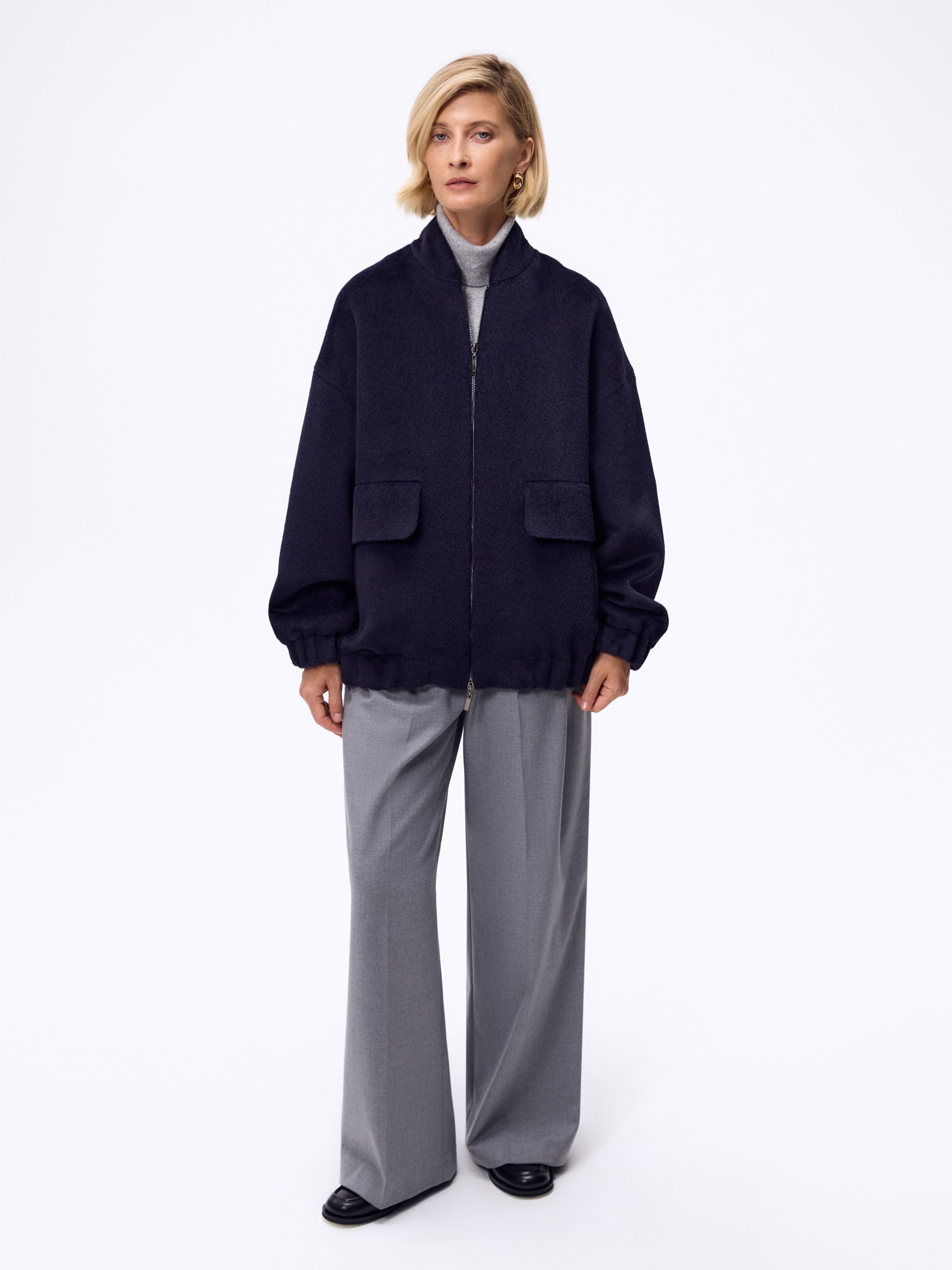 Лаконичная куртка-бомбер трендового черно-синего оттенка из лимитированной коллекции Pompa Premium, выполненная из премиальной ткани Альпака Бэби Сури. Свободный рубашечный рукав не стесняет движений. Низ рукава и низ изделия для наибольшего комфорта собраны на широкую резинку. Куртка имеет аккуратный воротник-стойку и вместительные карманы с широкими клапанами. Застежка на молнию. Изделие на подкладке. Произведено в Санкт-Петербурге....