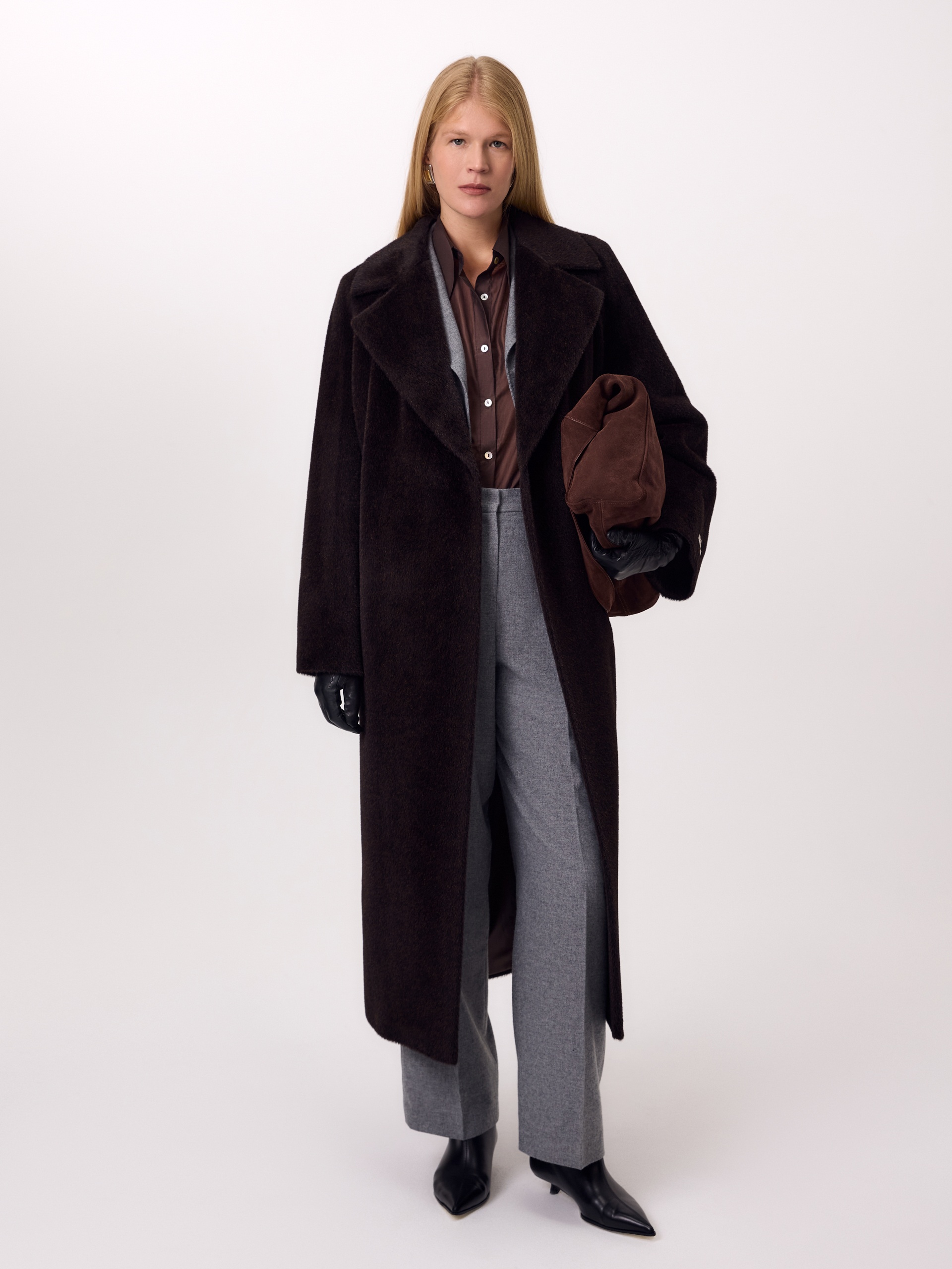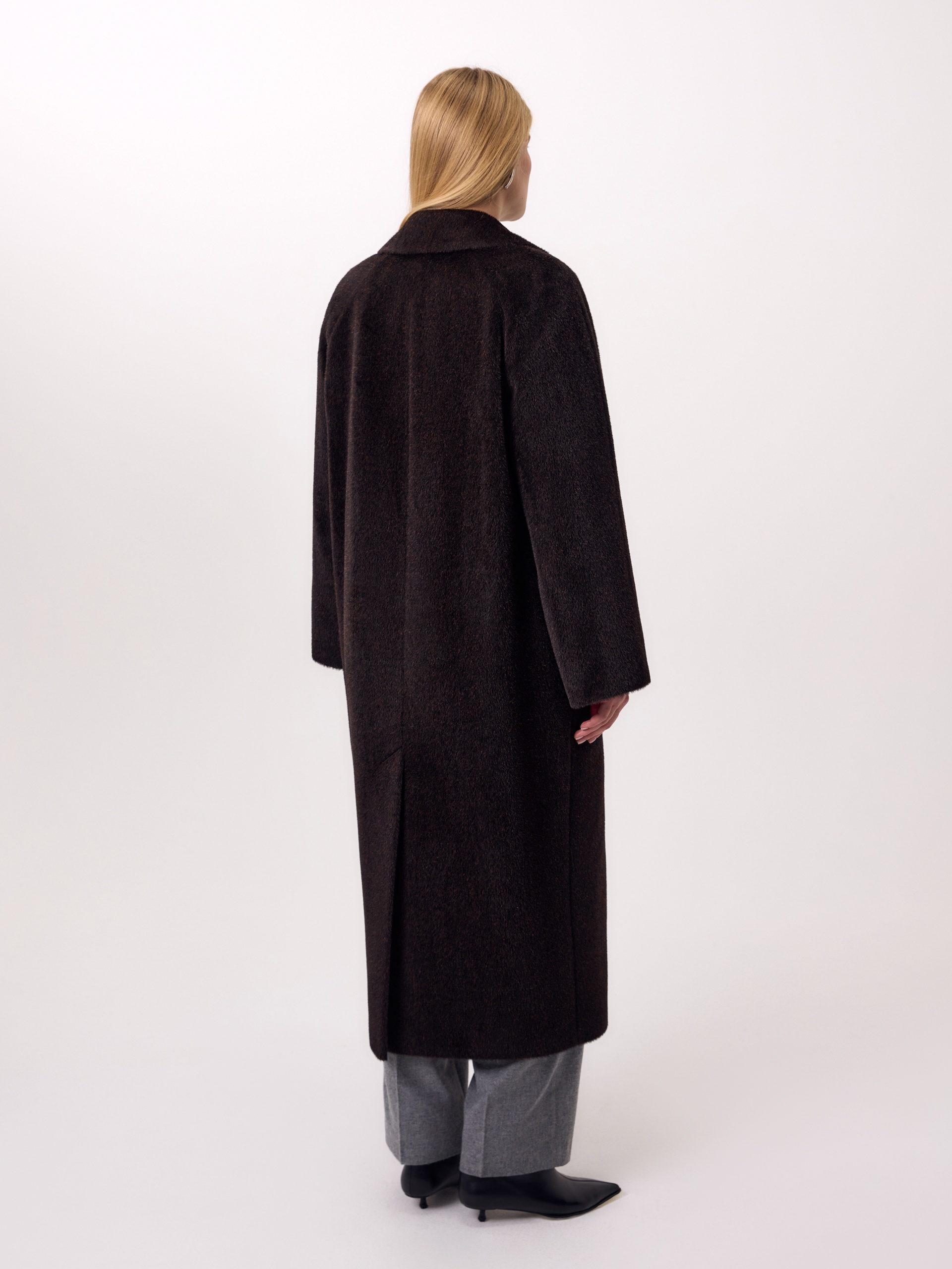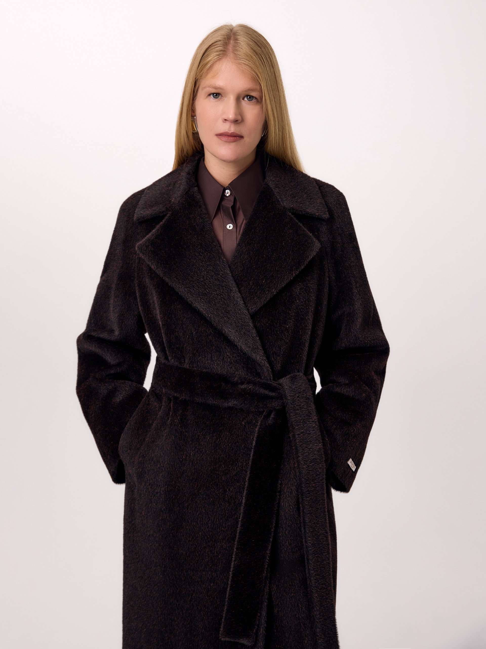 Роскошное двубортное пальто-халат из линейки Pompa Premium из премиальной шерстяной ткани Альпака Бэби Сури, выполненное в трендовом оттенке горький шоколад. Для этой модели была использована ткань высочайшего качества, сотканная из ценных волокон молодой альпаки Сури. Благодаря уникальным свойствам этой ткани сохранять тепло, такое пальто станет прекрасной альтернативой шубе. Модель имеет дополнительное утепление в верхней части спинки, что позволяет сохранять комфортную температуру. Пальто с широким английским воротником, рукавом реглан и карманами - врезные листочки. В комплекте предлагается пояс из основной ткани. Пальто изготовлено с использованием запатентованных технологий: высокотехнологичная мембрана RaftPro и утеплитель DuPont Sorona надежно защищают от ветра, холода и перепада температур. Произведено в Санкт-Петербурге.