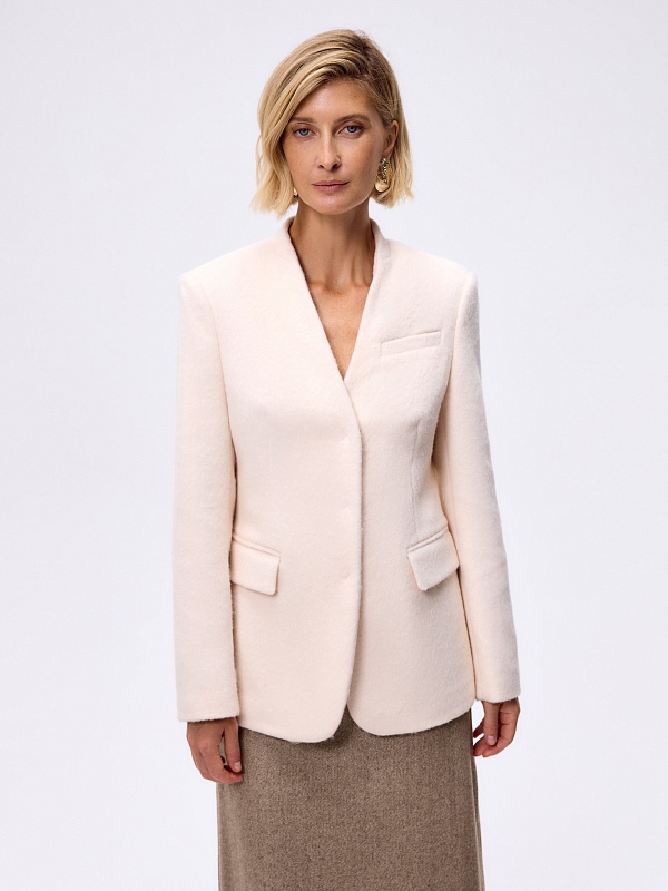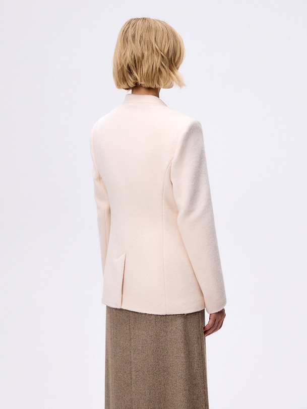 Полуприлегающий жакет из костюмной ткани с шерстью альпака, V-образным вырезом и потайными кнопками. Рукав втачной классический, на груди — имитация «листочки», прорезные карманы с клапанами, на спинке шлица. Цельнокроеный.