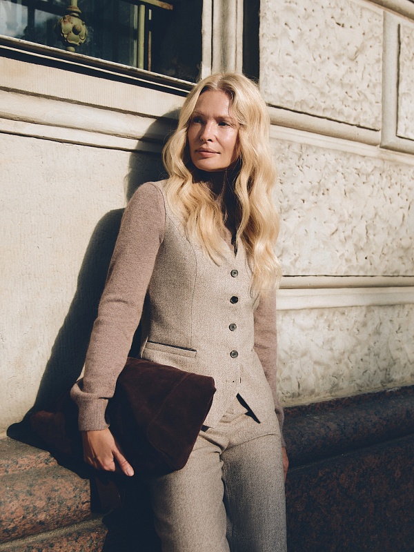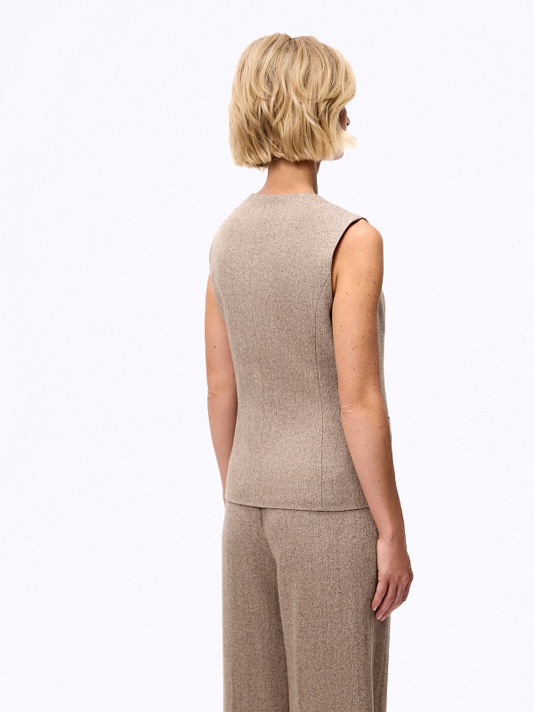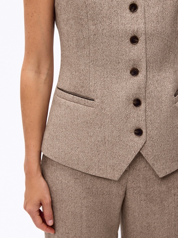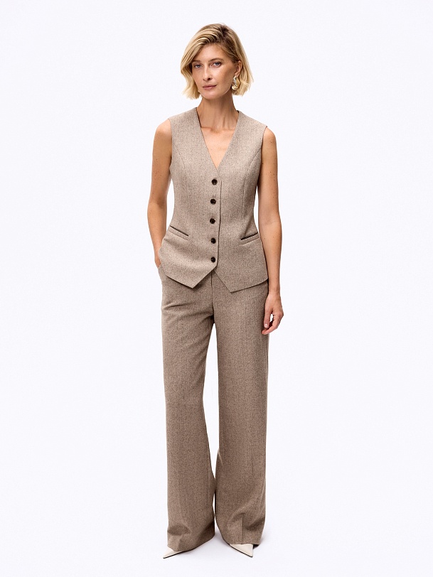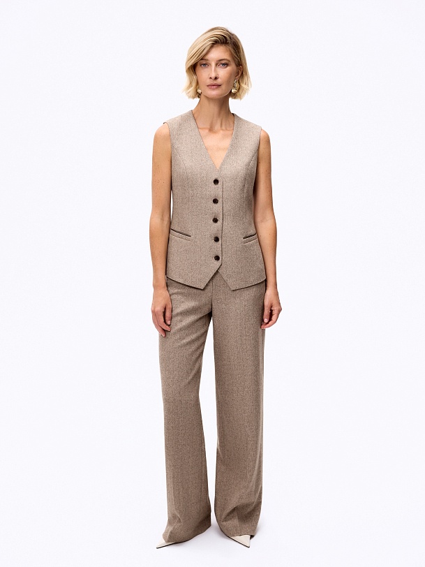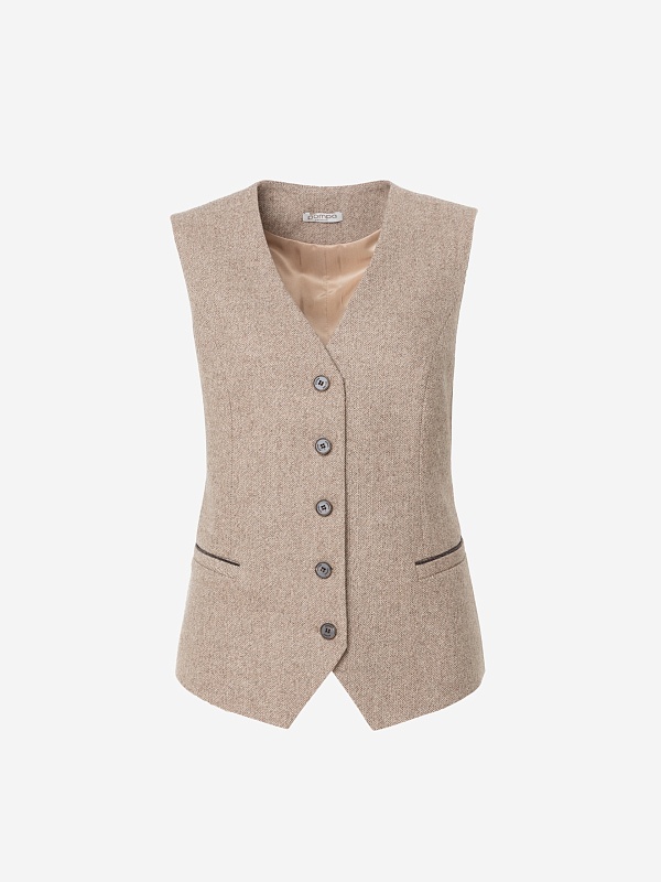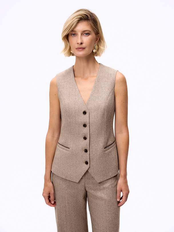 Классический приталенный жилет с V-образным вырезом на пуговицах составит идеальную пару с жакетом и брюками из одной ткани. На карманы добавлена декоративная тесьма мониль.