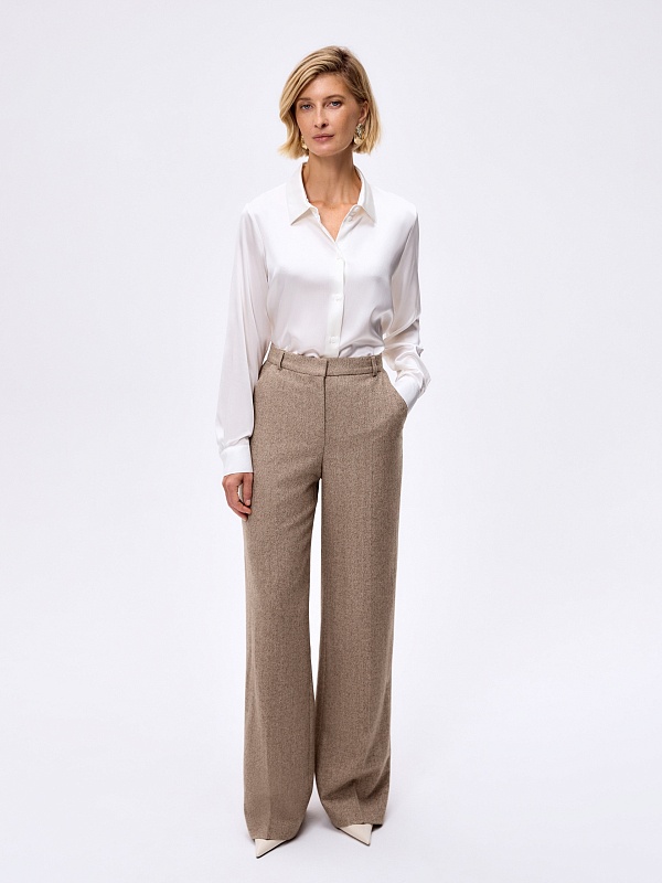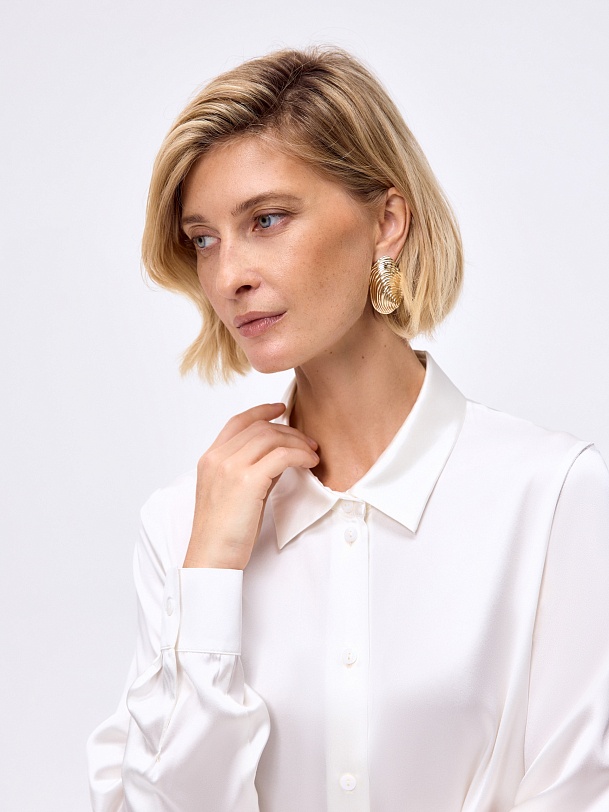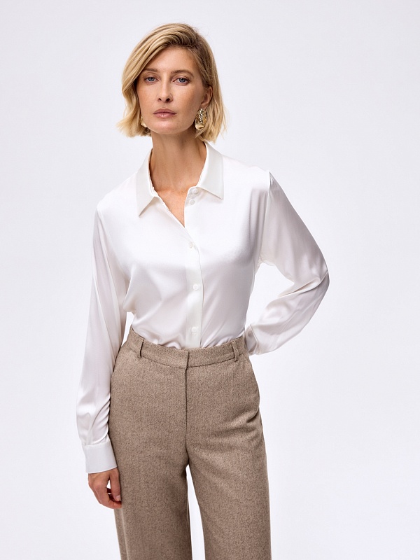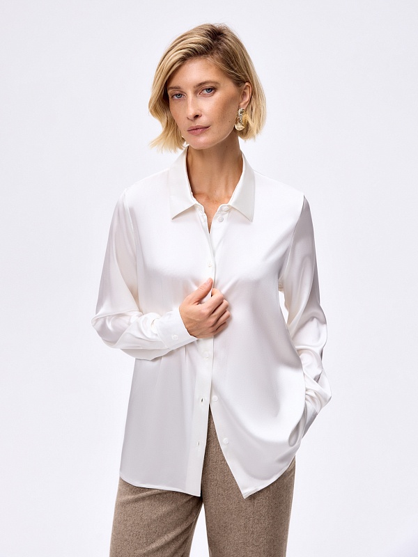 Блуза полуприлегающего силуэта из молочного шелка с пуговицами на планке и отложным воротником, рукав втачной на манжете. Спинка длиннее полочек и круглый низ.