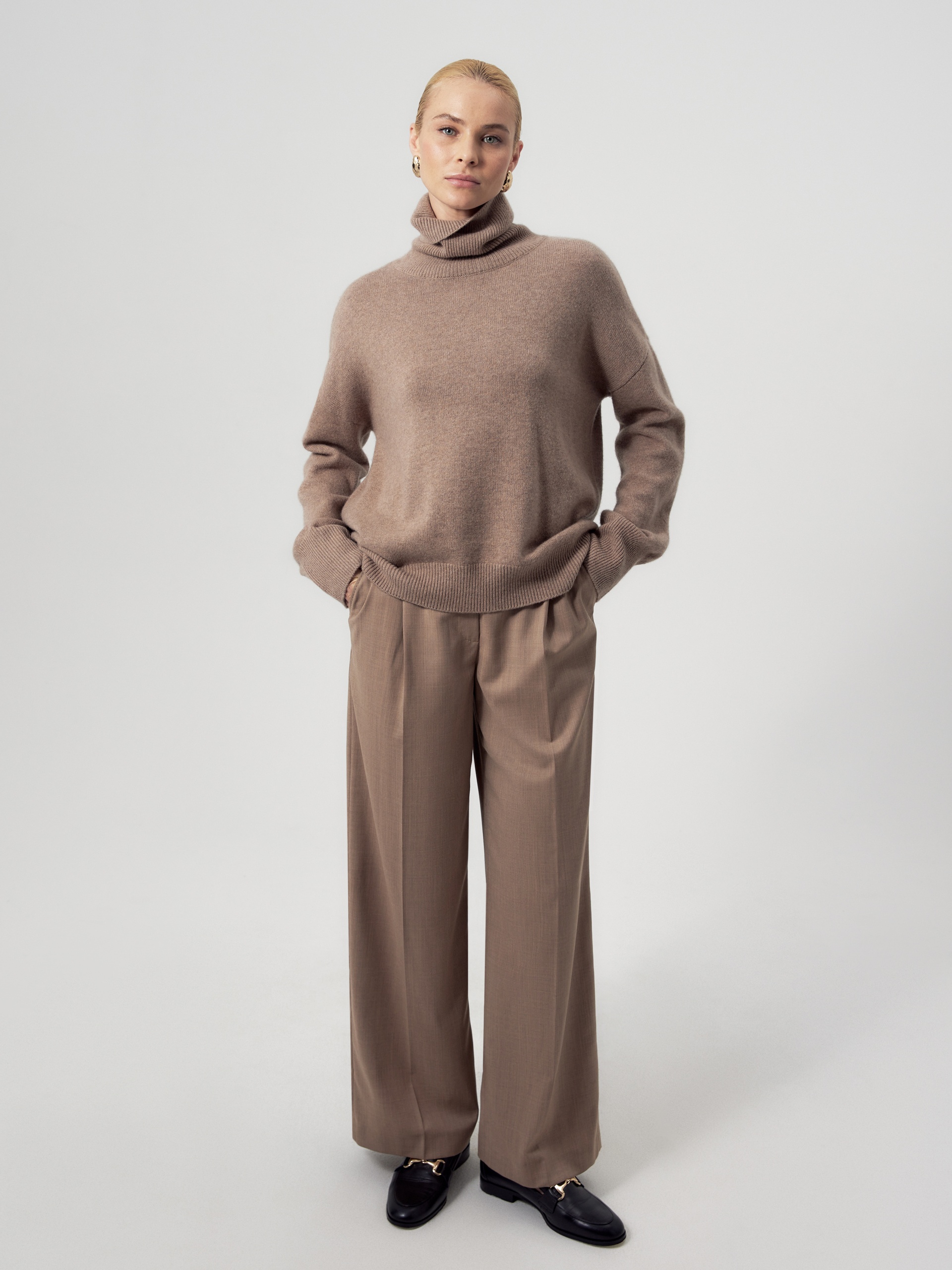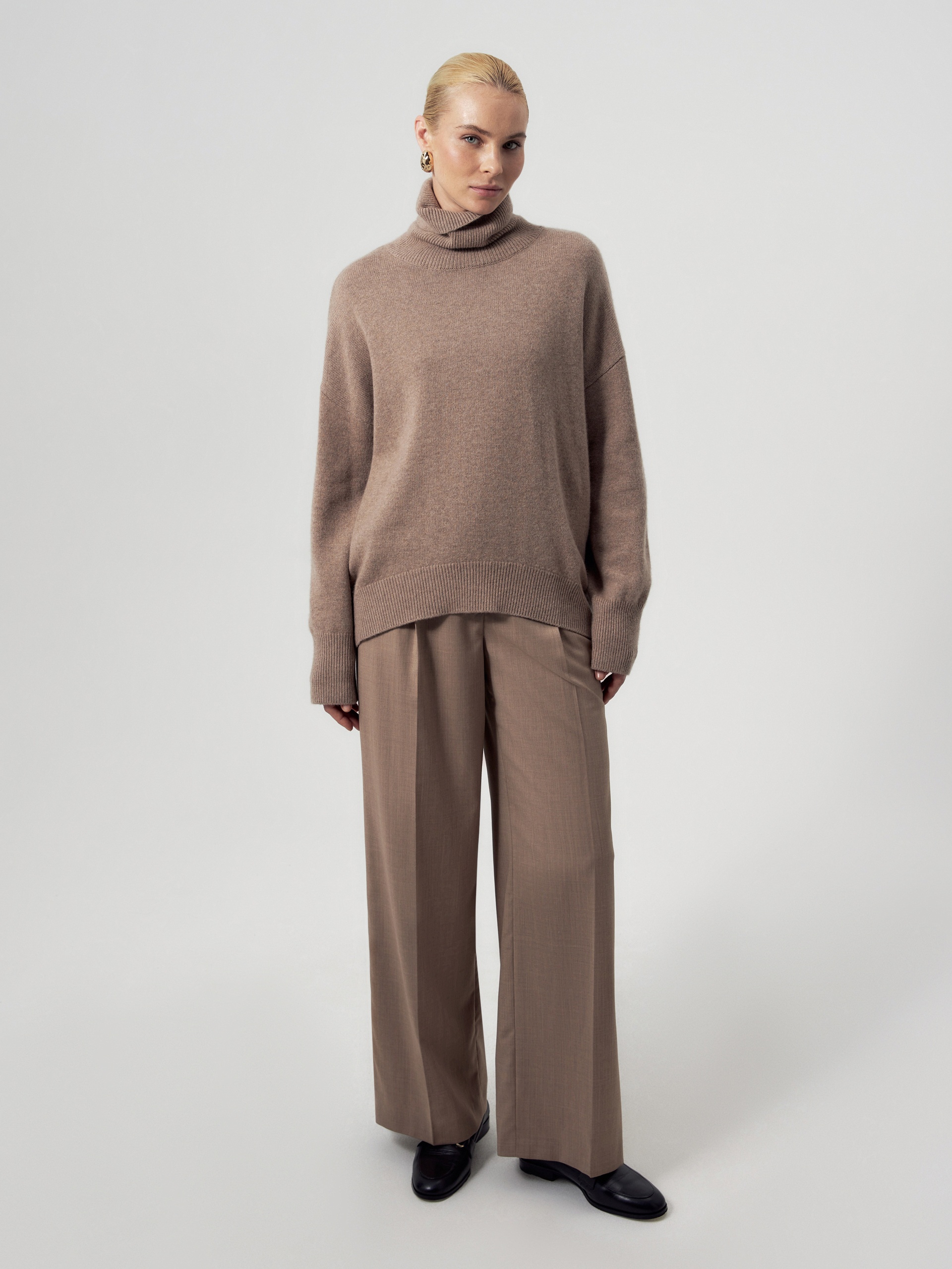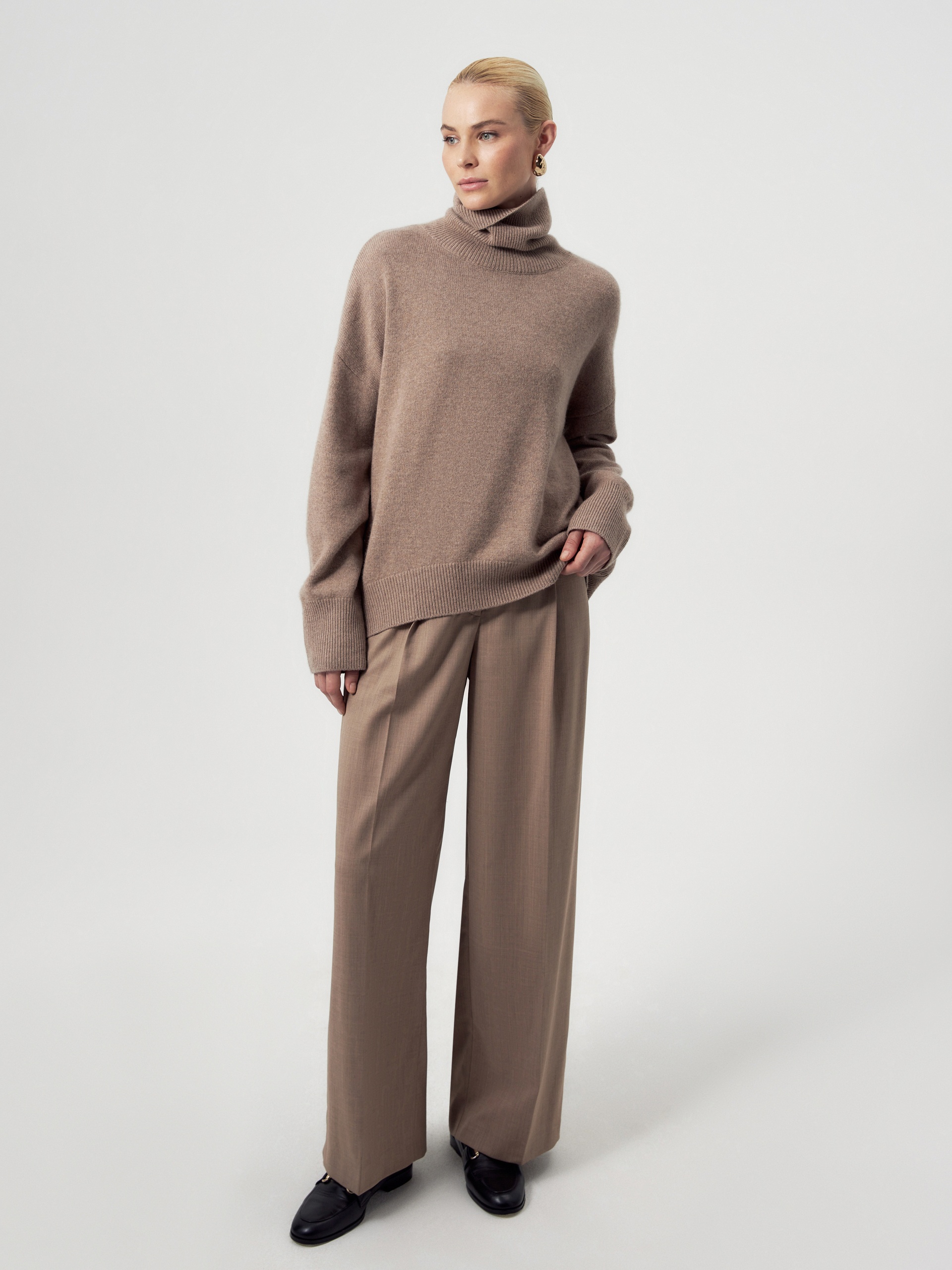 Объемный свитер прямого силуэта из лимитированной линейки POMPA Premium, выполнен из 100% нежнейшего кашемира. Свитер связан гладью, имеет воротник-стойку, спущенный втачной рукав на резинке-манжете и удлиненную сзади линию низа изделия, что особенно важно в холода. Благодаря объемному крою, свитер идеально садится по фигуре и станет незаменимым элементом гардероба, позволяя создавать стильные и уютные образы на каждый день