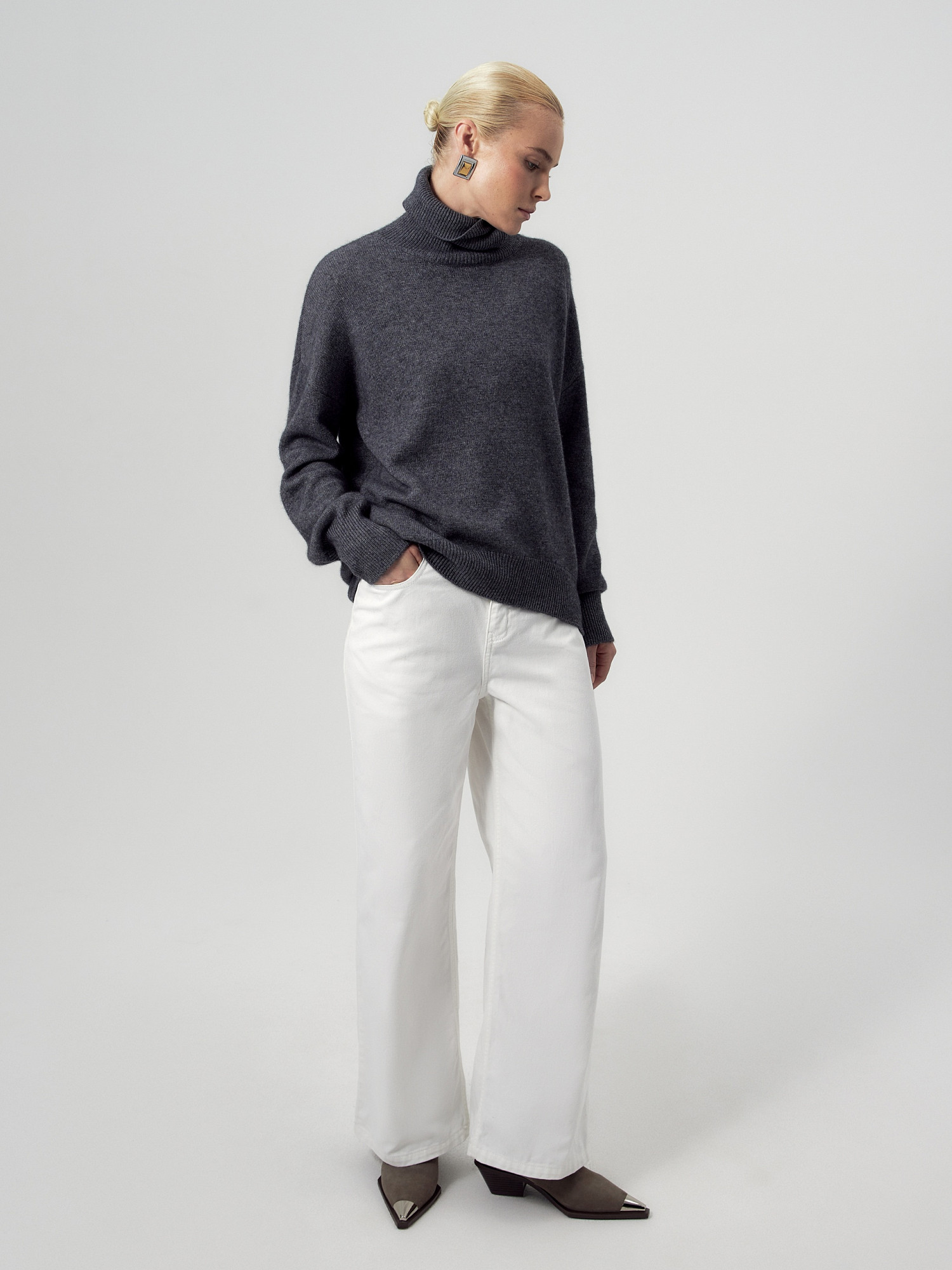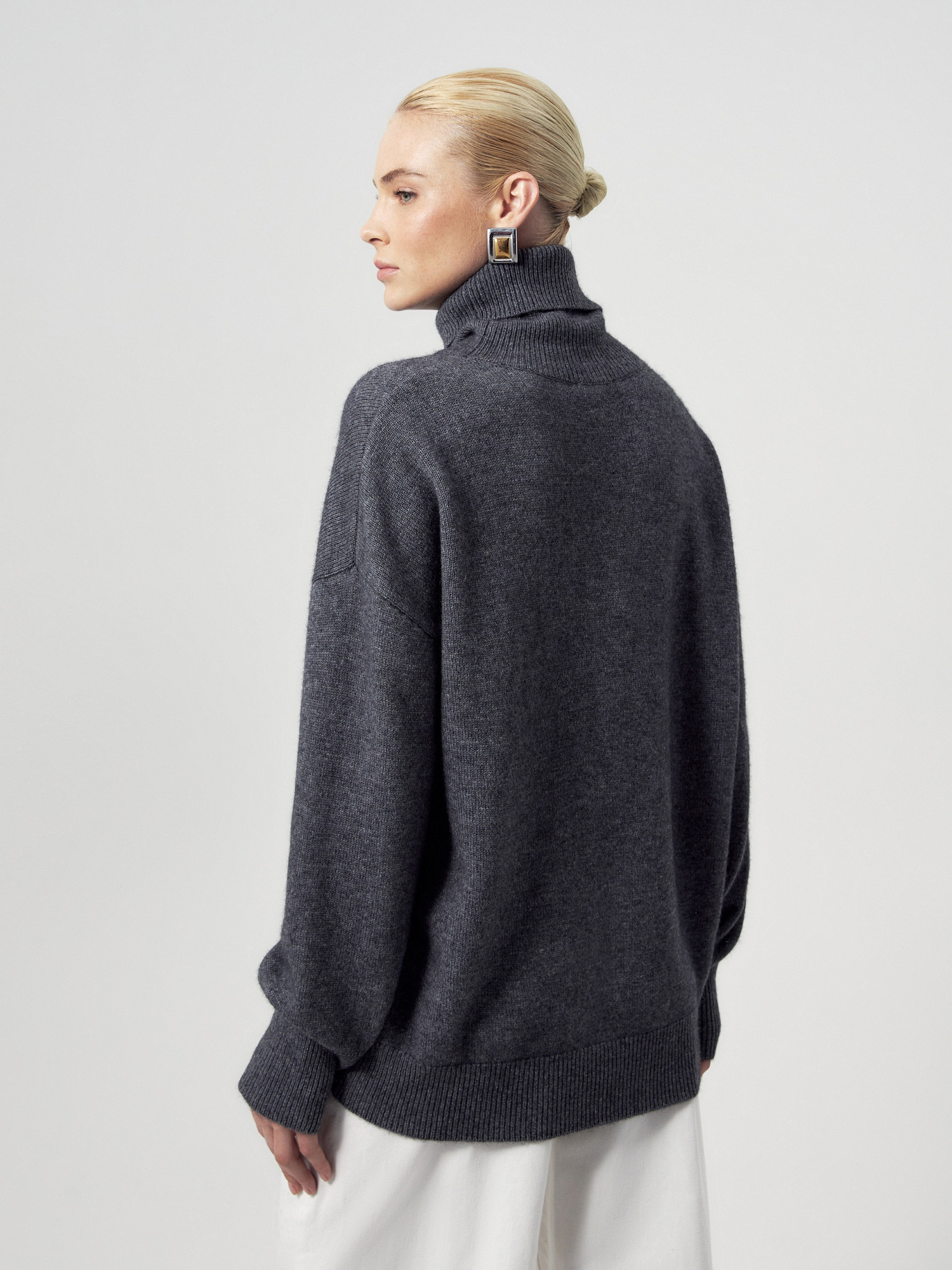 Объемный свитер прямого силуэта из лимитированной линейки POMPA Premium, выполнен из 100% нежнейшего кашемира. Свитер связан гладью, имеет воротник-стойку, спущенный втачной рукав на резинке-манжете и удлиненную сзади линию низа изделия, что особенно важно в холода. Благодаря объемному крою, свитер идеально садится по фигуре и станет незаменимым элементом гардероба, позволяя создавать стильные и уютные образы на каждый день