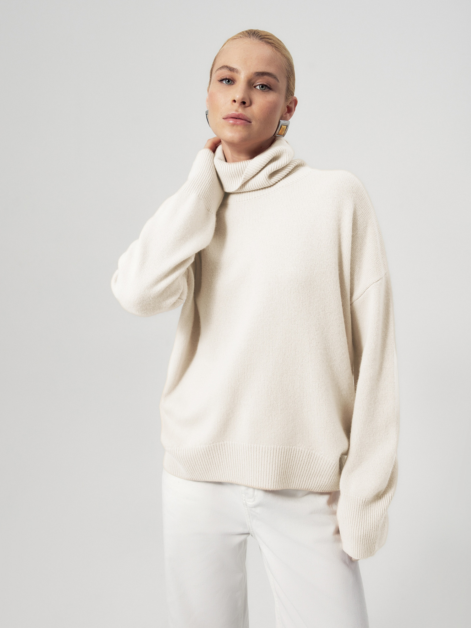 Объемный свитер прямого силуэта из лимитированной линейки POMPA Premium, выполнен из 100% нежнейшего кашемира. Свитер связан гладью, имеет воротник-стойку, спущенный втачной рукав на резинке-манжете и удлиненную сзади линию низа изделия, что особенно важно в холода. Благодаря объемному крою, свитер идеально садится по фигуре и станет незаменимым элементом гардероба, позволяя создавать стильные и уютные образы на каждый день