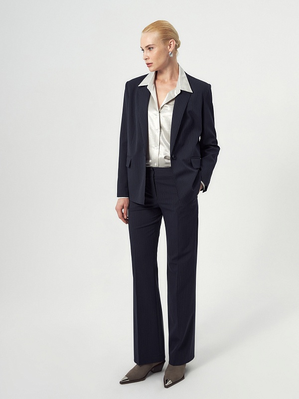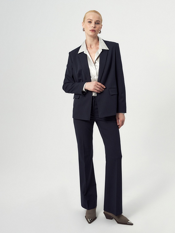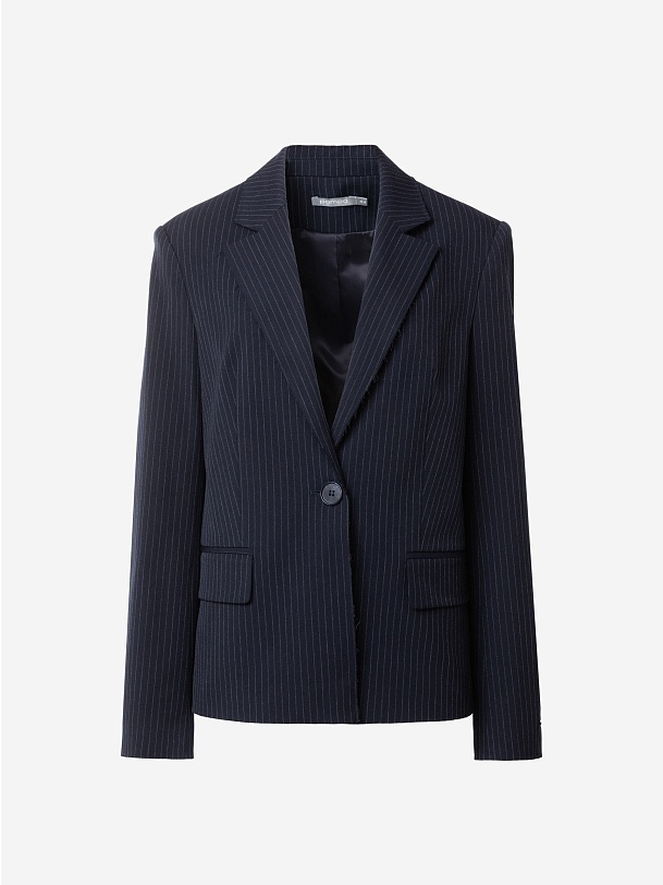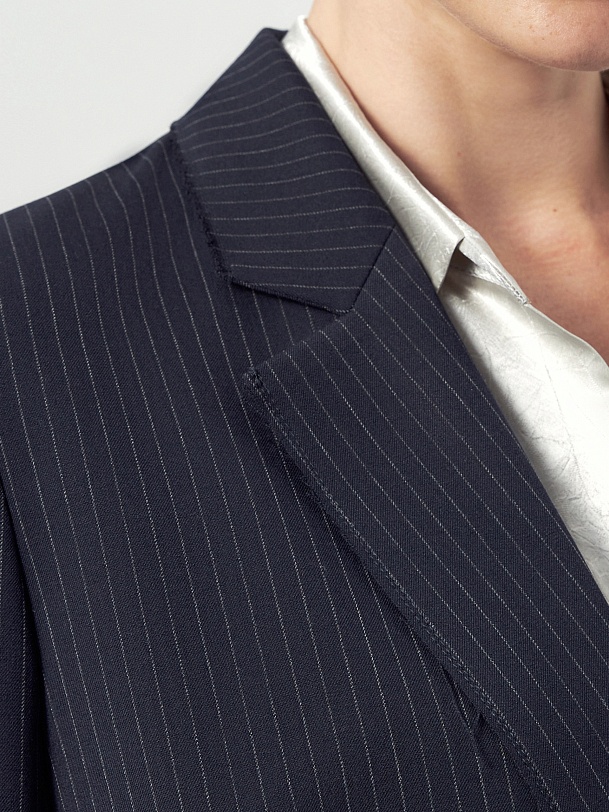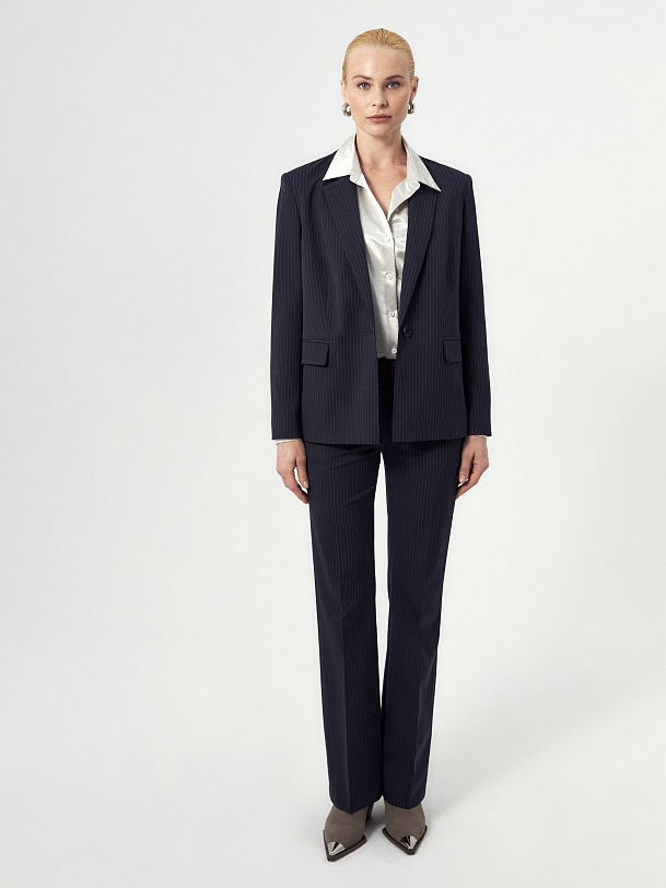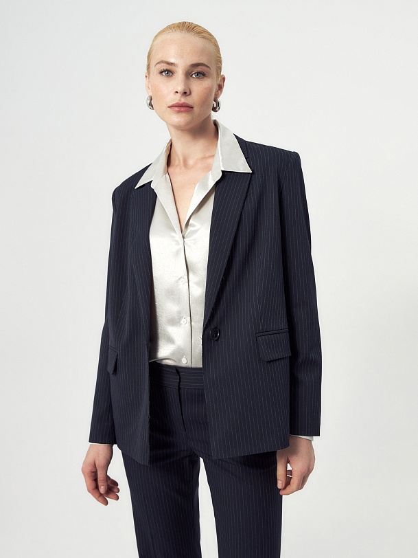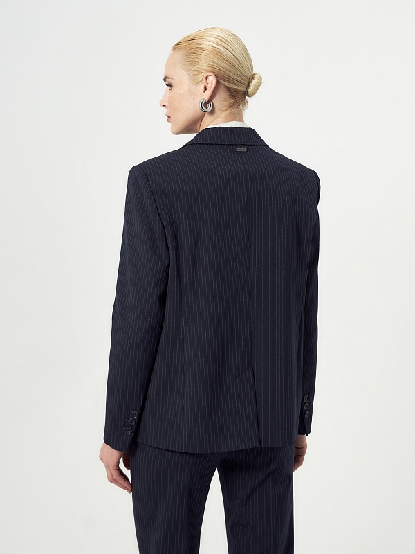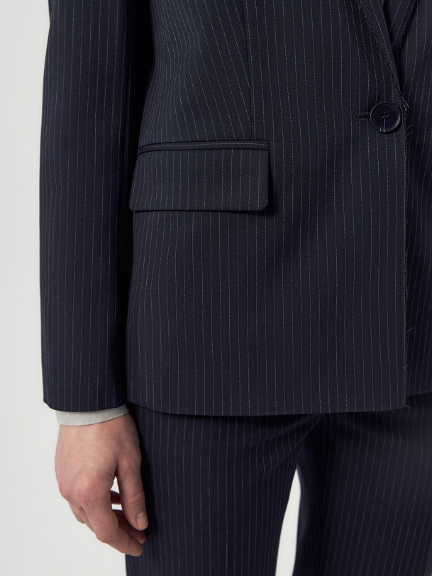 Прямой однобортный жакет из костюмной ткани темно-синего цвета с тонкой серой полоской. Классический английский воротник с открытым срезом, V-образная форма горловины. Рукав втачной полной длины. На полочке прорезные карманы с клапанами, на спинке шлица. Жакет на подкладке.
