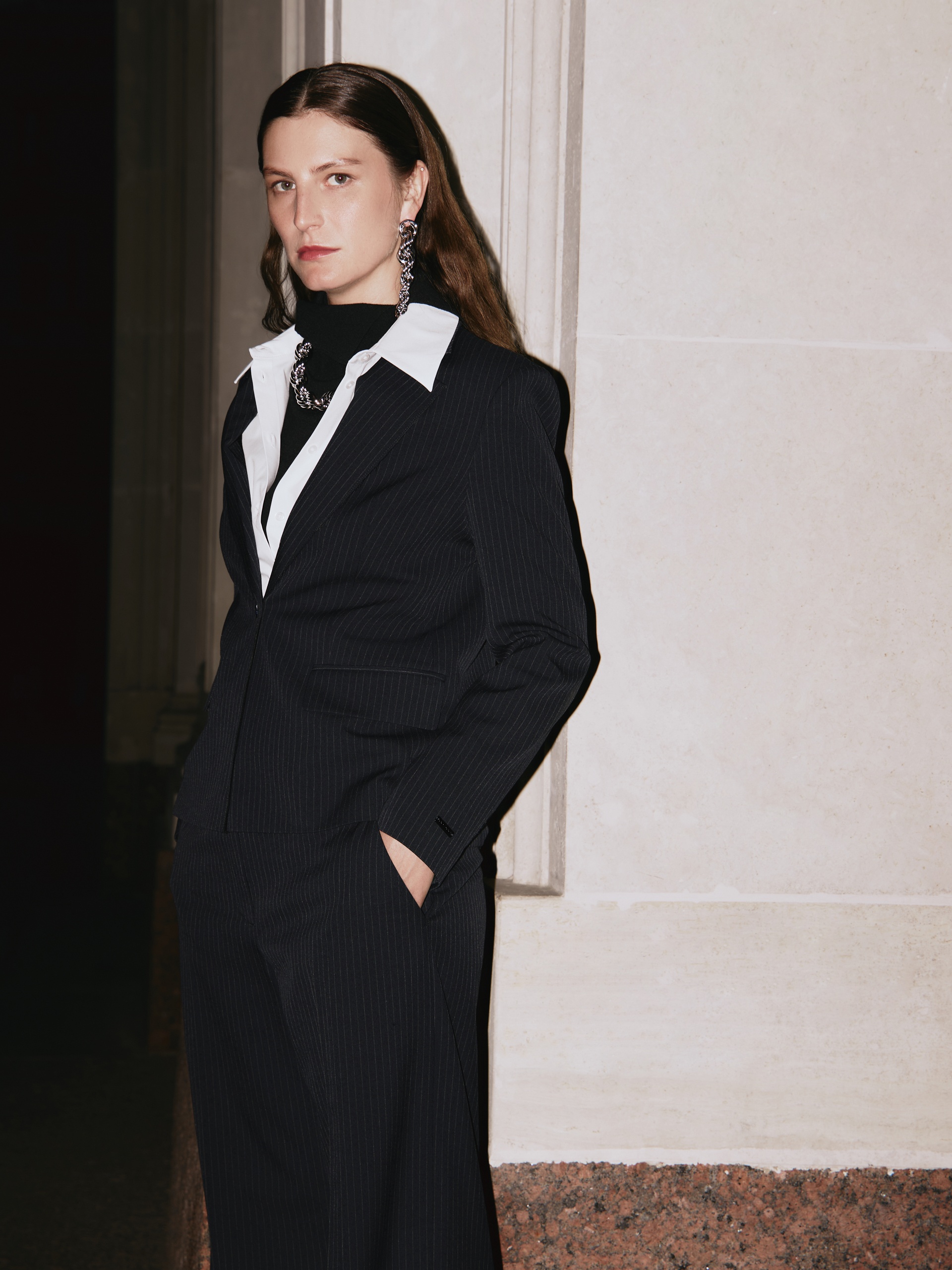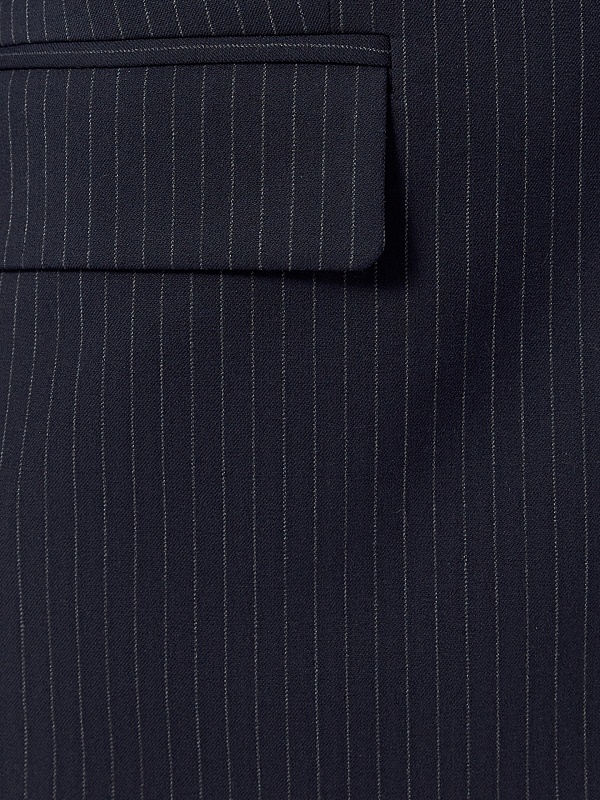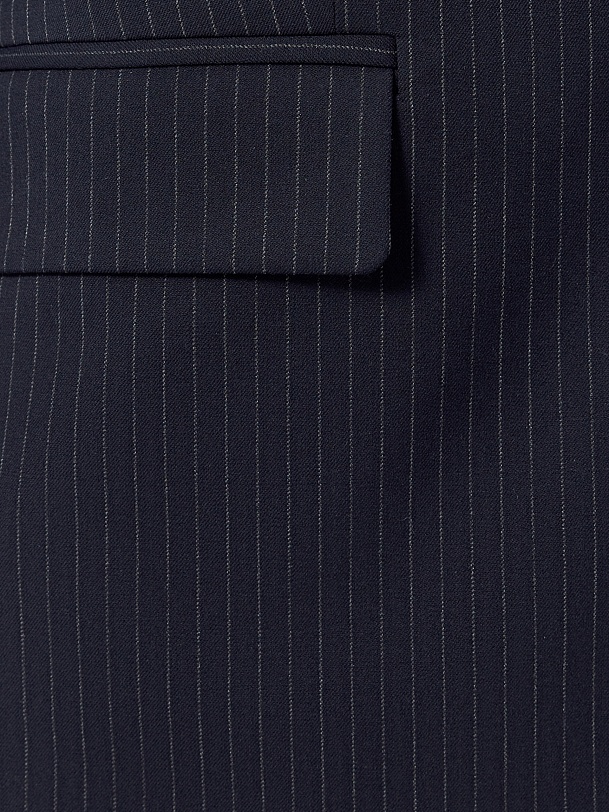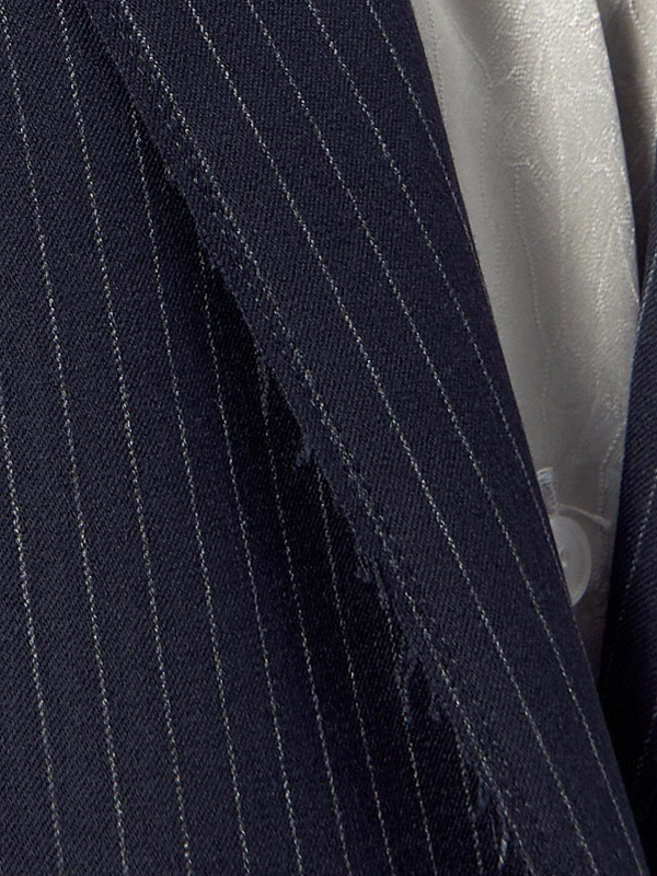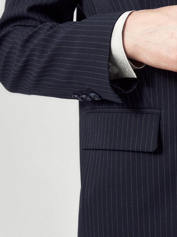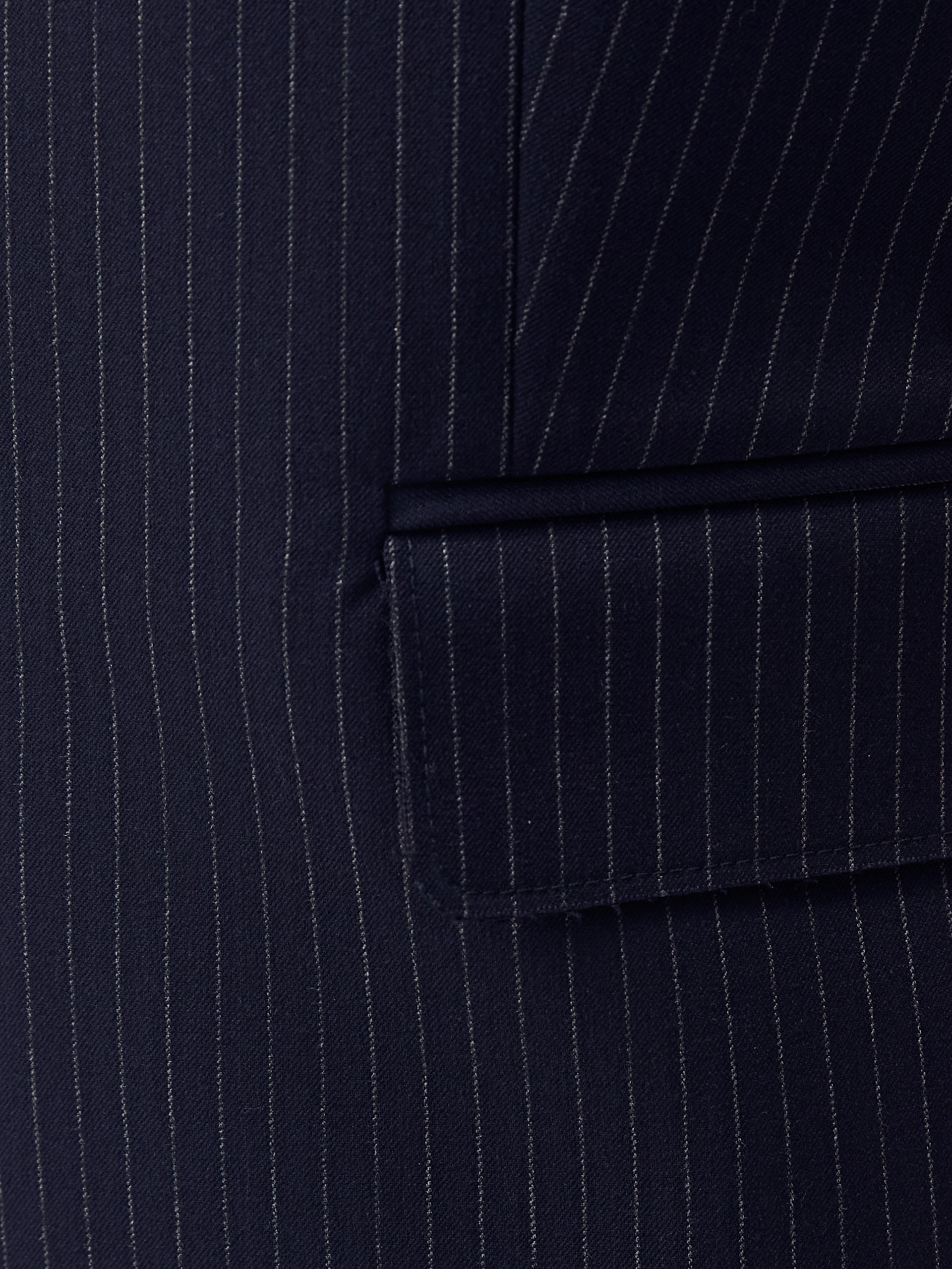Прямой однобортный жакет из костюмной ткани темно-синего цвета с тонкой серой полоской. Классический английский воротник с открытым срезом, V-образная форма горловины. Рукав втачной полной длины. На полочке прорезные карманы с клапанами, на спинке шлица. Жакет на подкладке.
