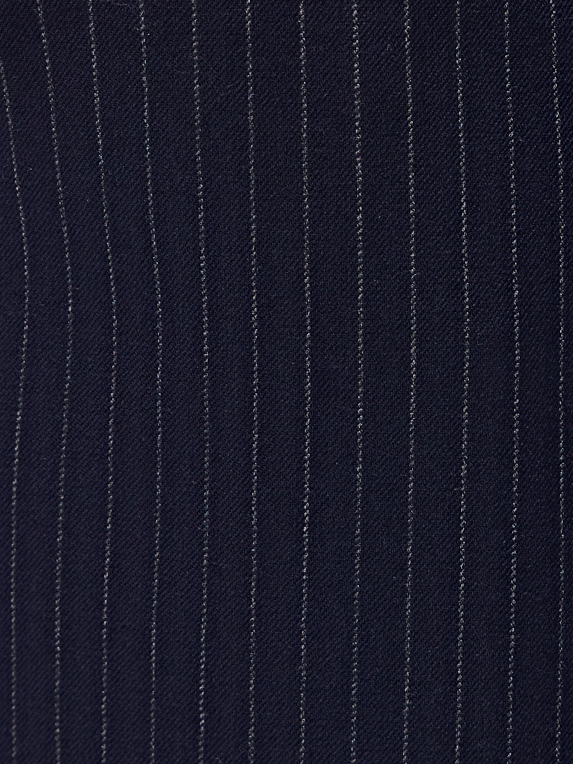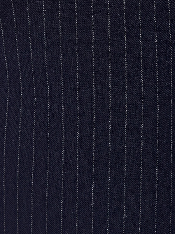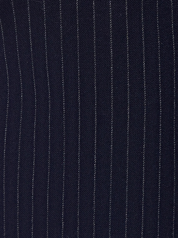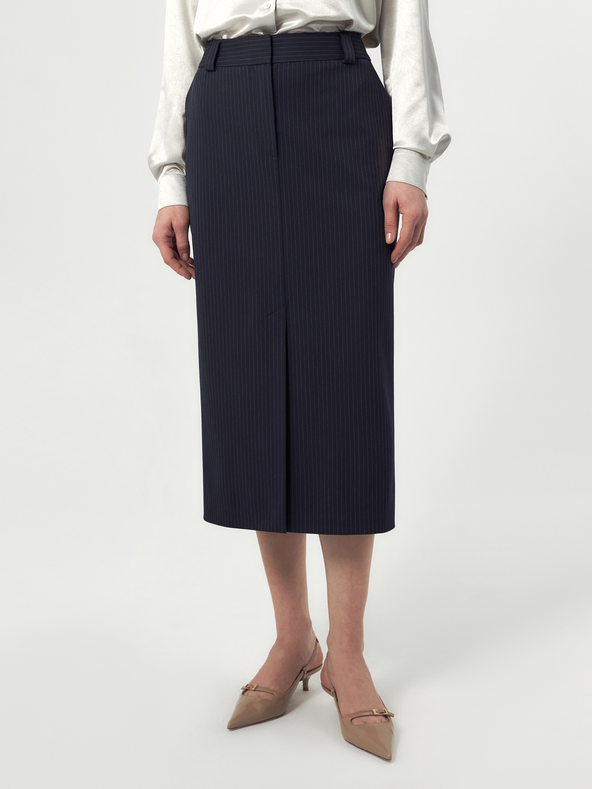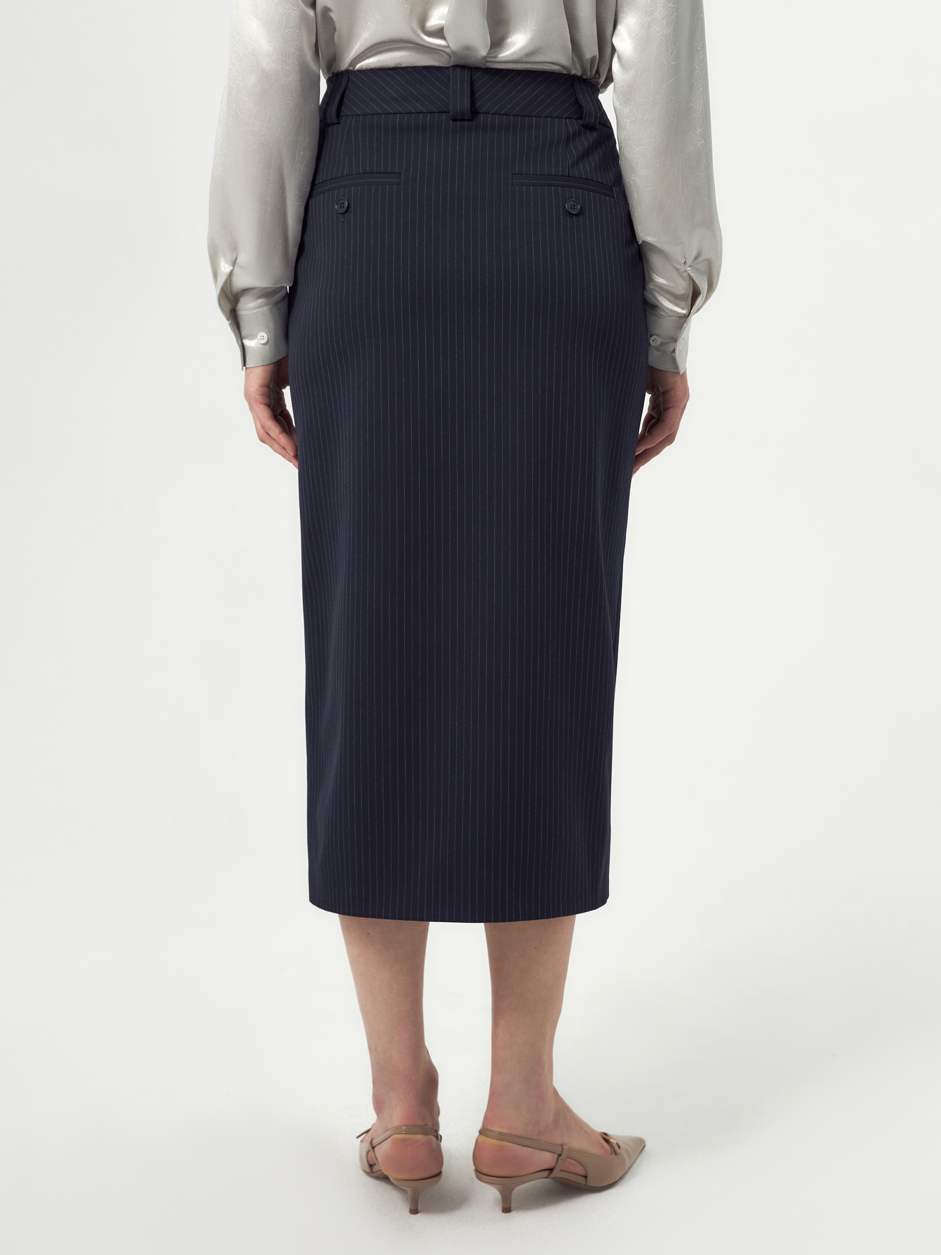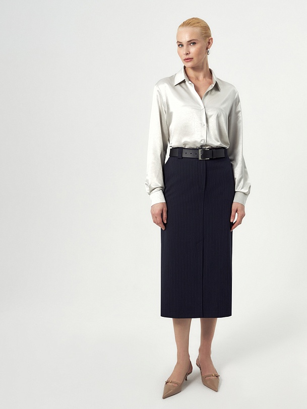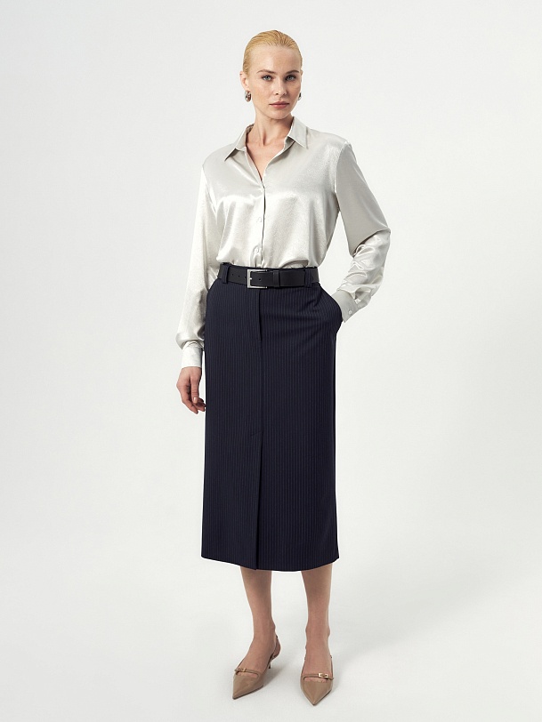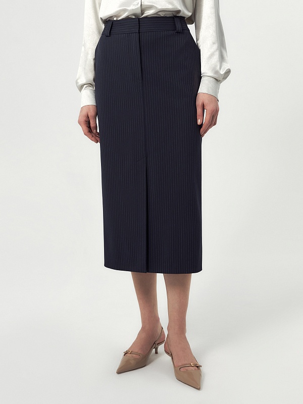 Прямая юбка миди немного зауженная к низу из костюмной ткани темно-синего цвета с тонкой серой полоской на прямом поясе с гульфиком и пуговицей по переду, верхний срез пояса открытый. Имеет два функциональных кармана по бокам и два прорезных кармана сзади. На полочке высокая шлица. Составит идеальный комплект с жакетом из одной ткани.