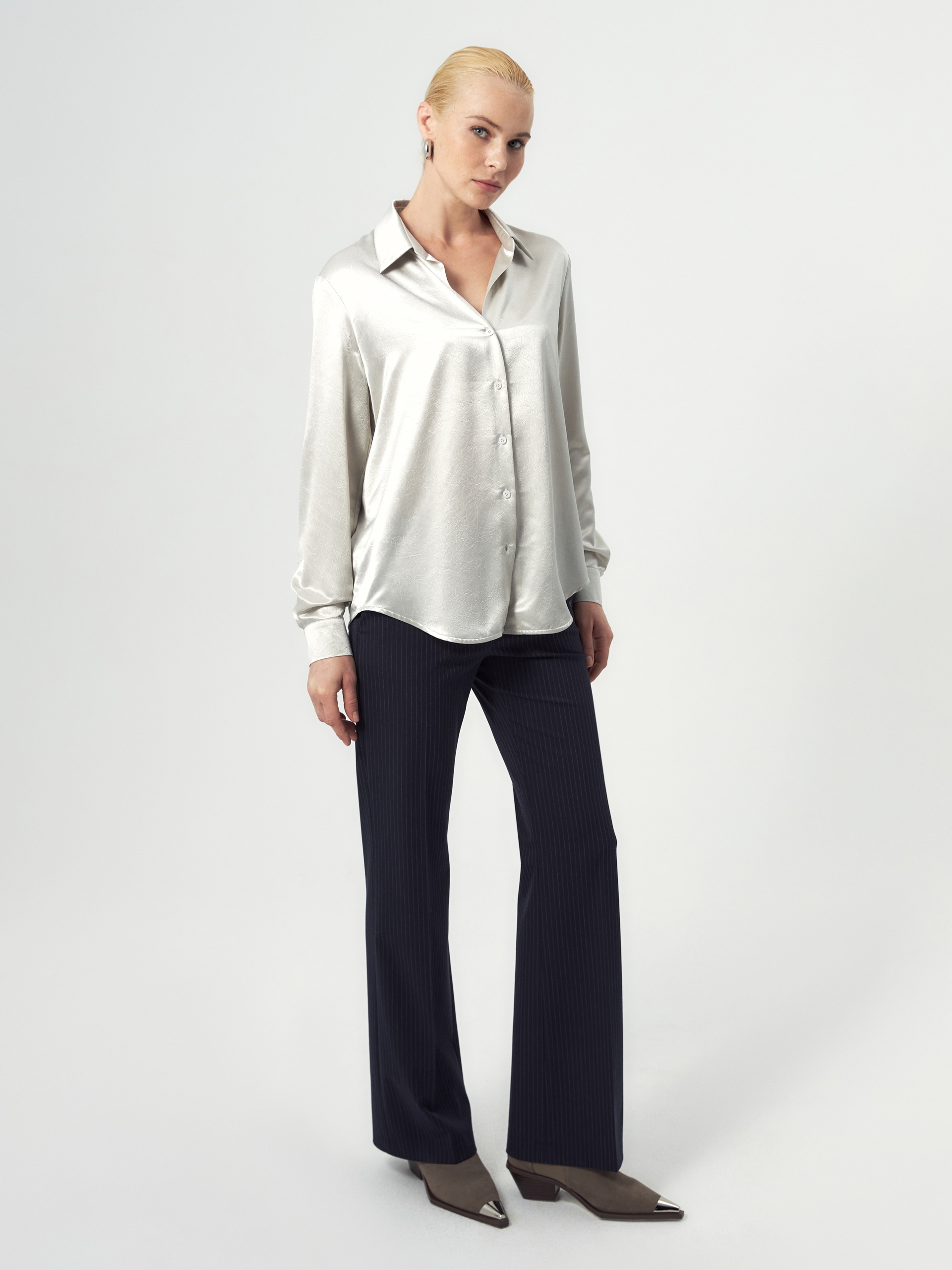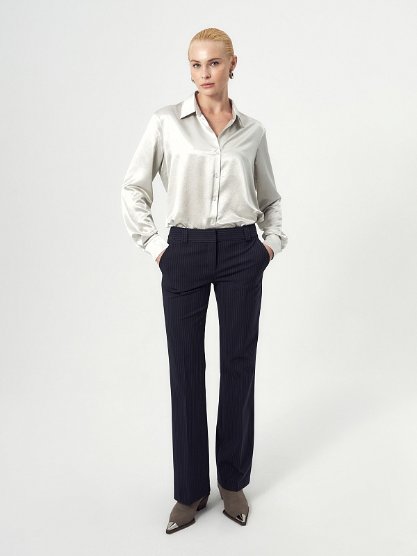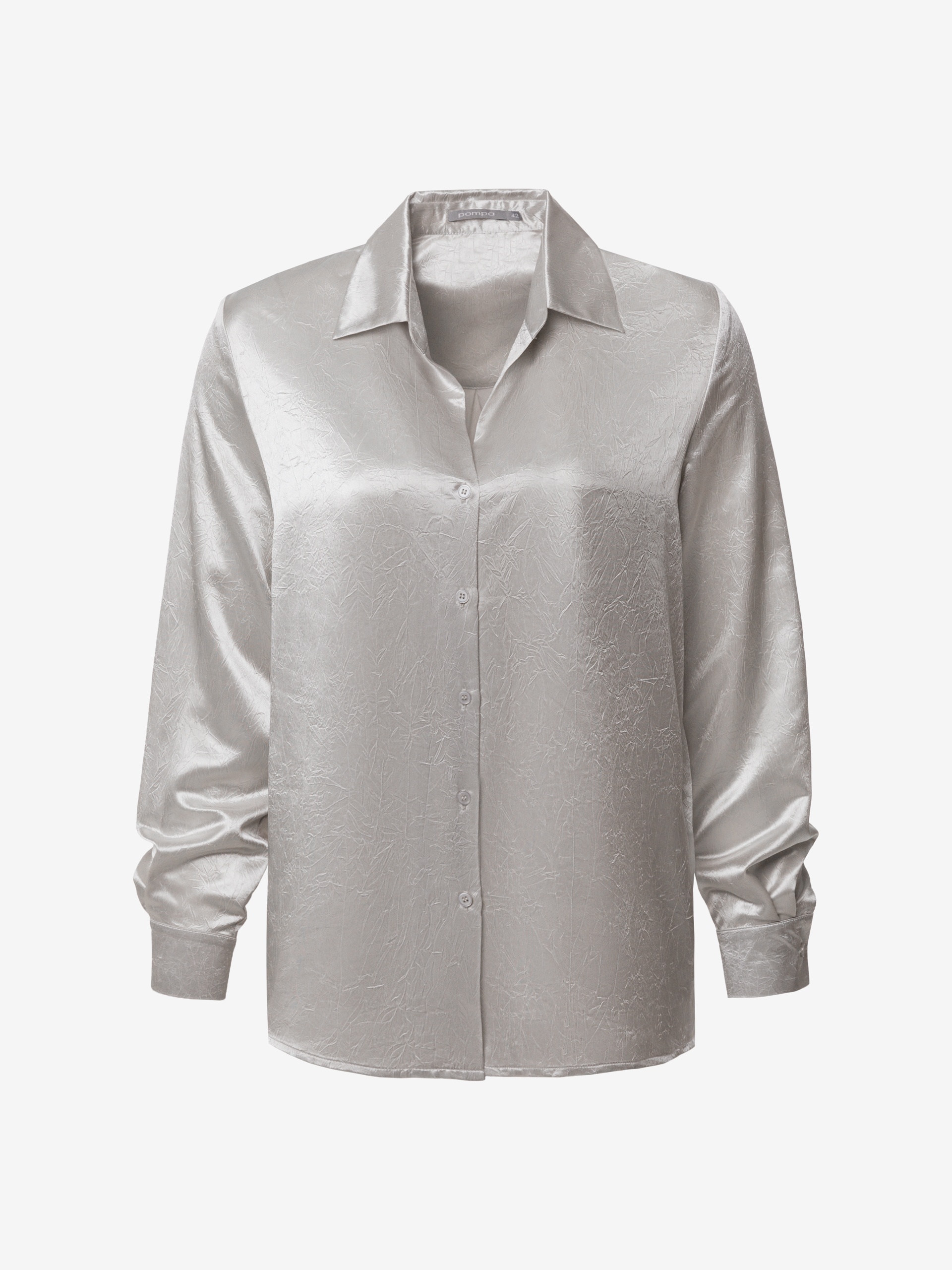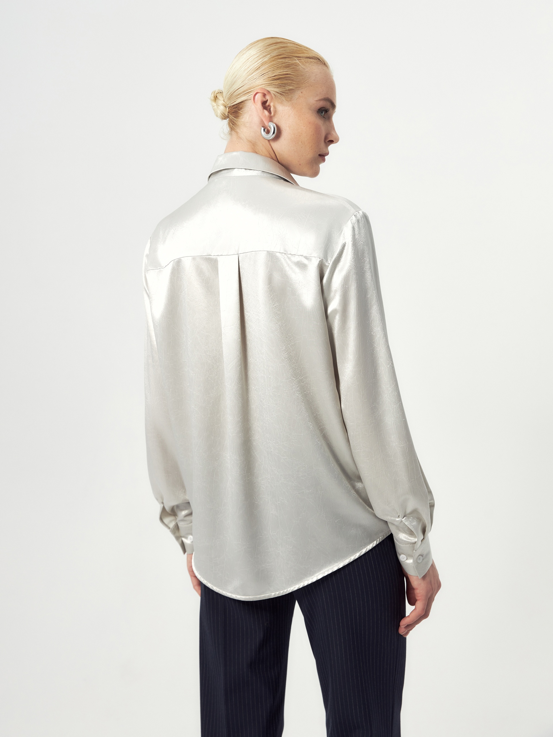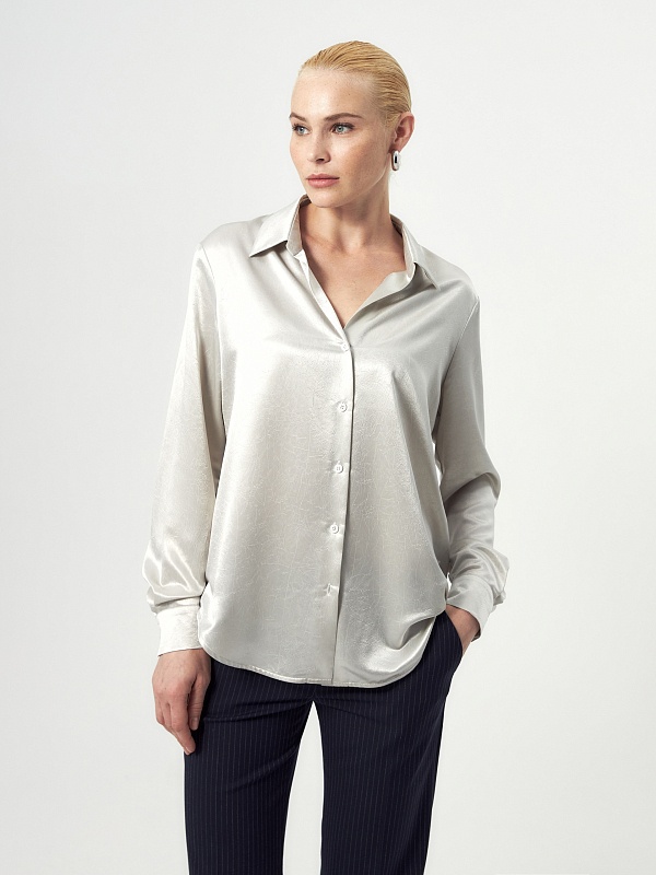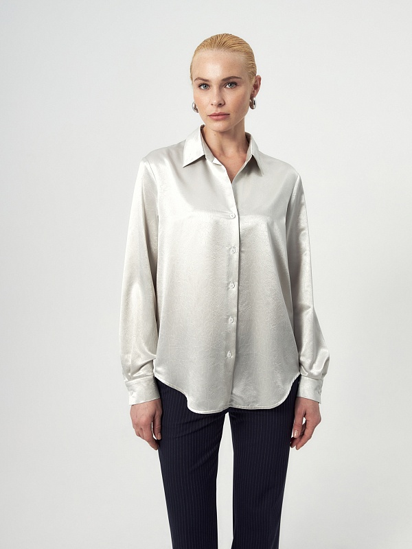 Блуза полуприлегающего силуэта из жаккардовой атласной ткани с пуговицами на планке и отложным воротником, рукав втачной на манжете. Спинка длиннее полочек и круглый низ.