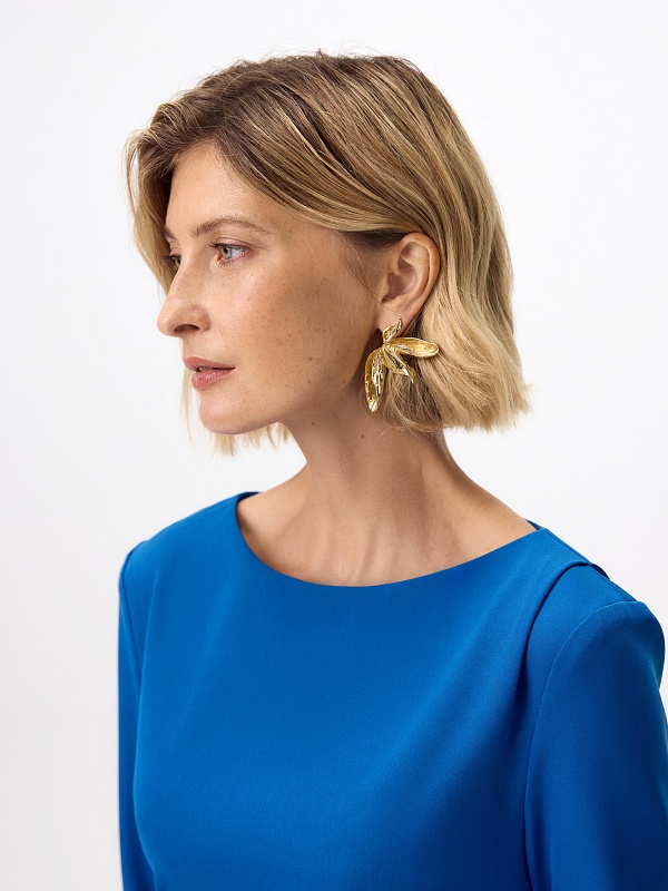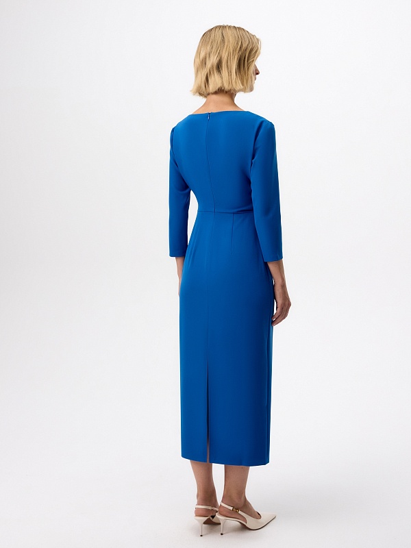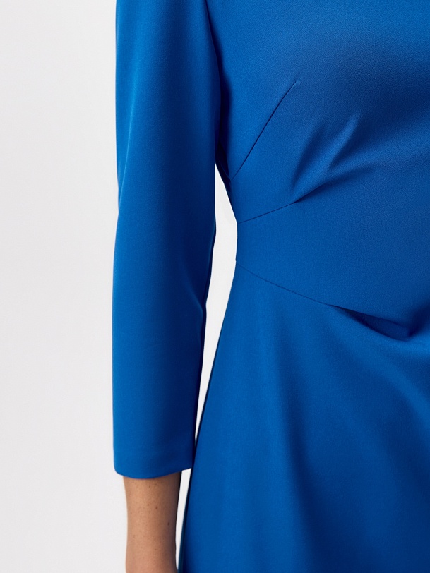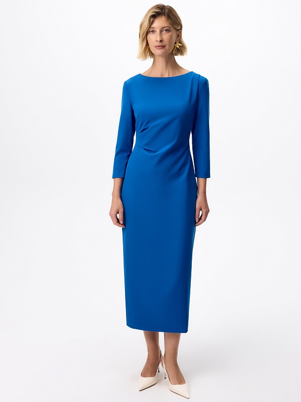 Прилегающие платье миди из ярко синей костюмной ткани с горловиной лодочкой и классическим втачным рукавом. На талии складки, и потайная молния в боковом шве.