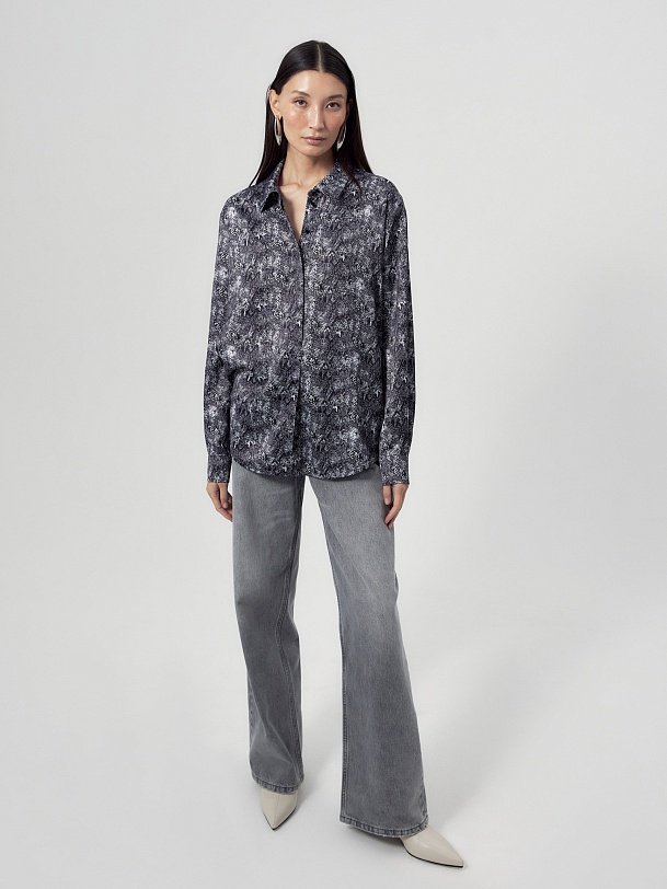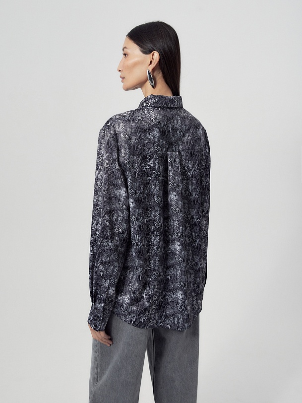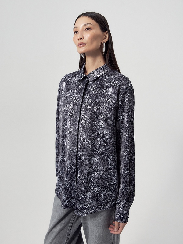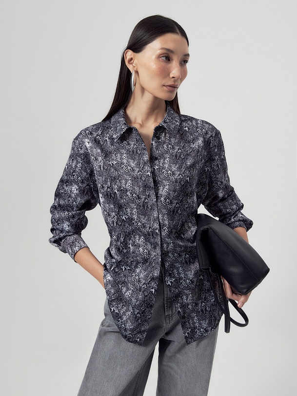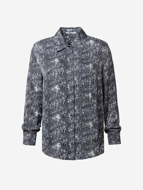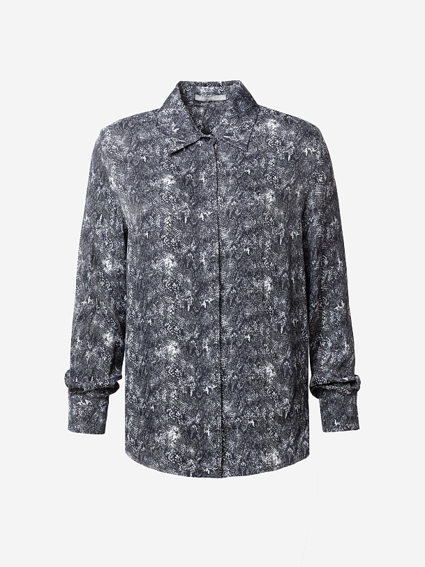 Прямая блуза из атласной ткани с принтом «змея», классическим отложным воротником и потайной планкой с пуговицами, рукав втачной, со спущенной линией плеча на манжете. На спинке кокетка с бантовой складкой.
