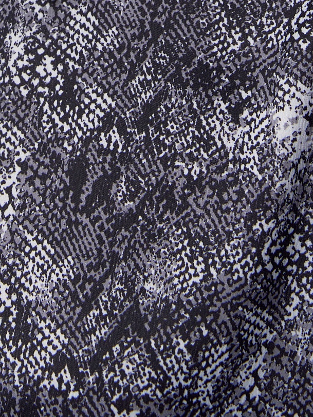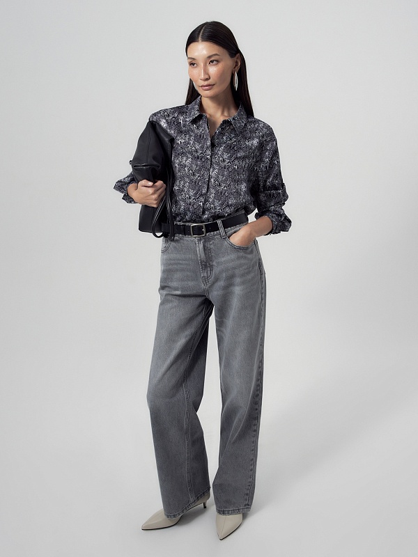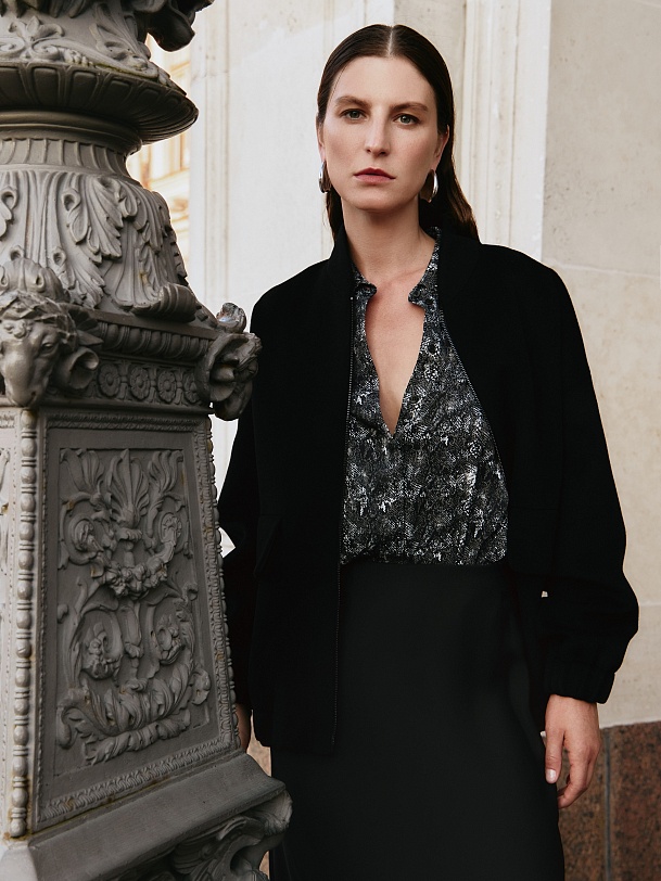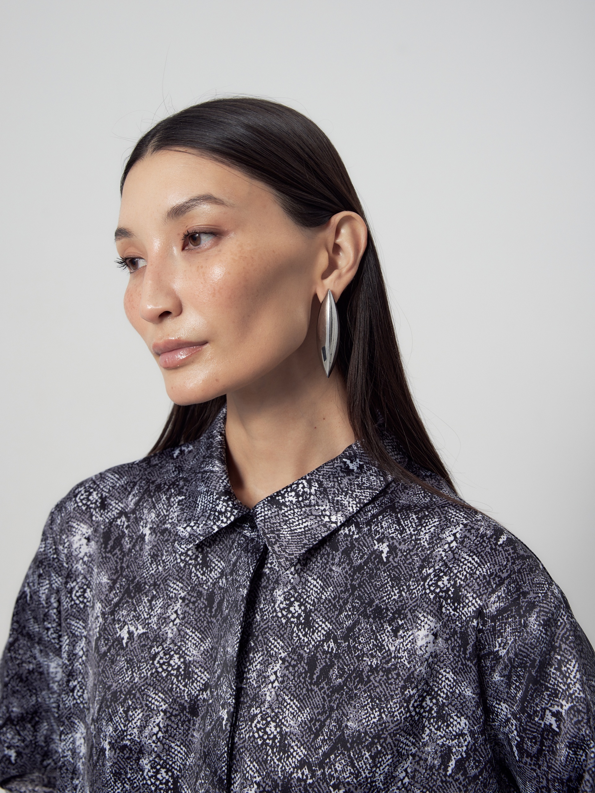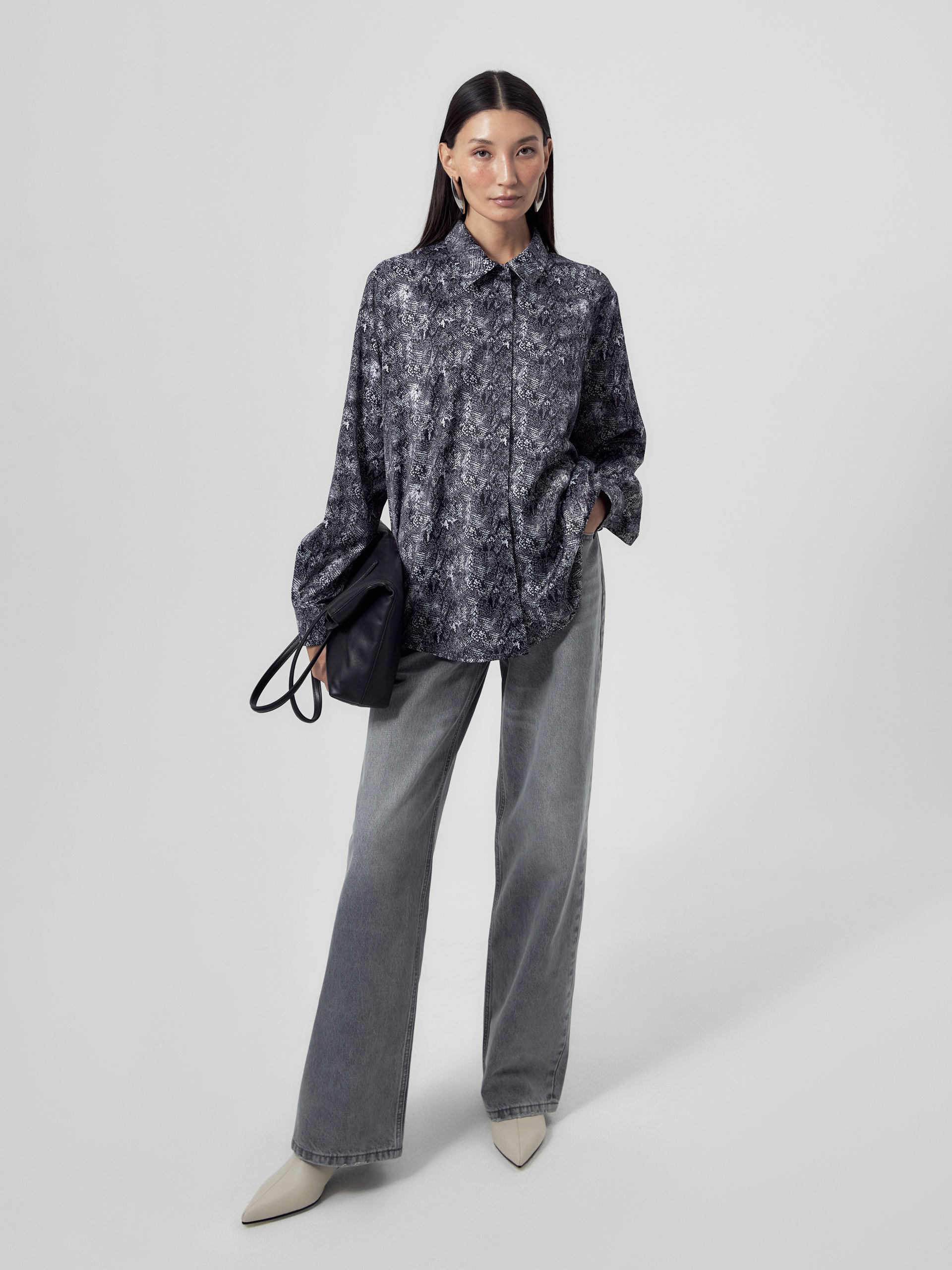 Прямая блуза из атласной ткани с принтом «змея», классическим отложным воротником и потайной планкой с пуговицами, рукав втачной, со спущенной линией плеча на манжете. На спинке кокетка с бантовой складкой.