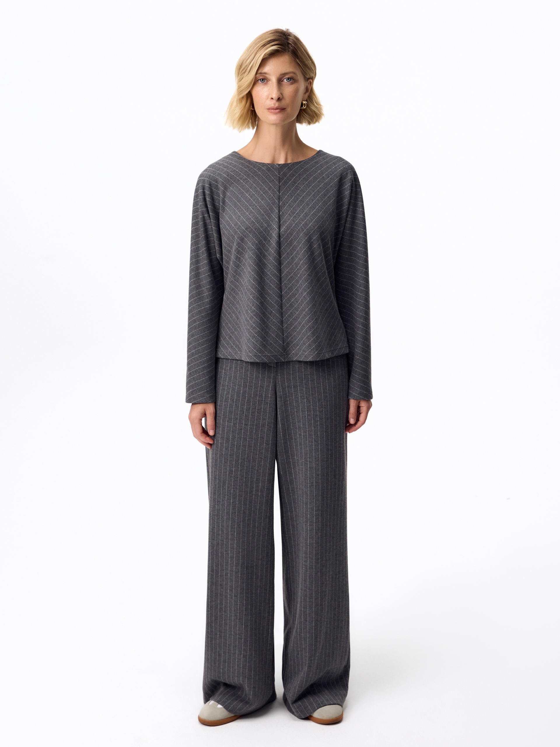 Полуприлегающая блуза из трикотажного полотна серого цвета с тонкой полоской и круглой горловиной, плечо спущенное с рукавом полной длины....