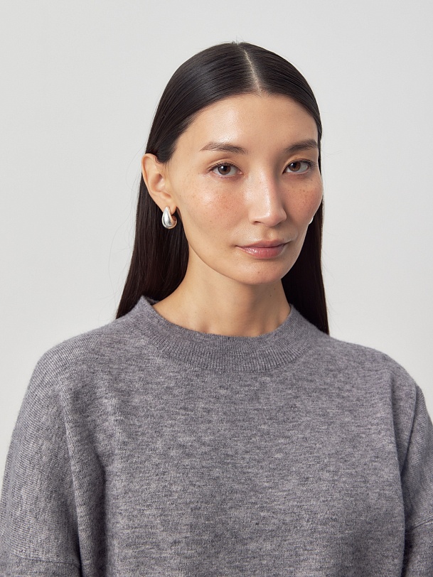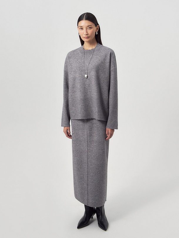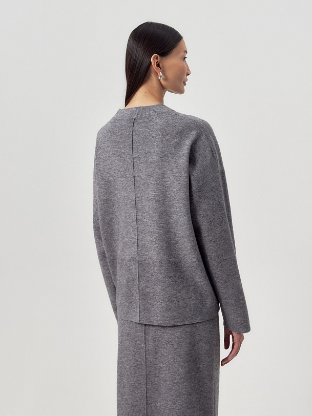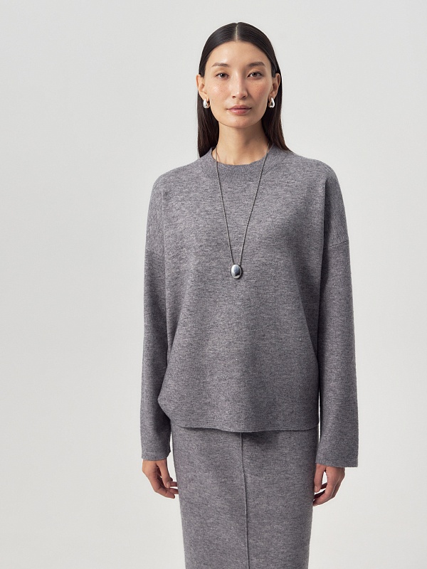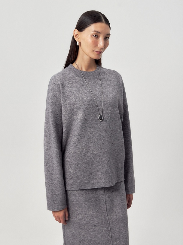 Вязаный джемпер свободного силуэта. Горловина круглая, рукав втачной, с немного приспущенной линией плеча. Составит стильный образ как с юбкой из той же пряжи, так и с другой одеждой.