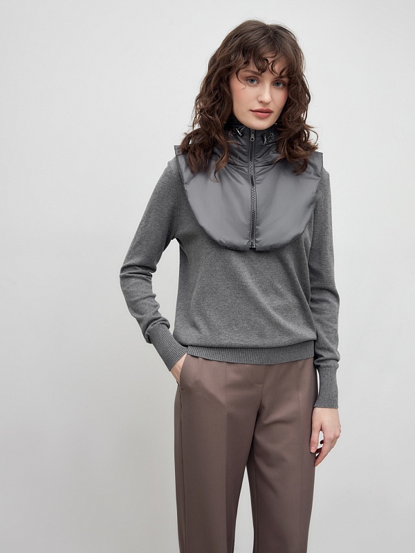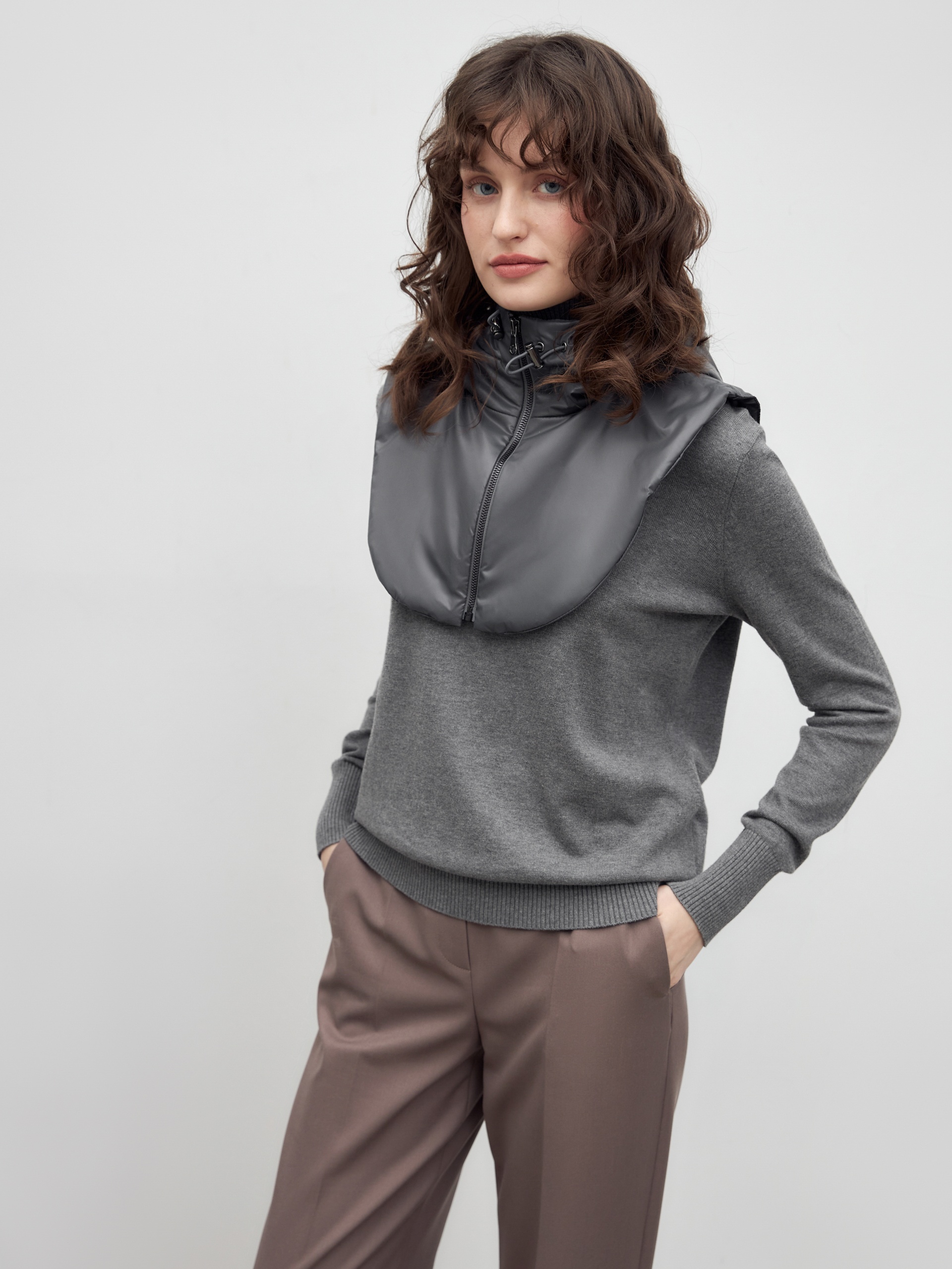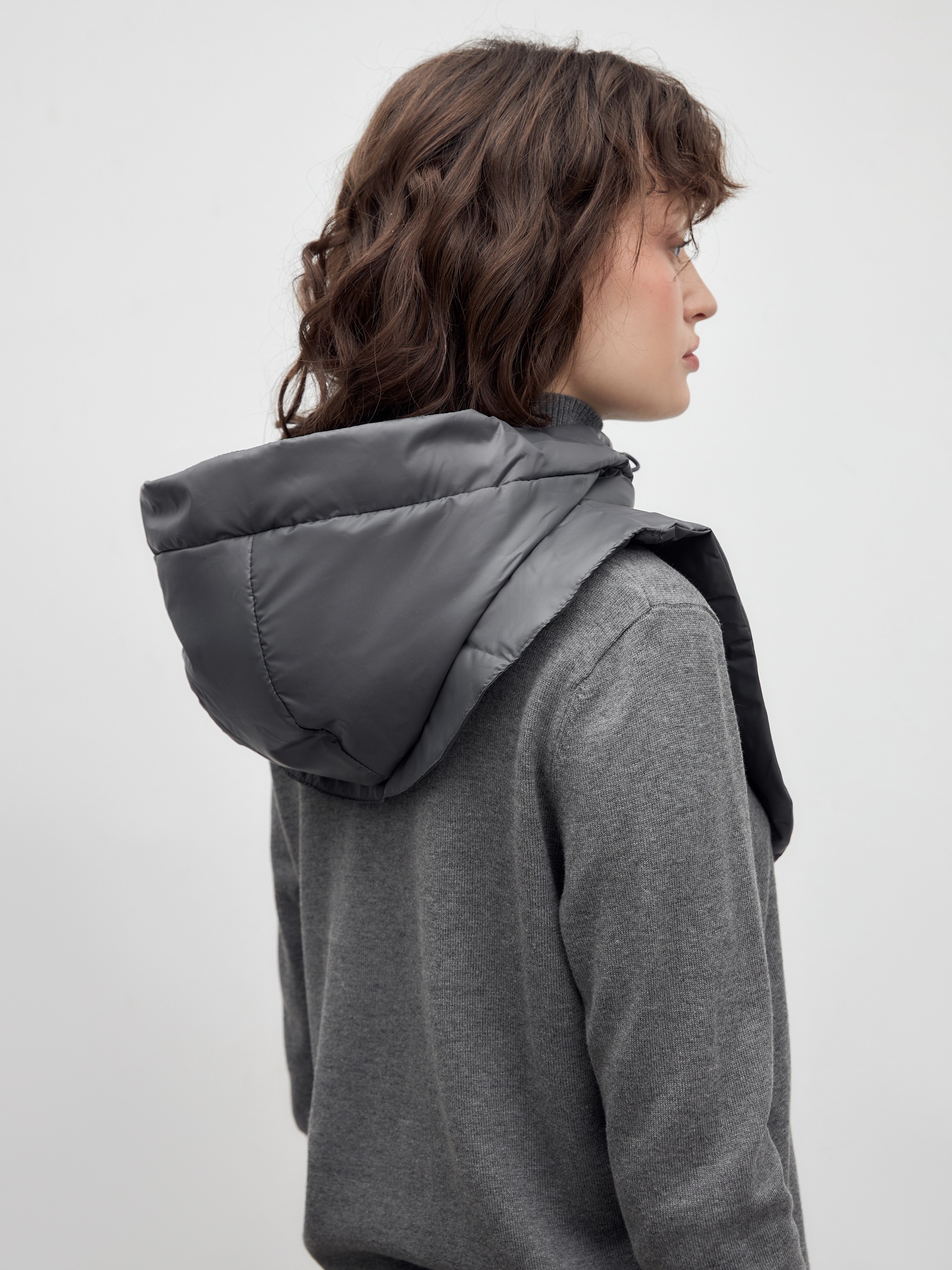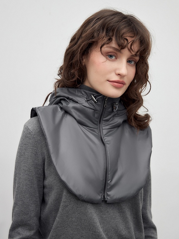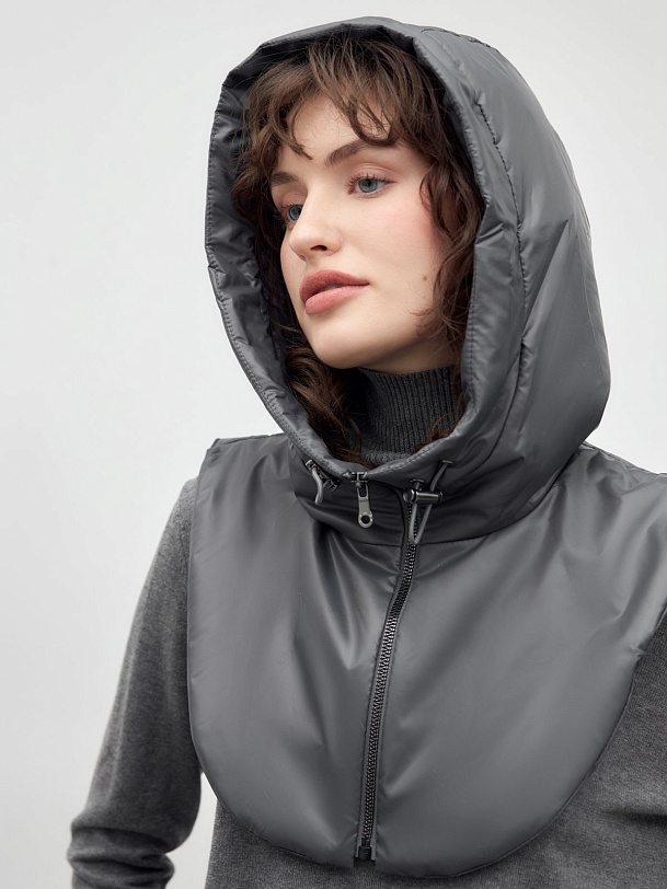 Съемный утепленный зимний капюшон темно-серого цвета из плащевой ткани с водоотталкивающим покрытием. Капюшон имеет манишку и застежку на молнию. Внутри изделия располагаются два мягких фиксатора для регулирования объема. Такой капюшон послужит прекрасным дополнением к любому образу с пальто из нашей коллекции и надежно защитит от непогоды. Произведено в Санкт-Петербурге.