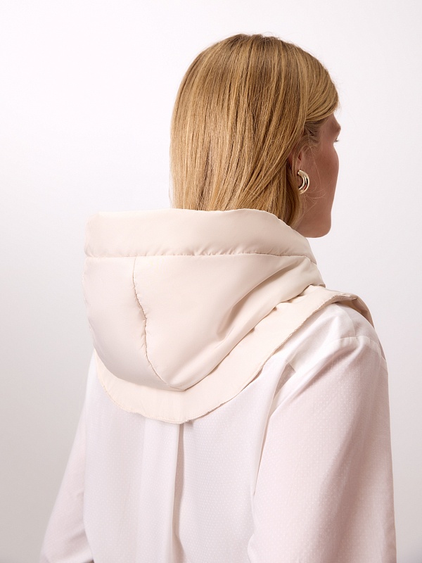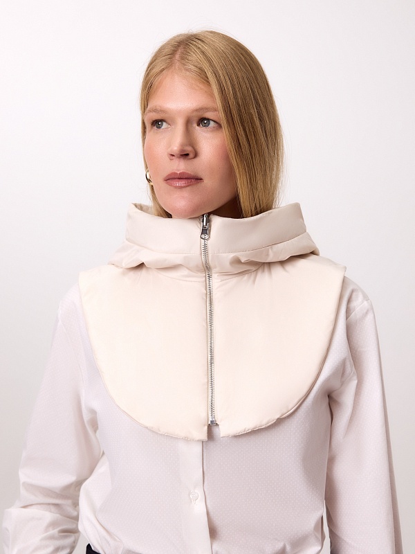 Съемный утепленный зимний капюшон бежевого цвета из плащевой ткани с водоотталкивающим покрытием. Капюшон имеет манишку и застежку на молнию. Внутри изделия располагаются два мягких фиксатора для регулирования объема. Такой капюшон послужит прекрасным дополнением к любому образу с пальто из нашей коллекции и надежно защитит от непогоды. Произведено в Санкт-Петербурге.
