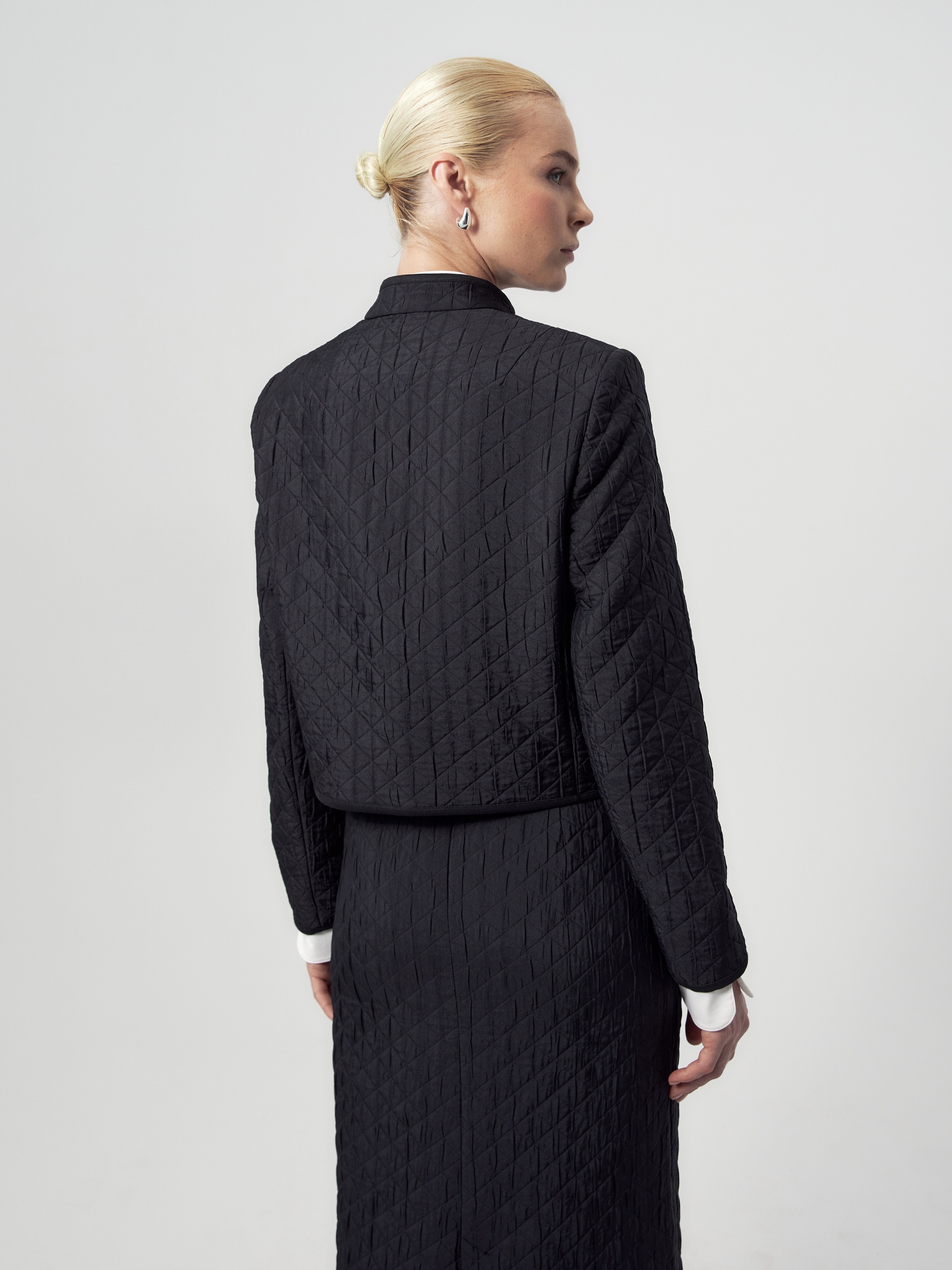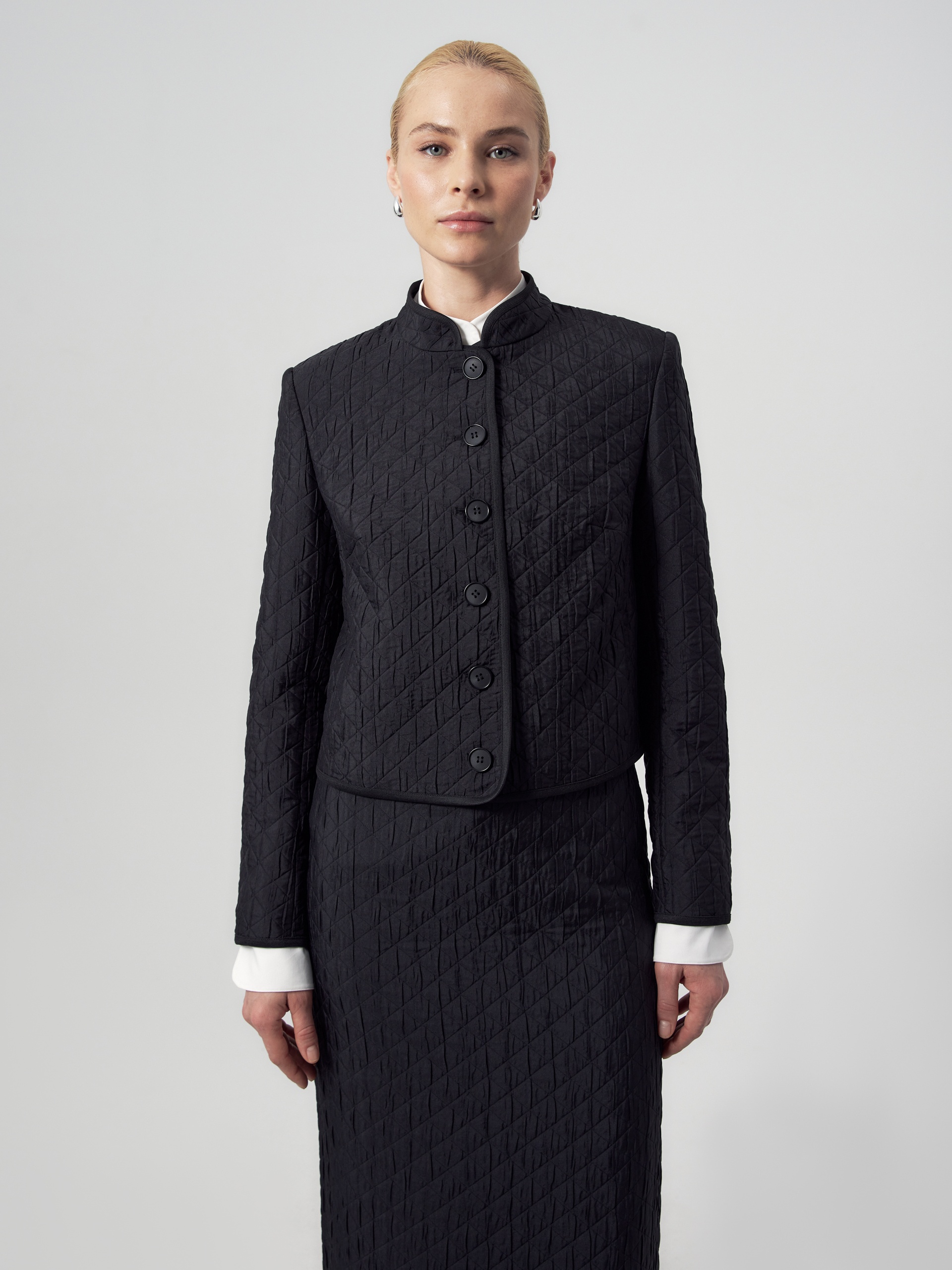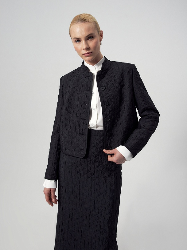 Укороченный прямой жакет из стеганой ткани черного цвета с воротником-стойкой и рядом пуговиц по борту. Рукава втачные, классической длины. Края жакета и рукавов, а также низ изделия окантованы отделочной тканью. Жакет полностью на подкладке.