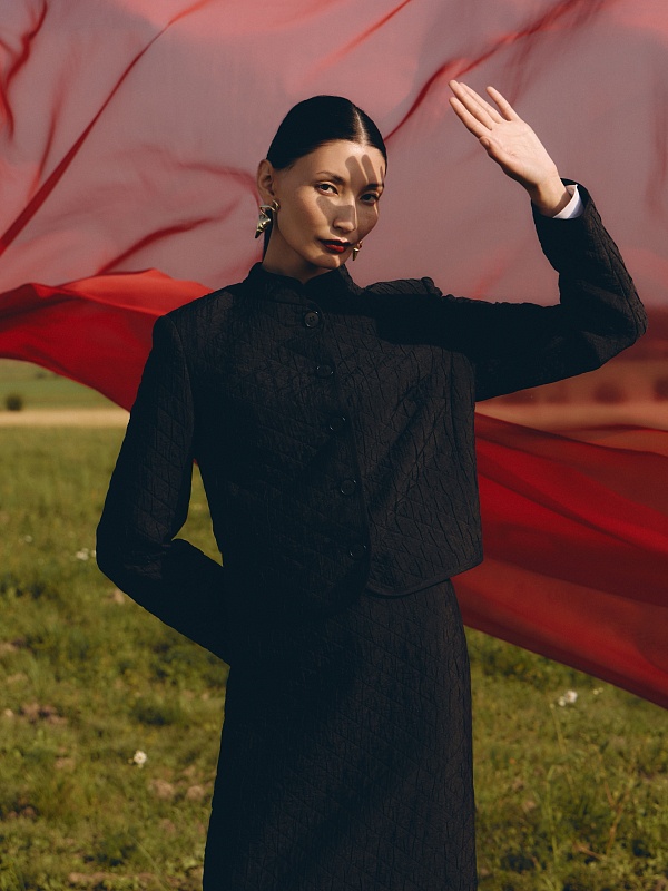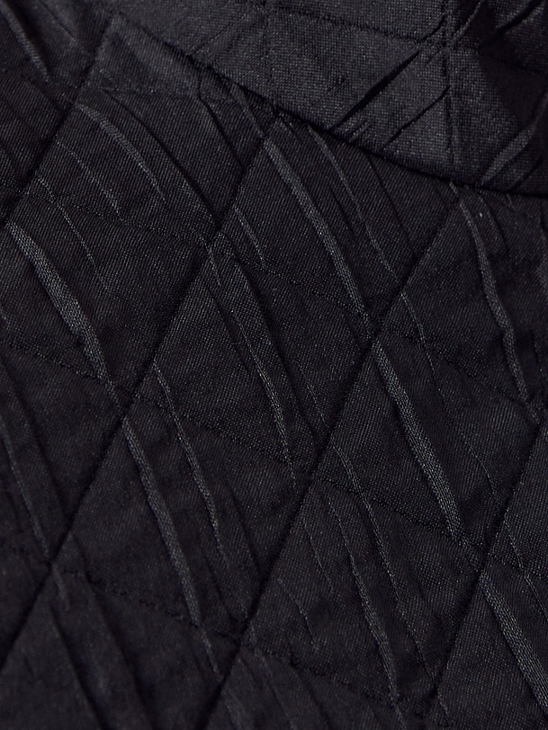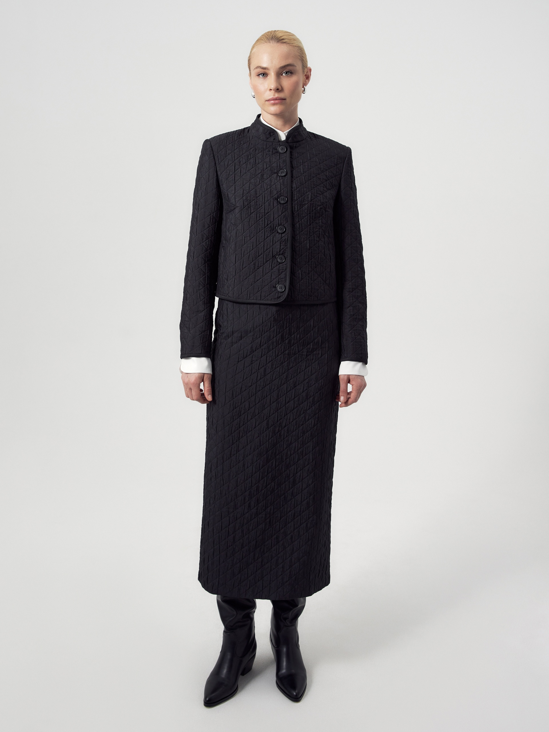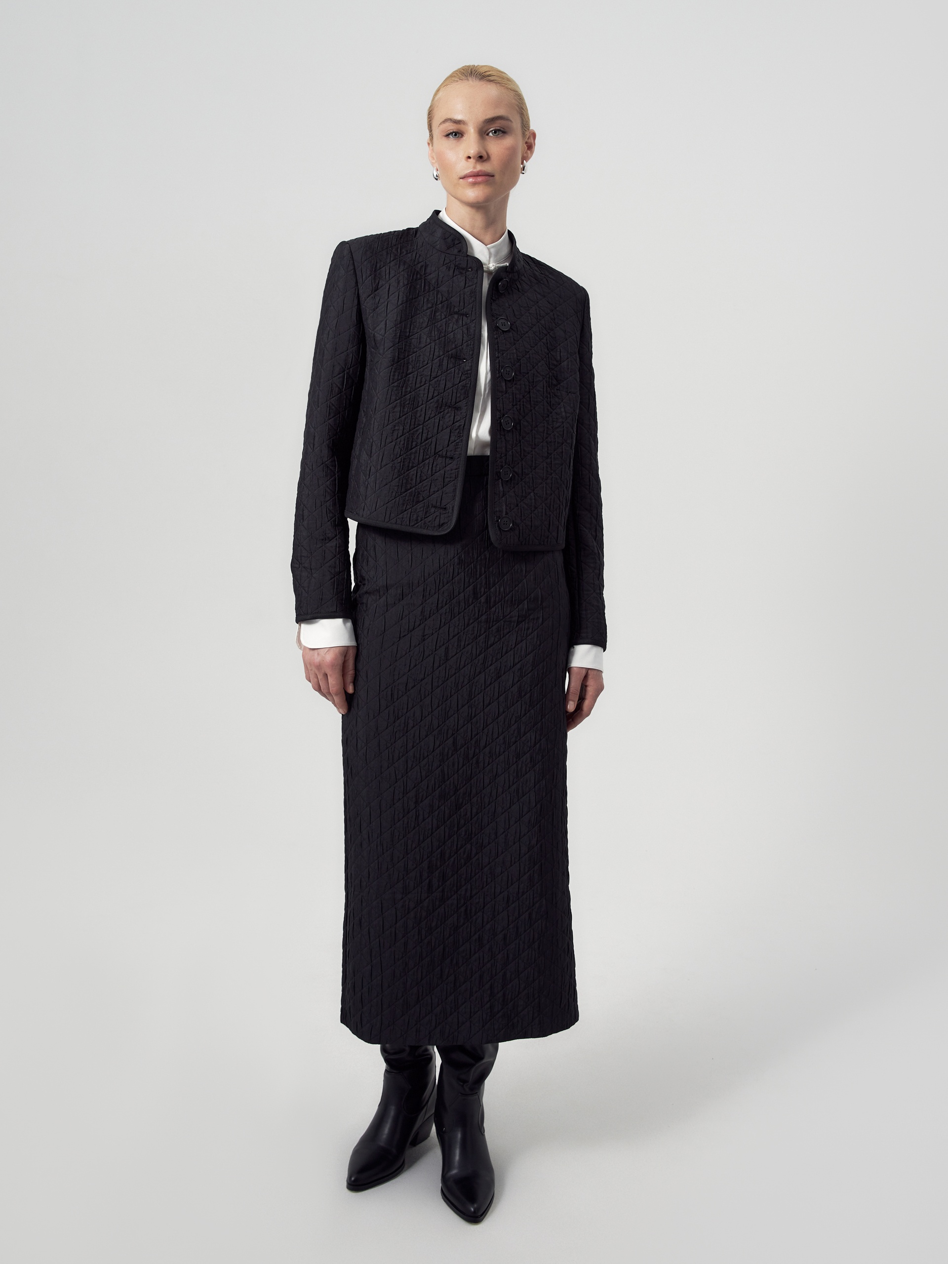Укороченный прямой жакет из стеганой ткани черного цвета с воротником-стойкой и рядом пуговиц по борту. Рукава втачные, классической длины. Края жакета и рукавов, а также низ изделия окантованы отделочной тканью. Жакет полностью на подкладке.