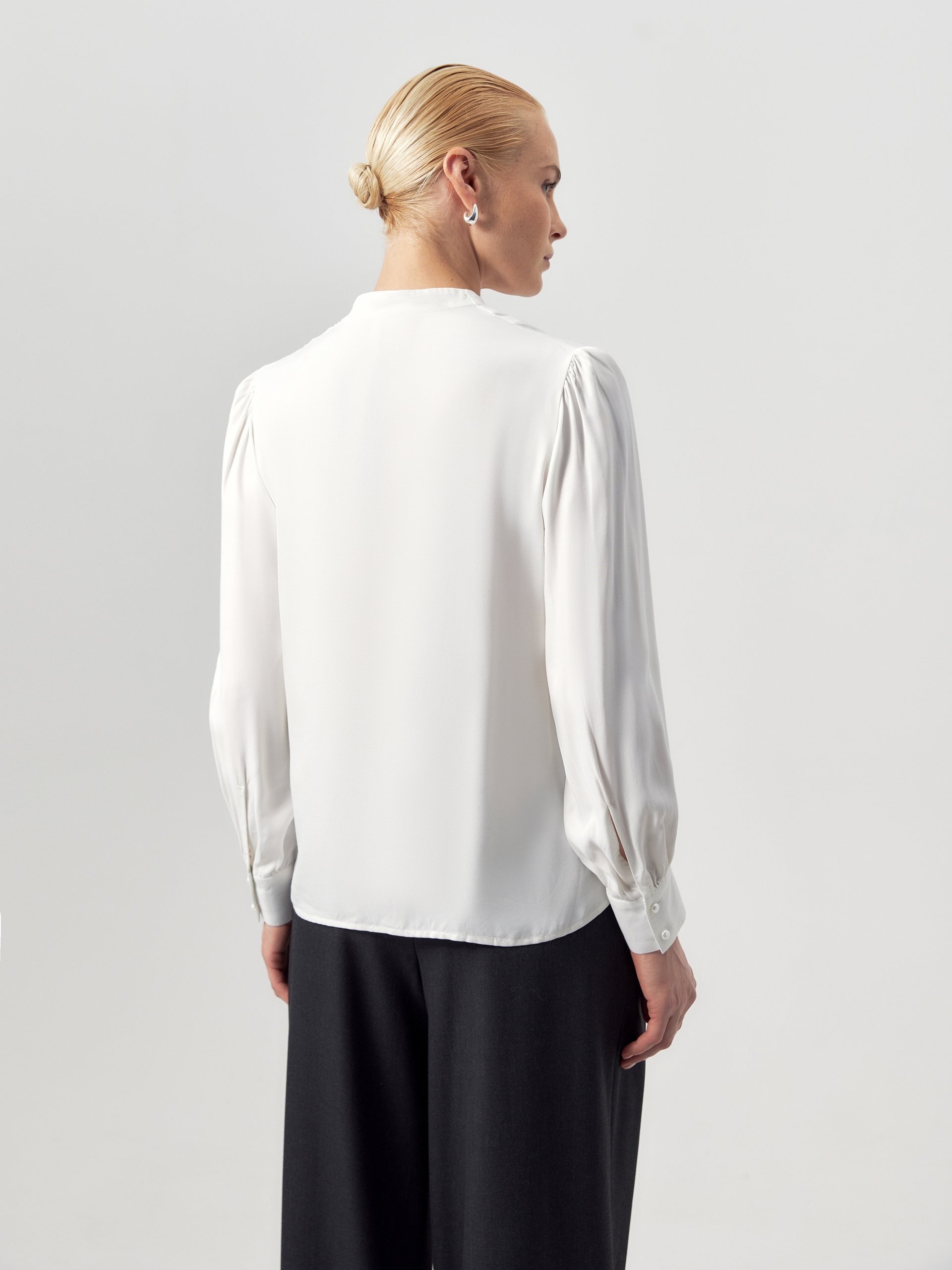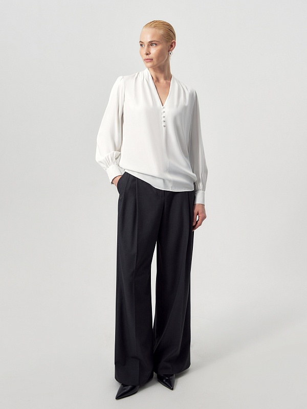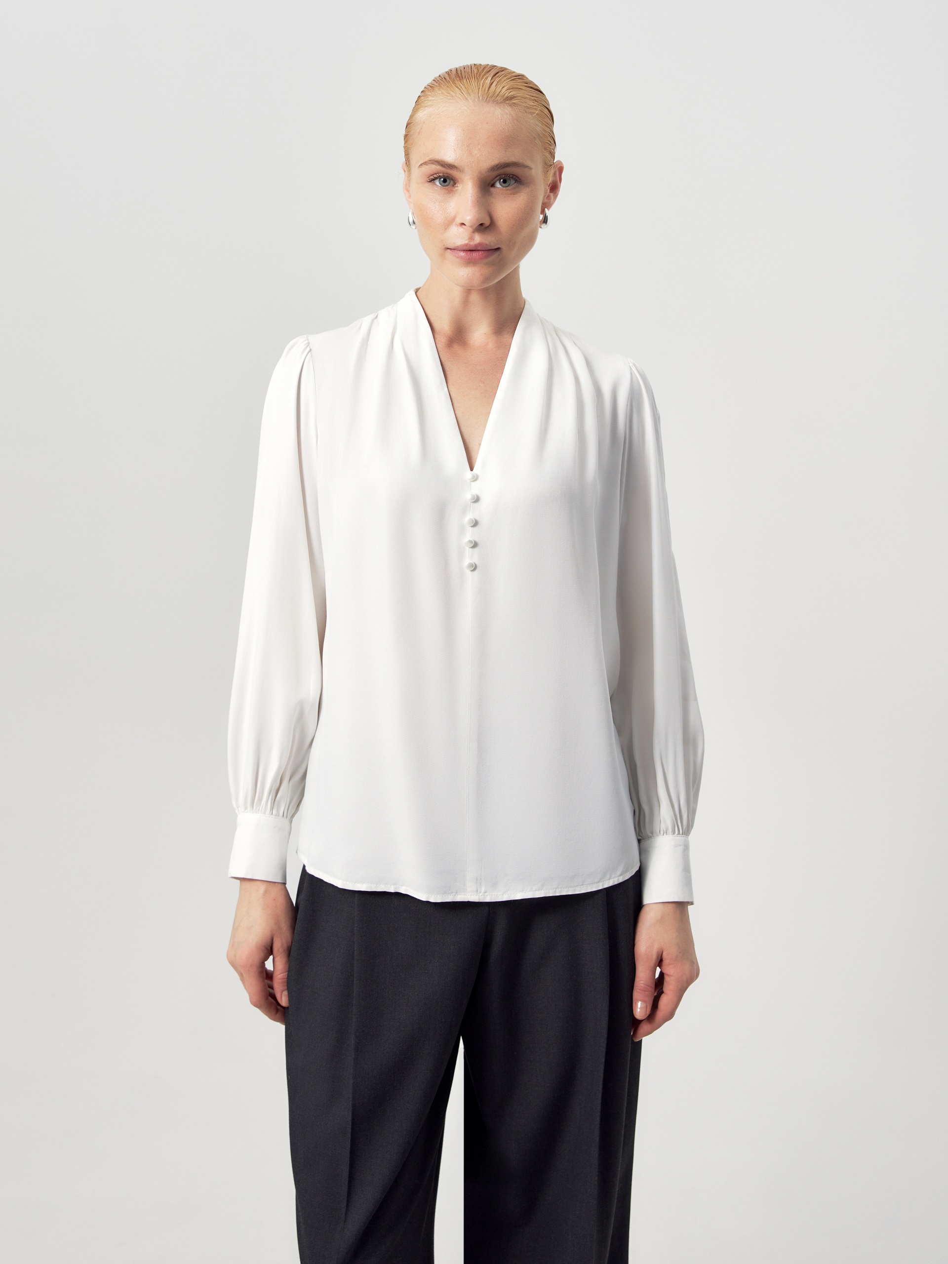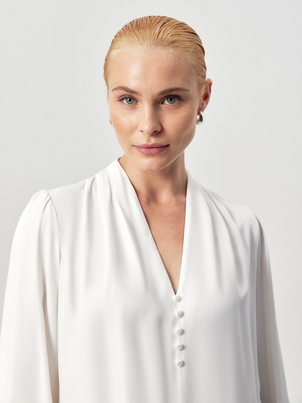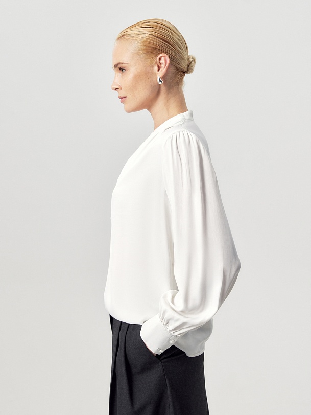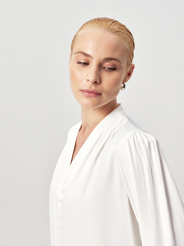 Прямая блуза белого цвета из вискозы, с цельнокроеным воротником-стойкой и V-образным вырезом горловины. На плечах — складки. Классический рукав со сборкой по линии плеча, с манжетой и жемчужными пуговицами. На полочке — ряд жемчужных пуговиц.