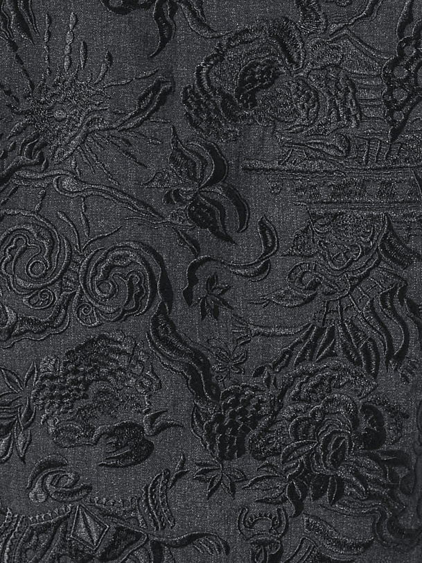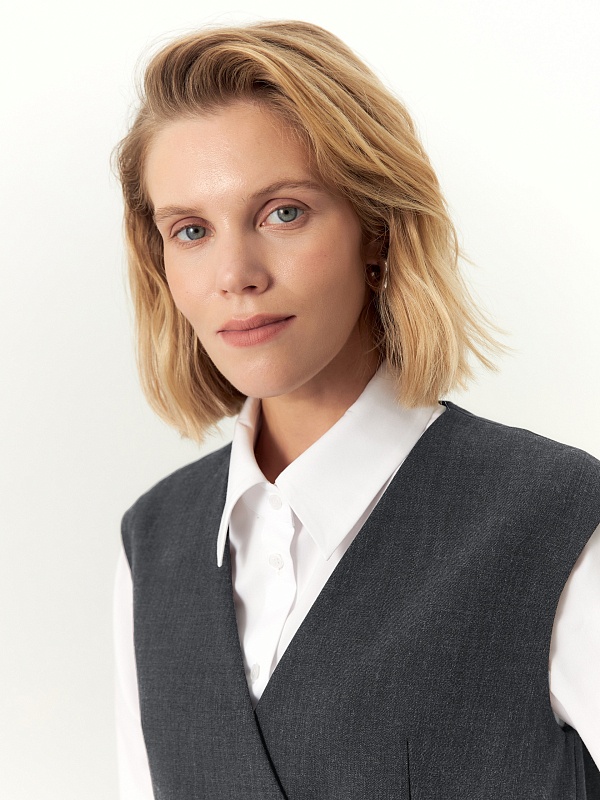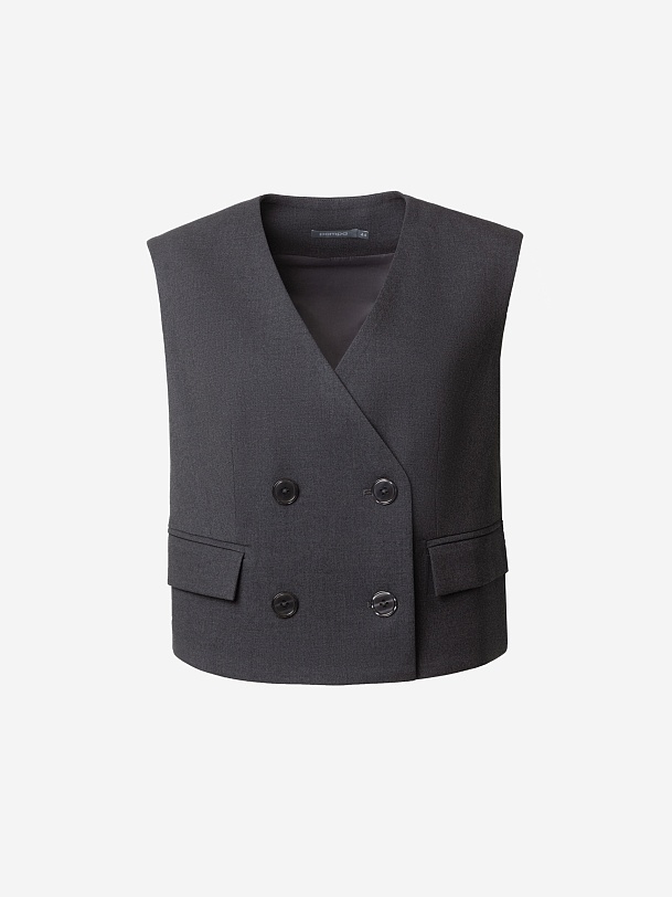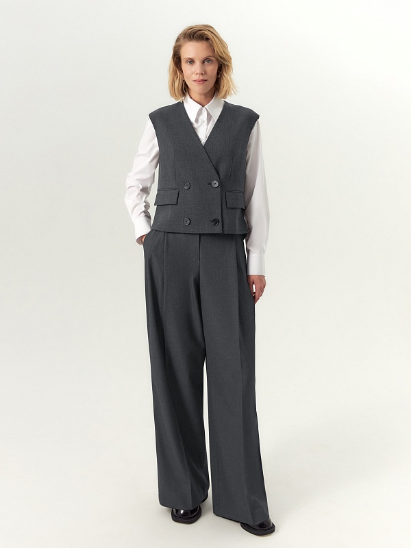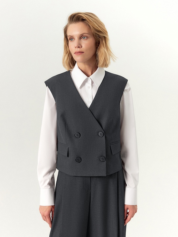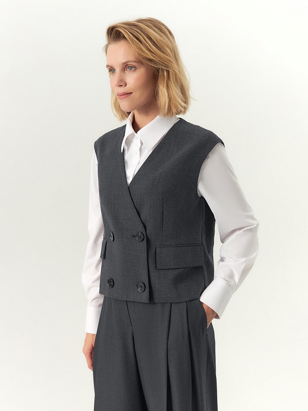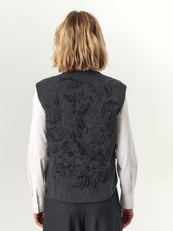 Прямой укороченный двубортный жилет с V-образным вырезом выполнен из вискозной костюмной ткани серого цвета. На спинке расположена большая вышивка в китайском стиле. На передней части жилета расположены два ряда пуговиц и прорезные карманы с клапанами. Жилет имеет подкладку. Он составит прекрасный ансамбль с широкими брюками со складками, выполненными из той же ткани.