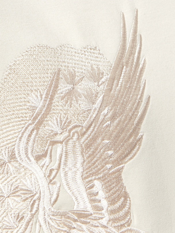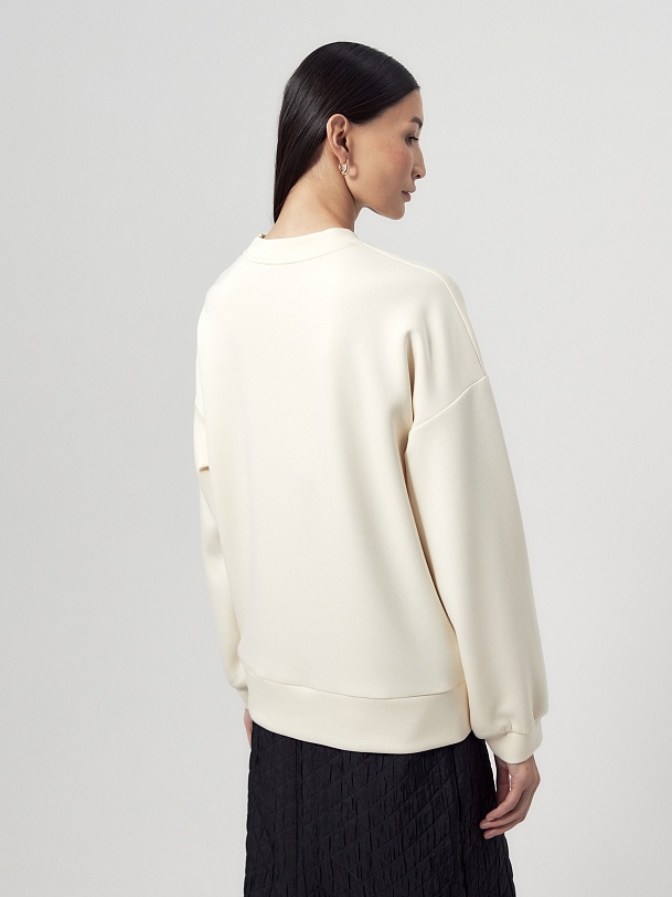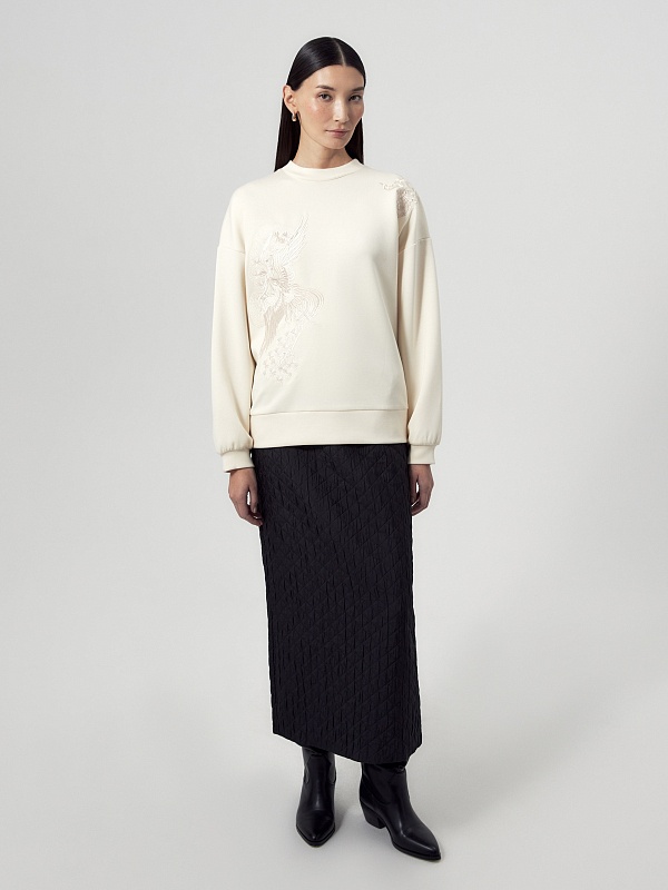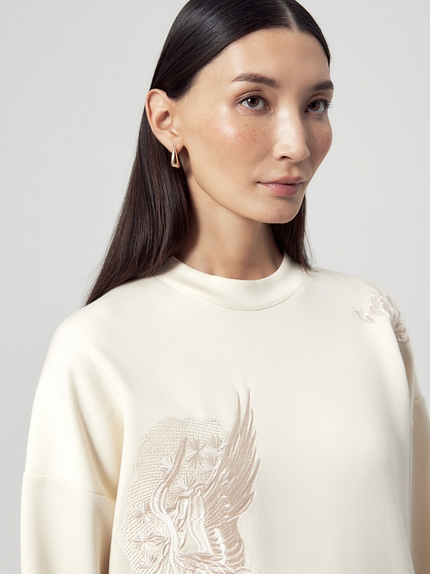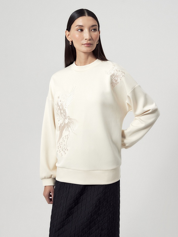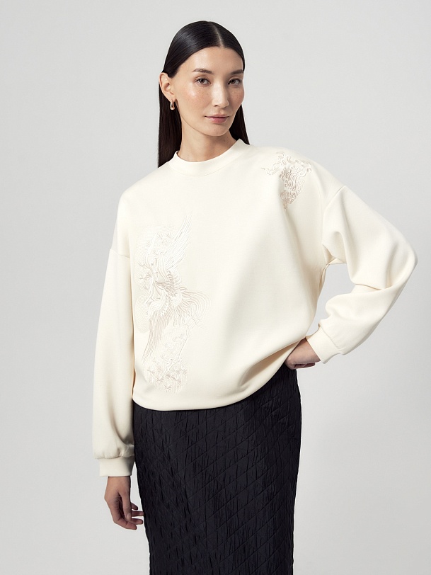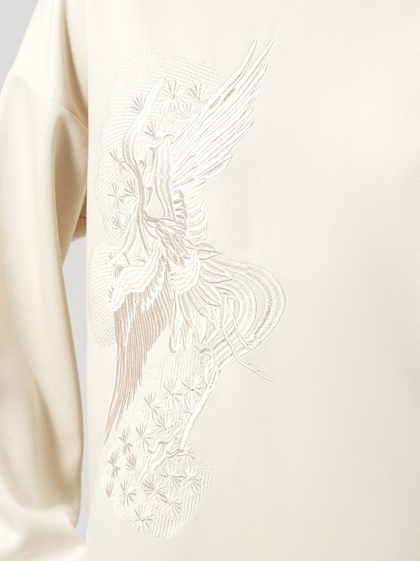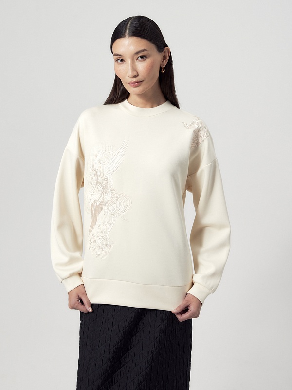 Эффектный и мягкий трикотажный джемпер свободного кроя с круглой горловиной и приспущенной линией рукава. Украшен вышивкой в китайском стиле, подобранной в тон ткани.