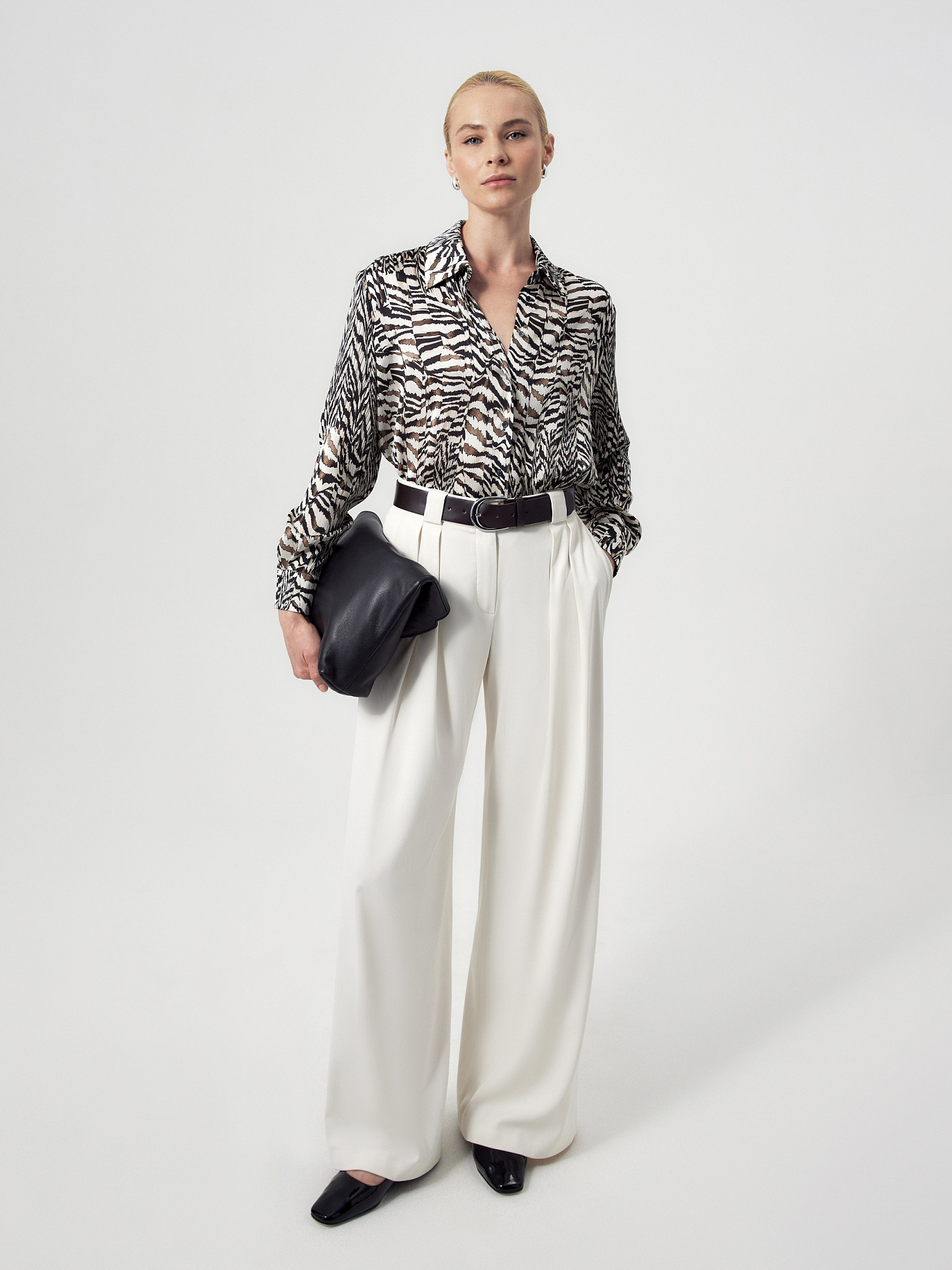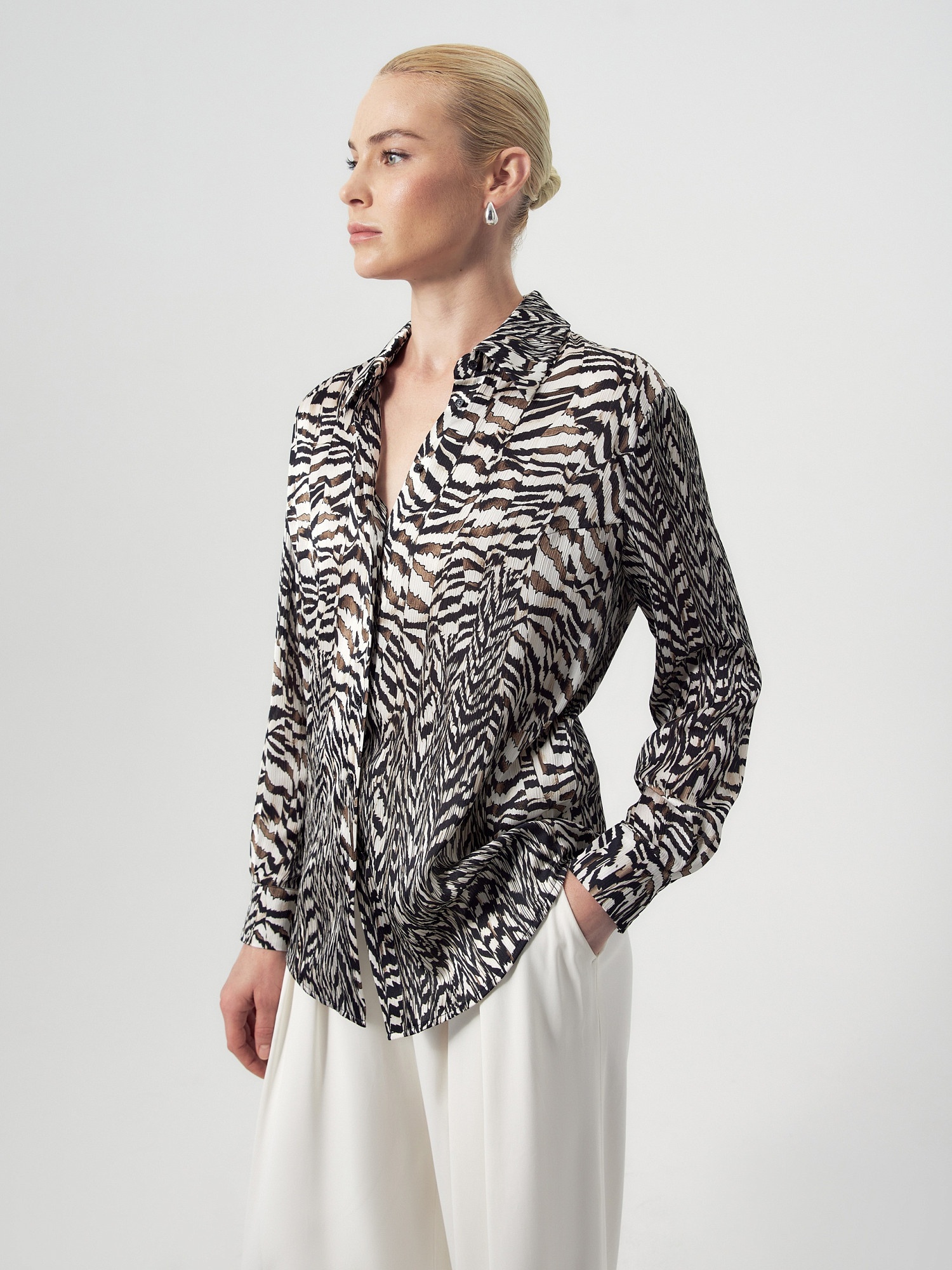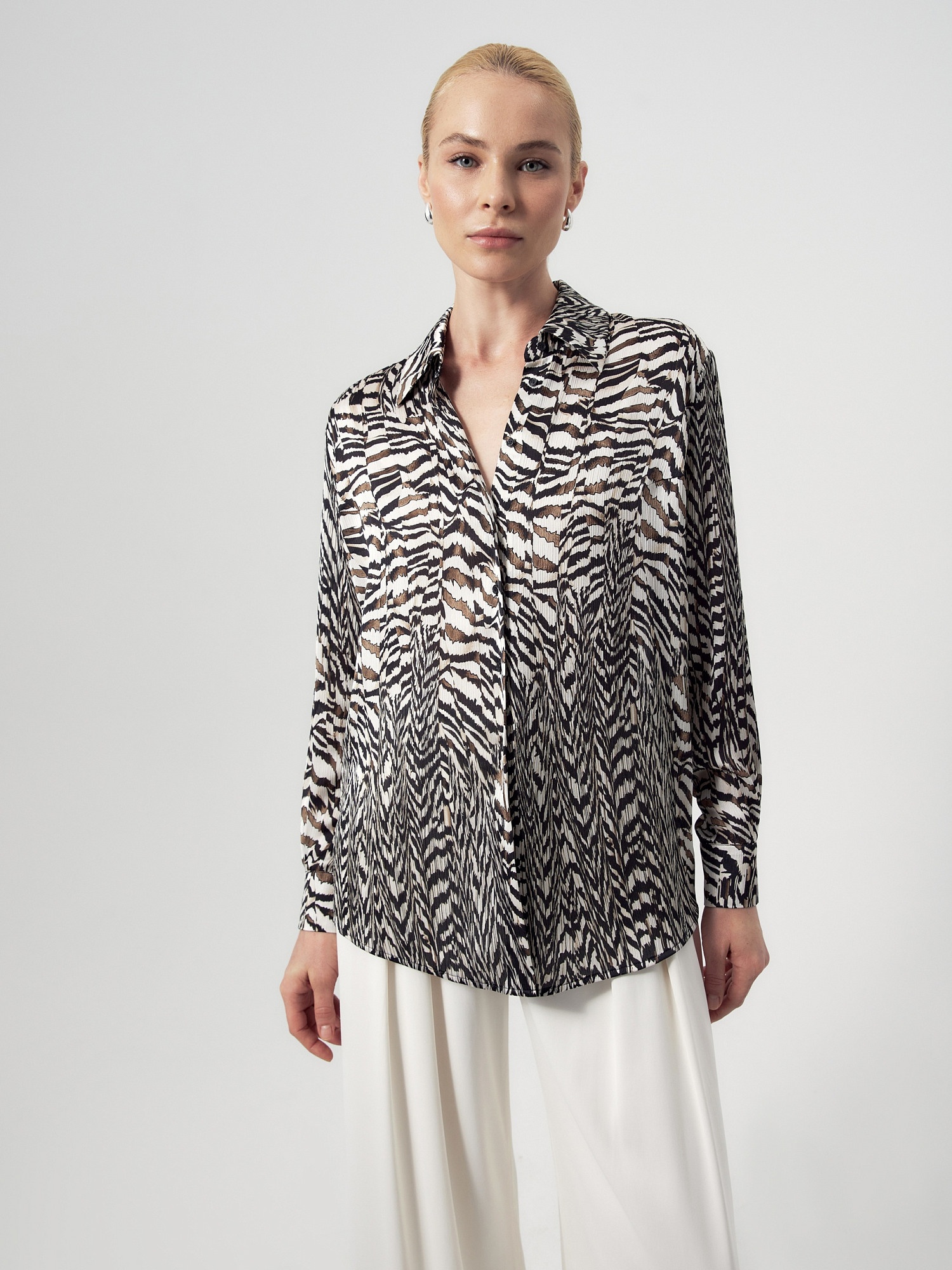 Романтичная прямая блуза с отложным воротником из атласной ткани в анималистичном принте. На спинке блузы имеется кокетка.
