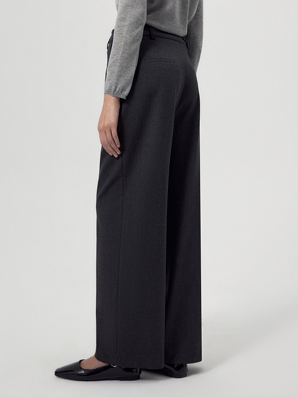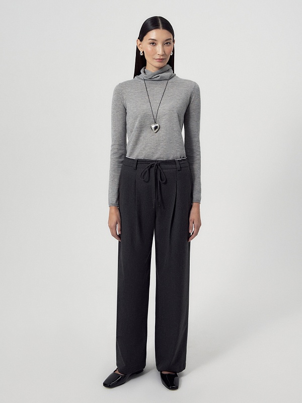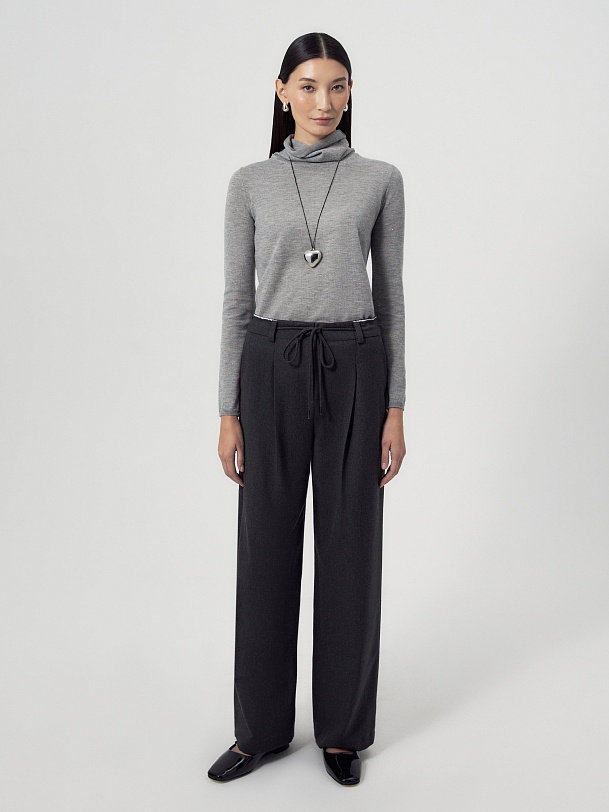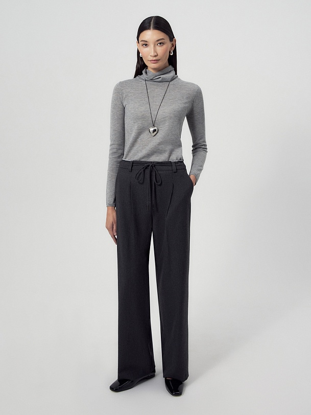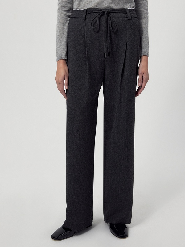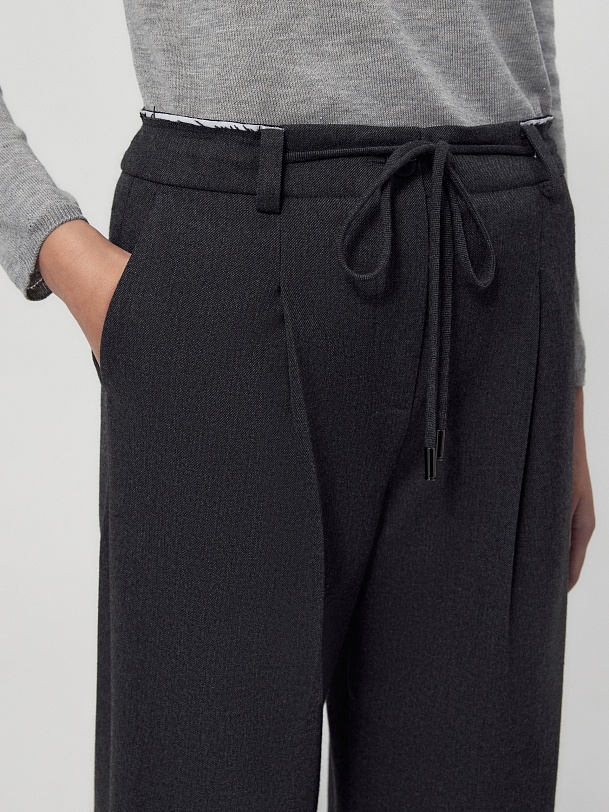 Прямые и широкие брюки из костюмной ткани тумно-серого цвета со складками и кулисой на поясе, которая завязывается на завязки. Пояс выполнен из того же материала, что и брюки, и имеет прямой притачной крой с открытым срезом. В боковых швах расположены функциональные карманы. Спереди брюки застегиваются на молнию и пуговицу.