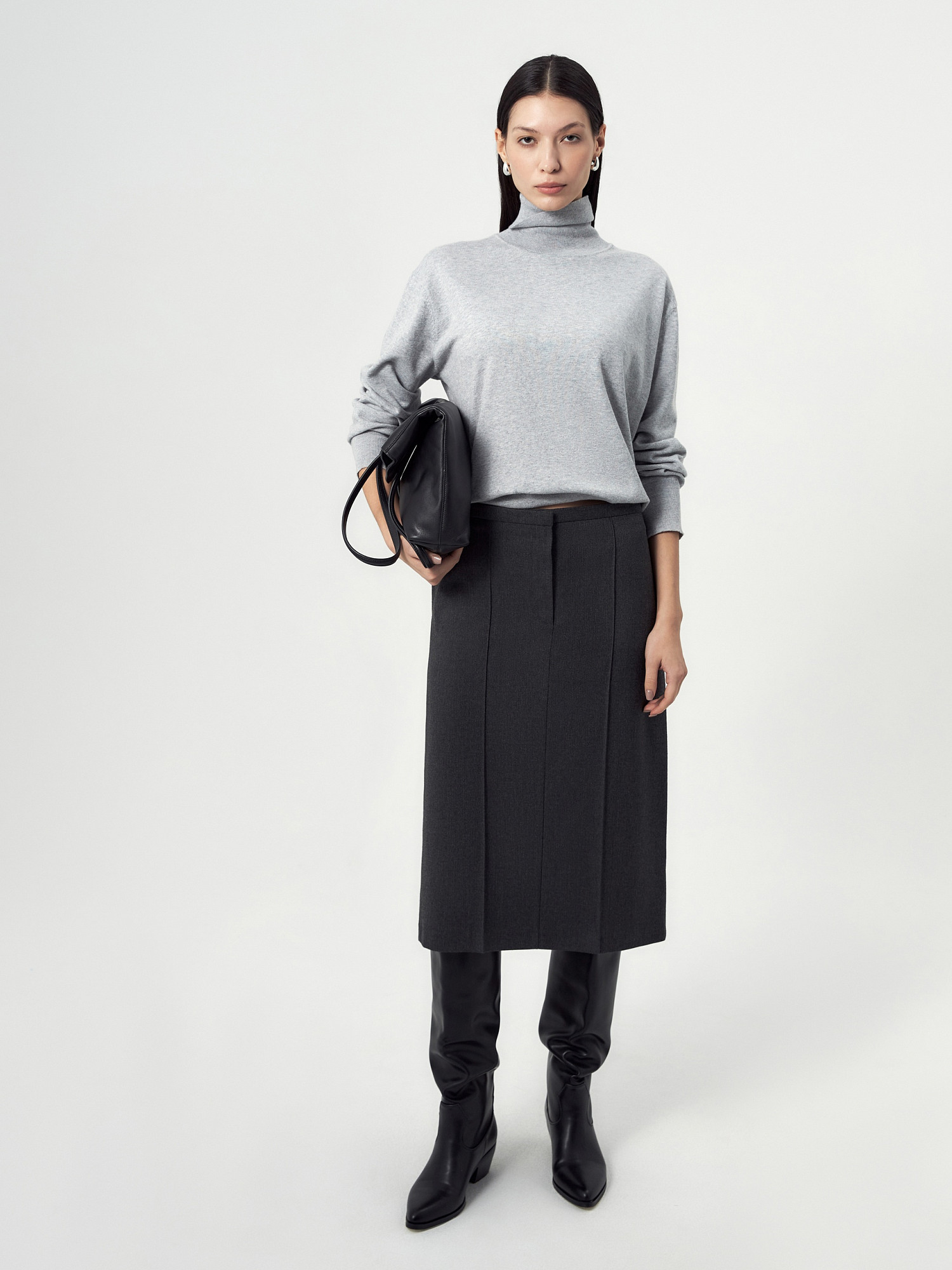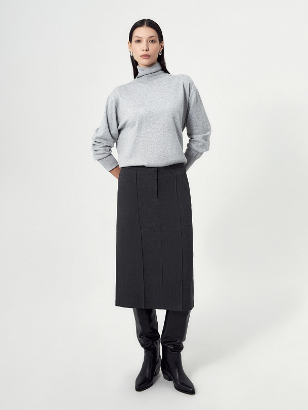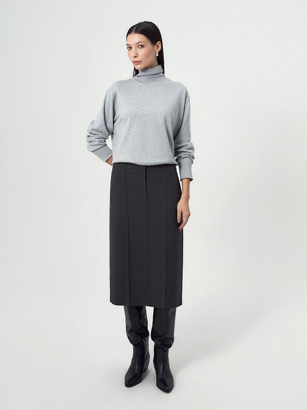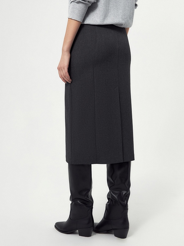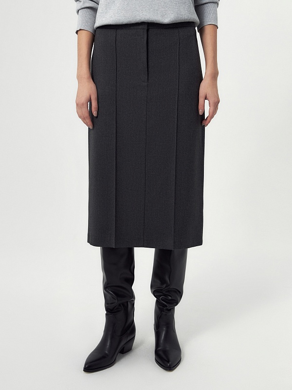 Прямая юбка на средней посадке с гульфиком по переду. Юбка выполнена из костюмной ткани темно-серого цвета. По юбке идут застроченные рельефы.