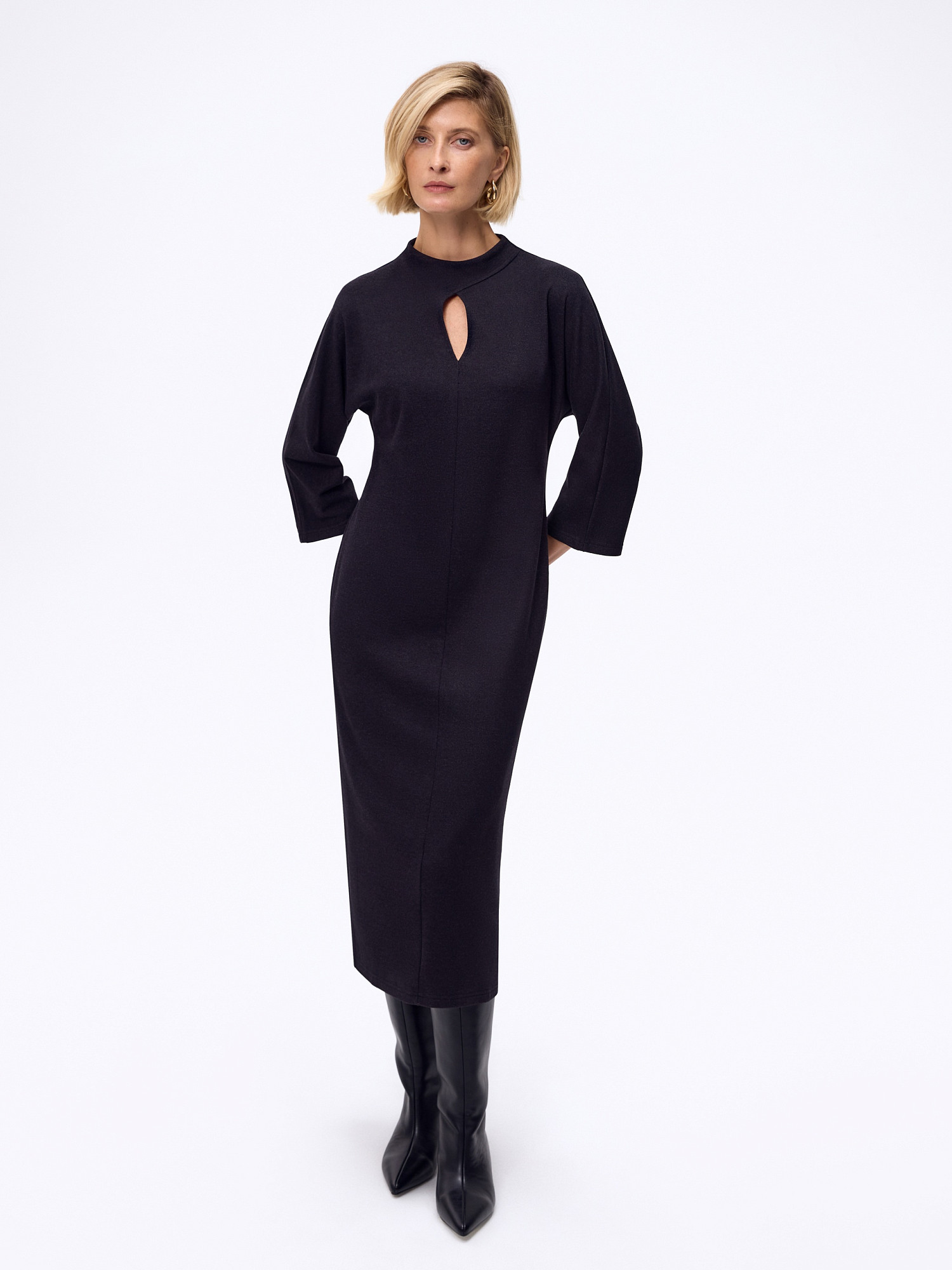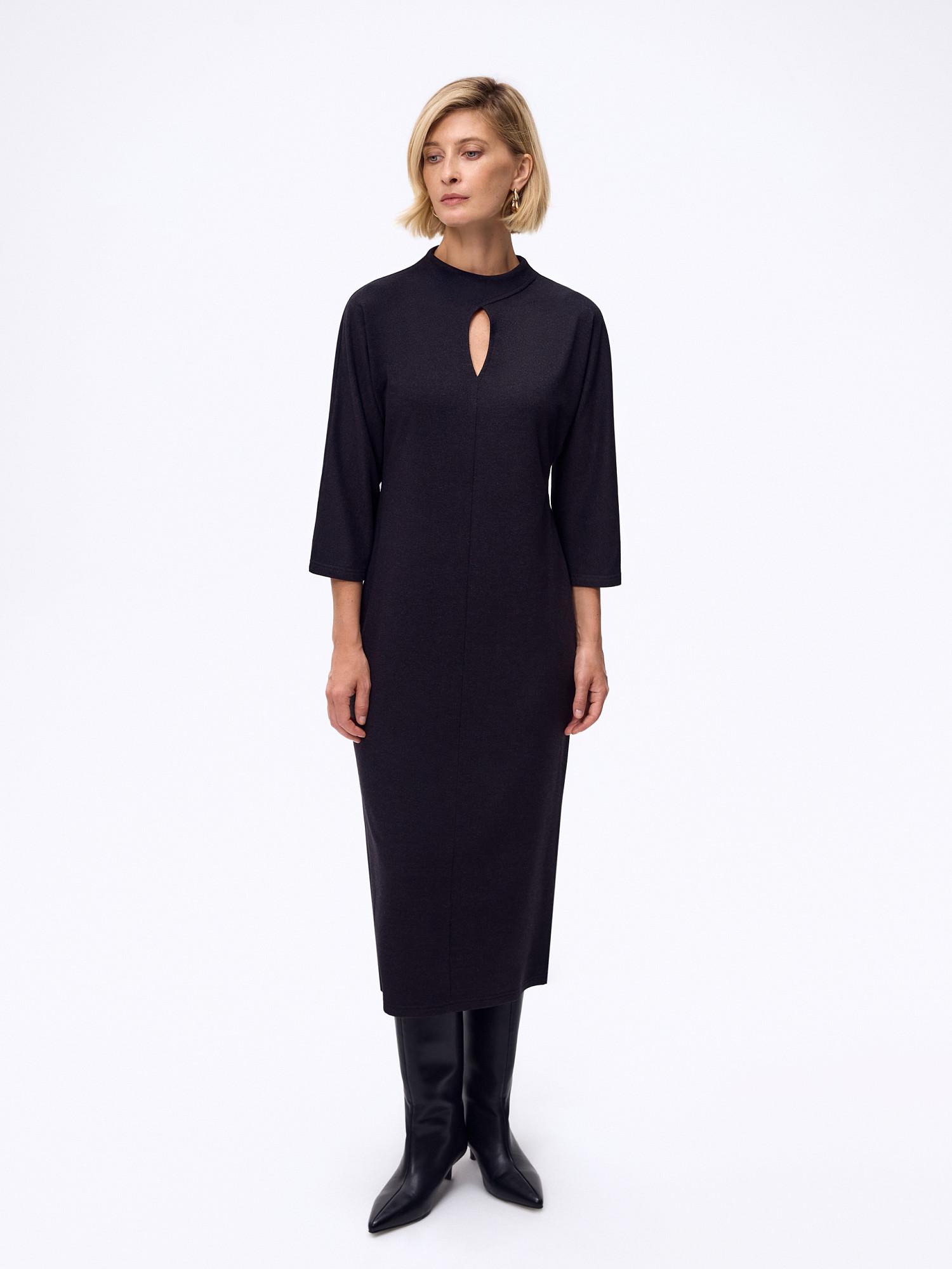 Прямое платье длины миди из мягкого темно-серого трикотажа. У платья цельнокроеные рукав 3/4 и воротник стойка. Спереди красивый разрез-капля с фигурными швами, которые придают платью элегантный вид.