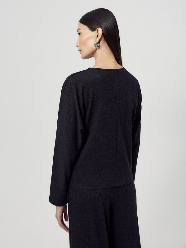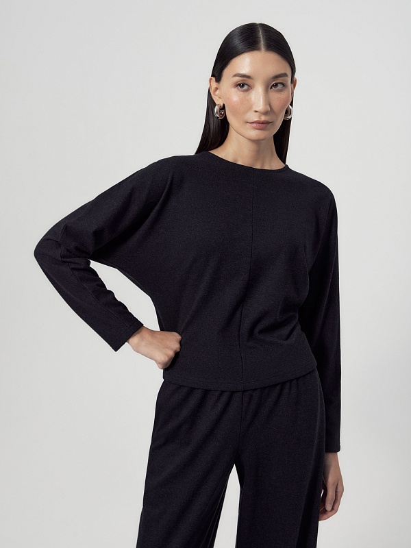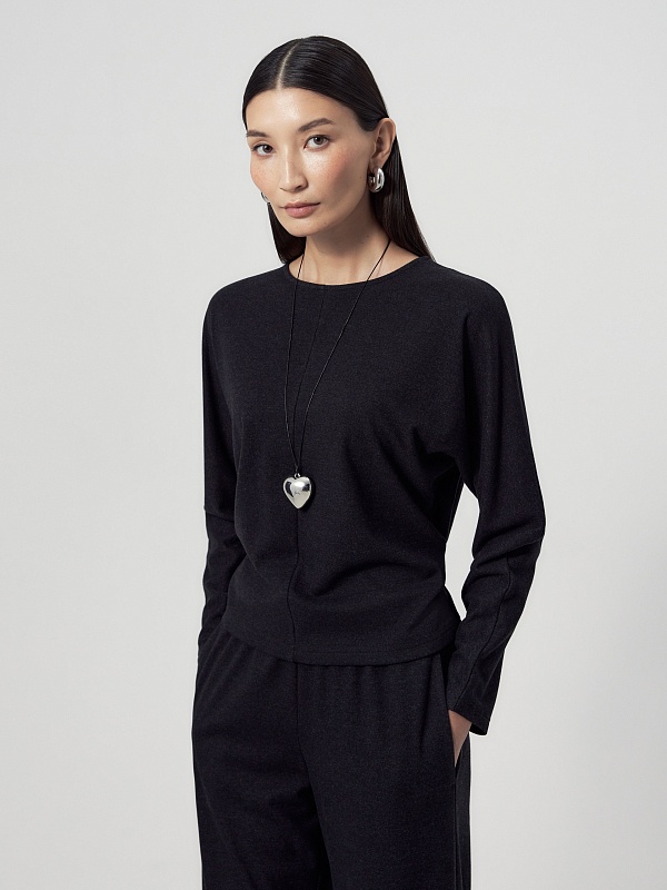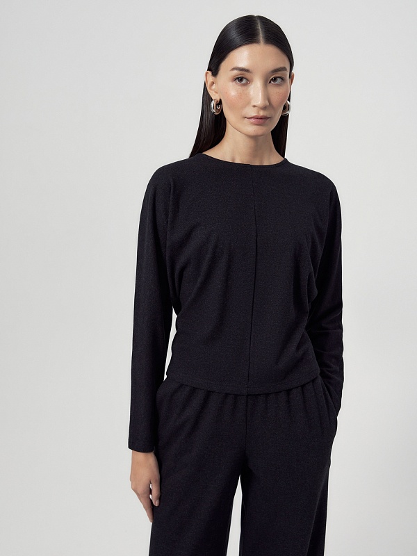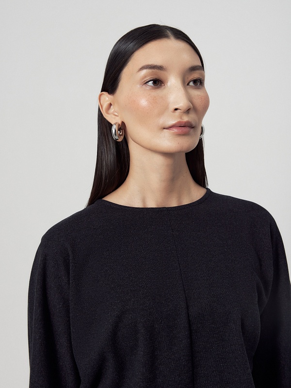 Полуприлегающая блуза темно-серого цвета из трикотажного полотна с круглой горловиной и цельнокроеными рукавами.
