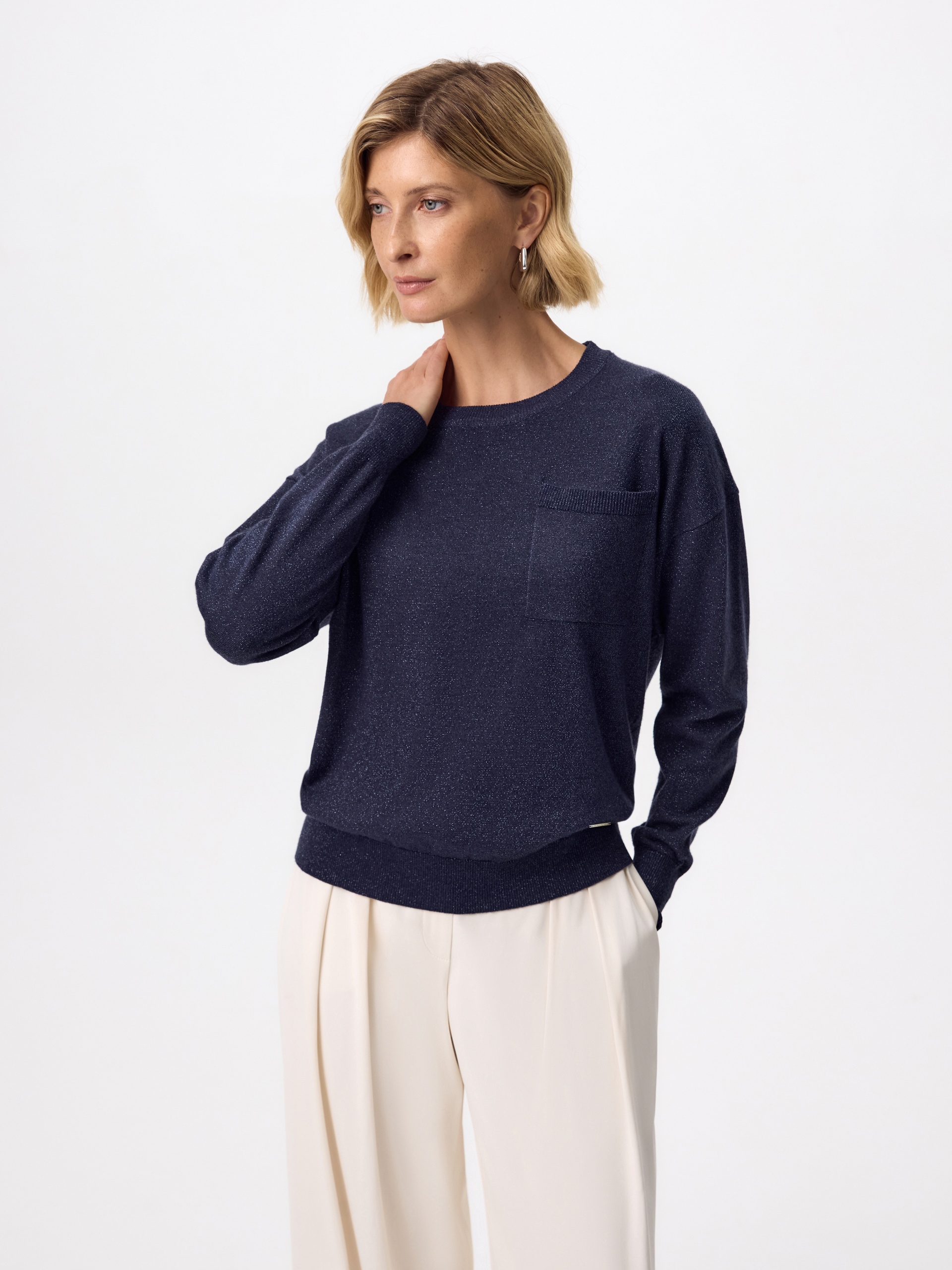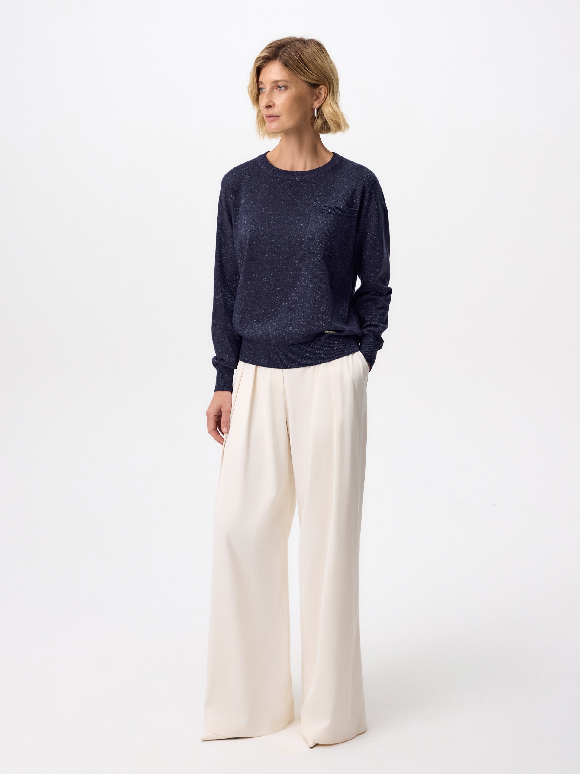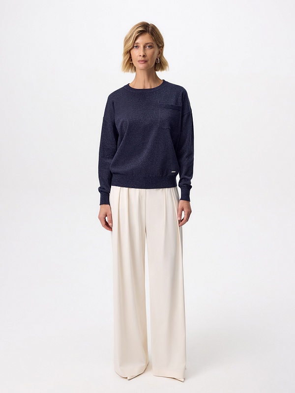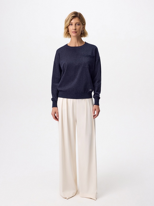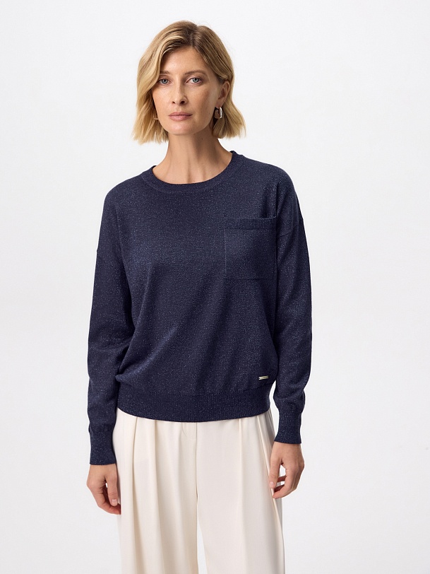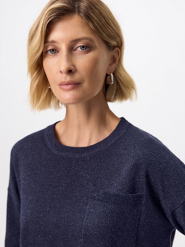 Вязаный джемпер прямого силуэта актуального цвета нэви, выполнен из мягкой вискозной пряжи с небольшим добавлением люрексной нити, что прридает ему мерцание и шарм. Изделие имеет круглый вырез горловины и втачной рукав полной длины. На полочке располагается небольшой накладной карман.