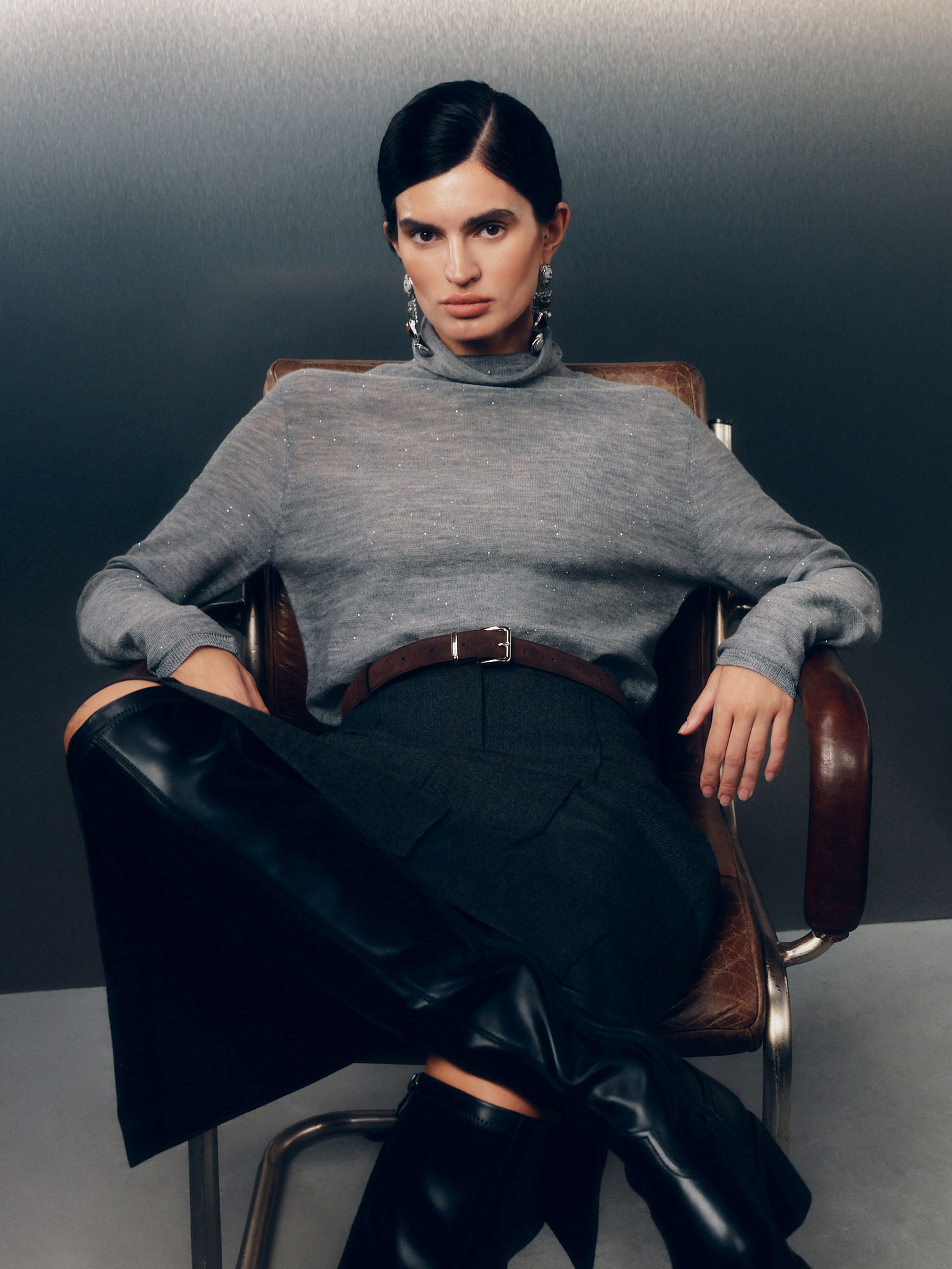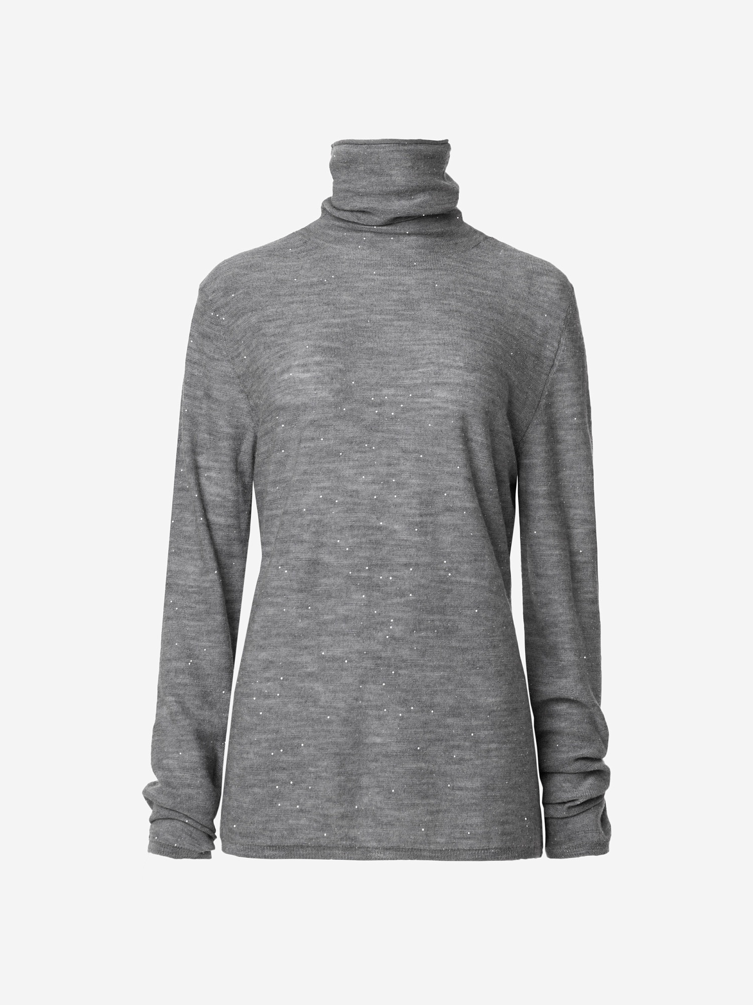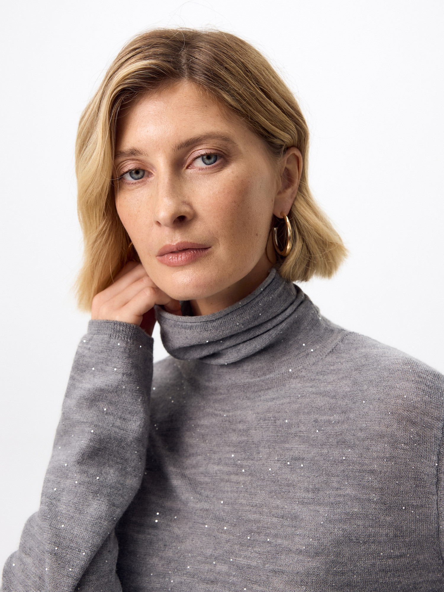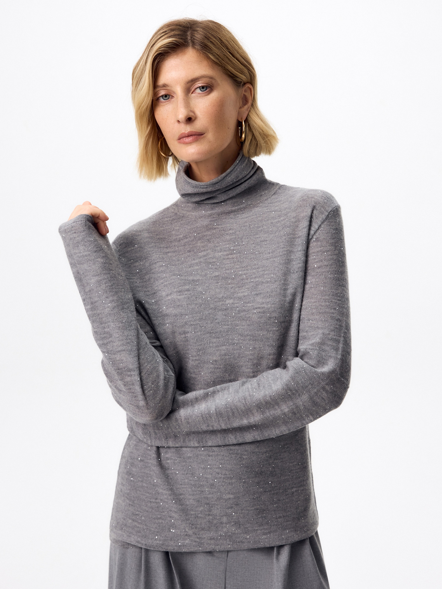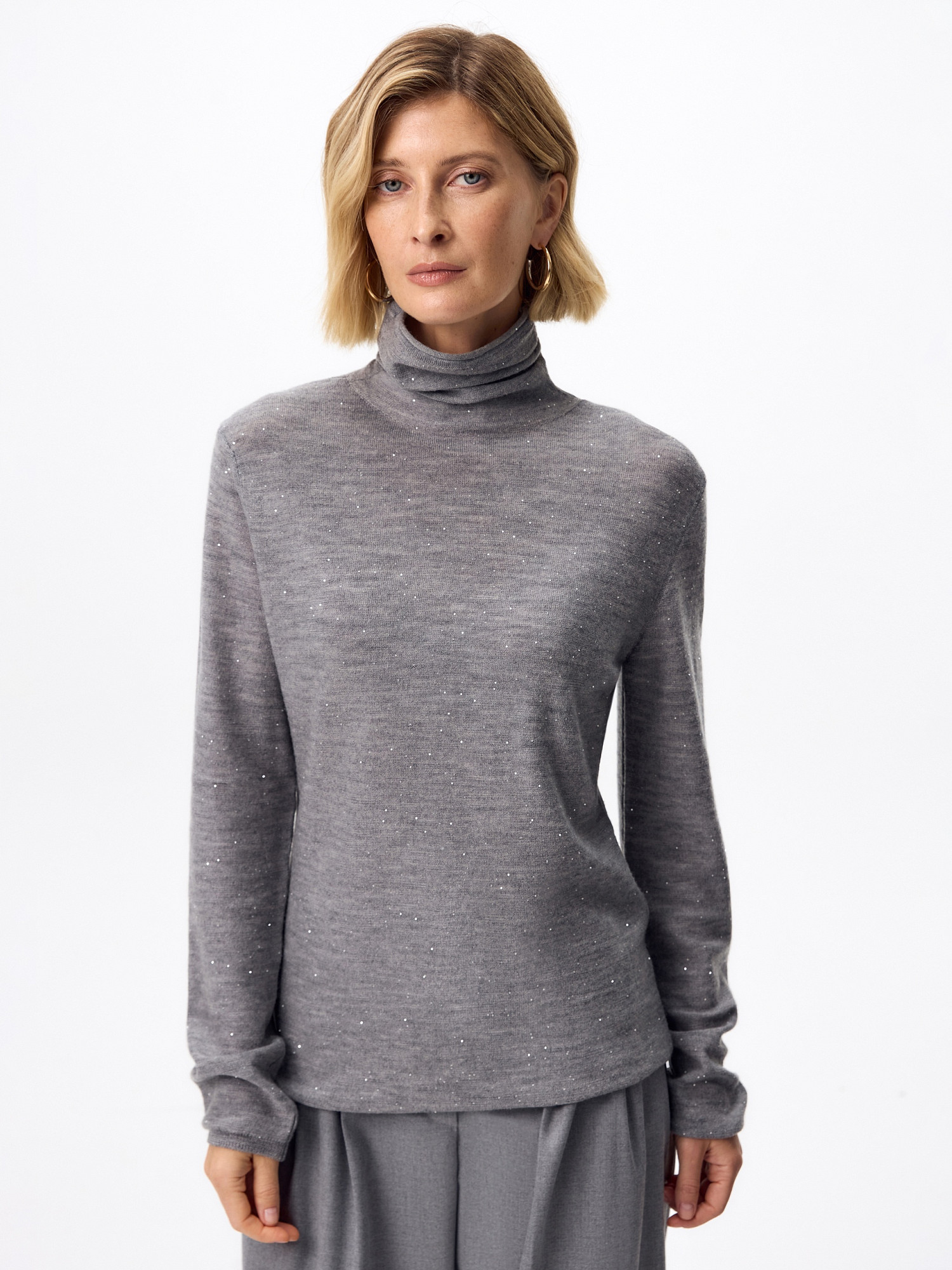 Свитер вязаный приятного серого цвета с воротником-стойкой, втачным, полной длины рукавом. Свитер нежный и приятный к телу.