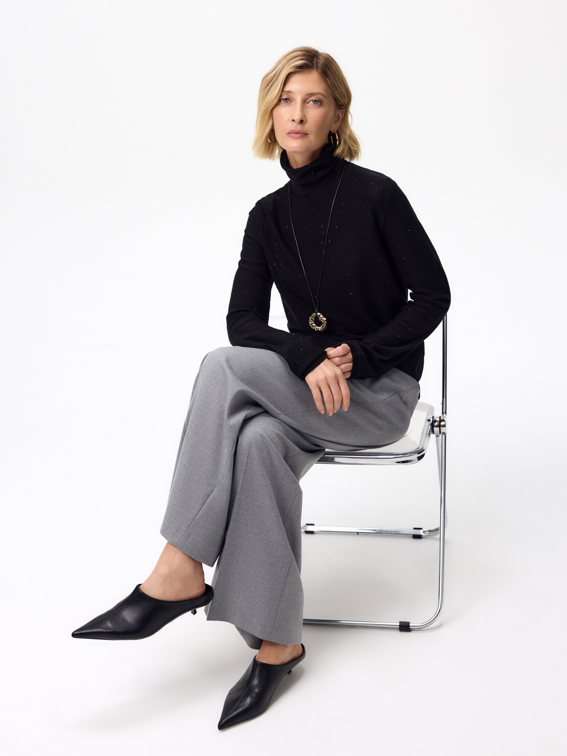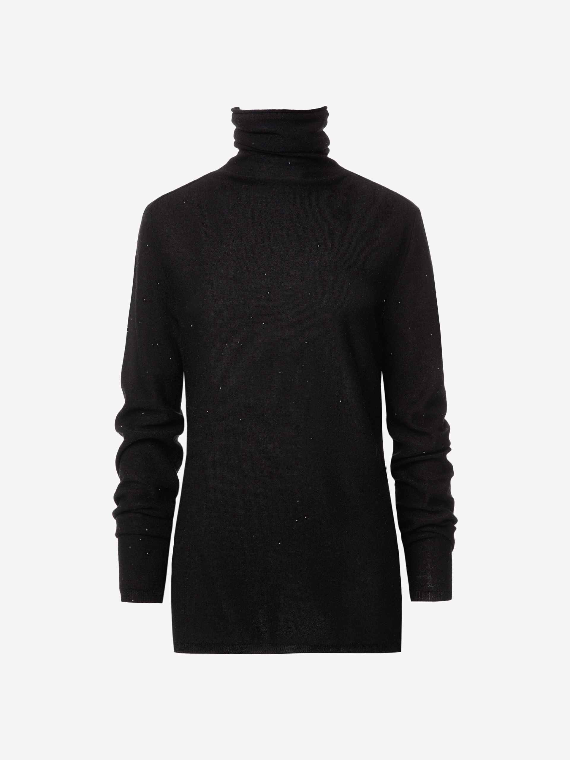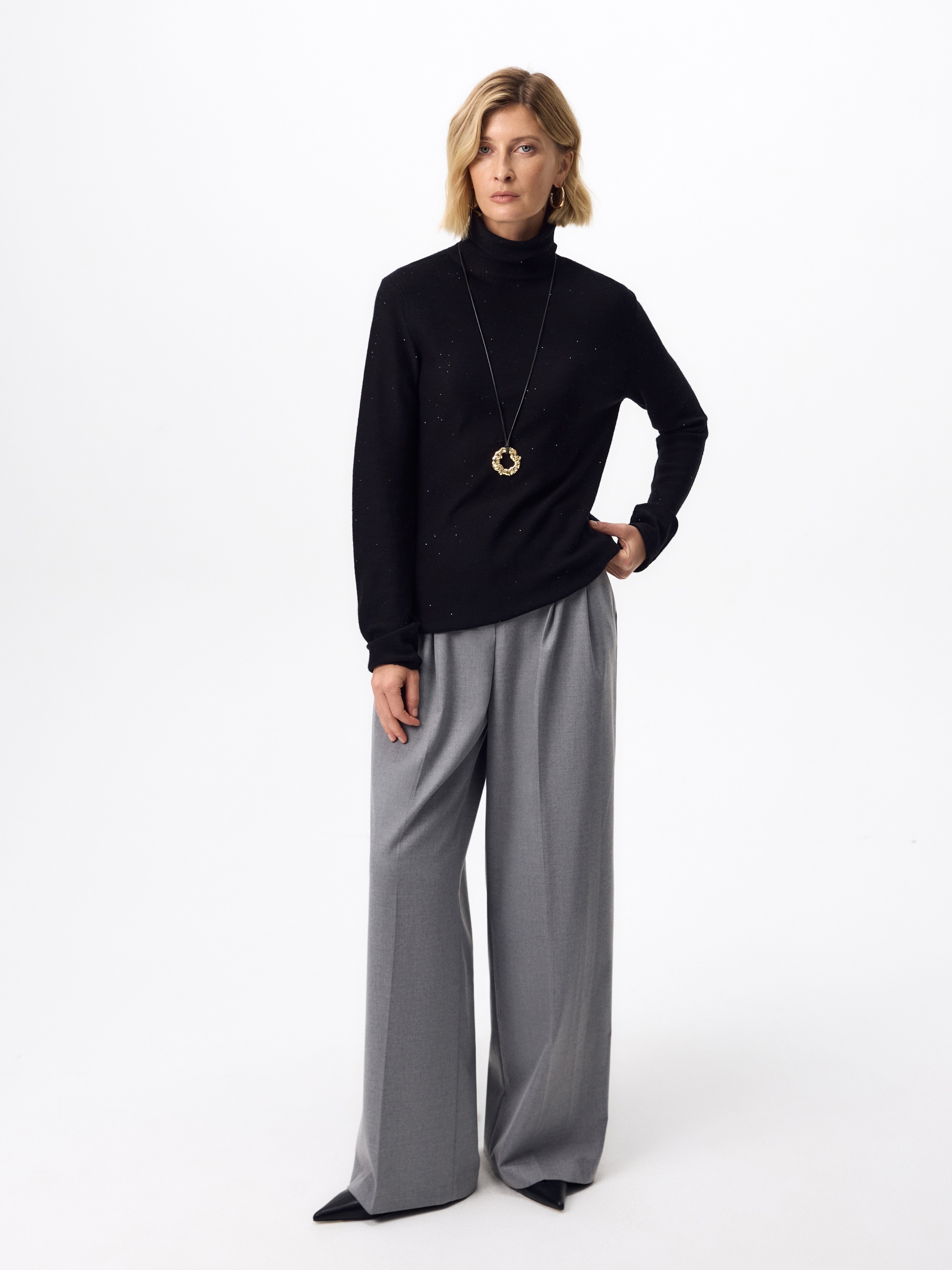 Свитер вязаный черного цвета с воротником-стойкой, втачным, полной длины рукавом. Свитер нежный и приятный к телу.