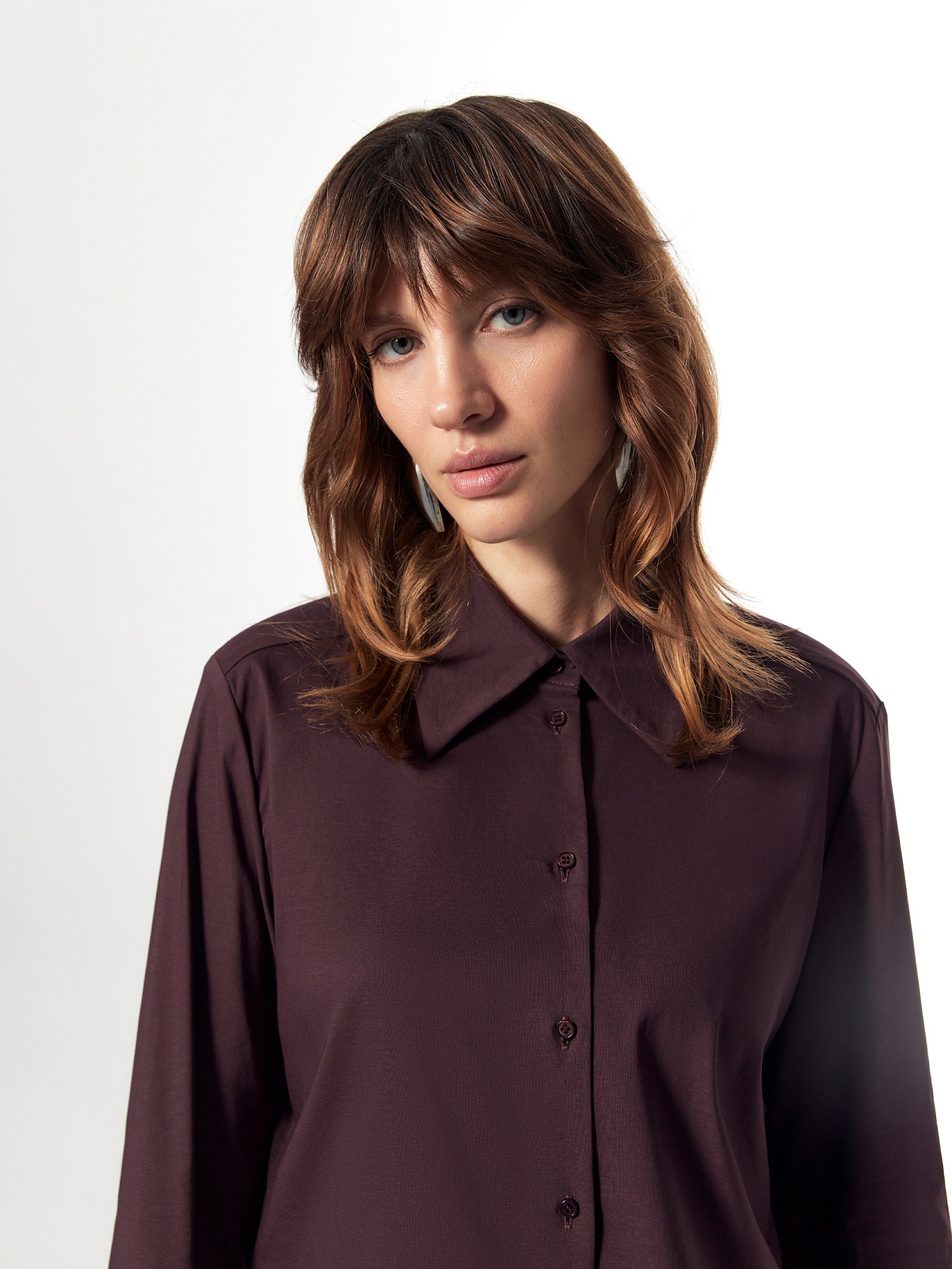 Приталенная блуза из блузочной хлопковой ткани бордового цвета с трендовым острым воротником. Блуза с классическим рукавом и широким манжетом.