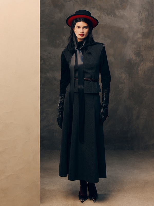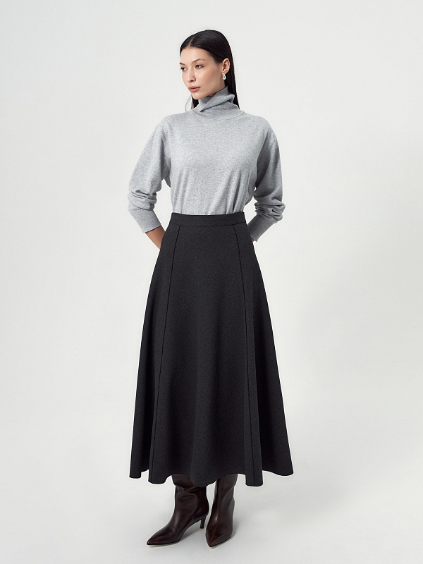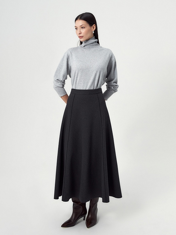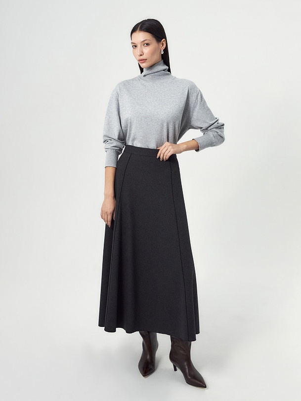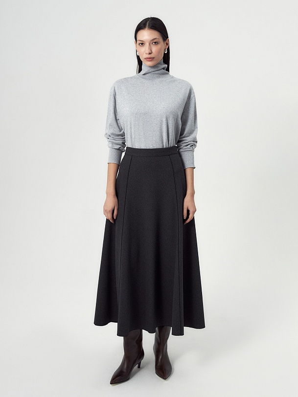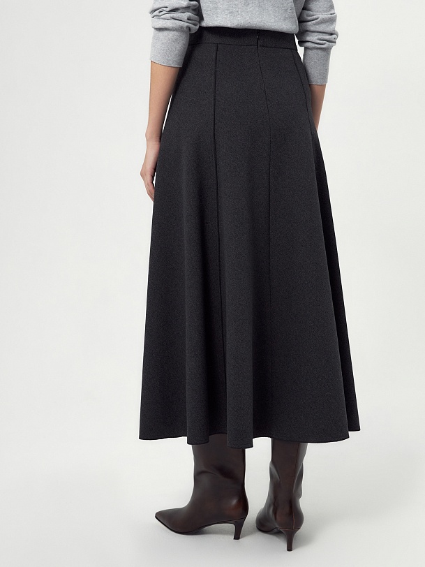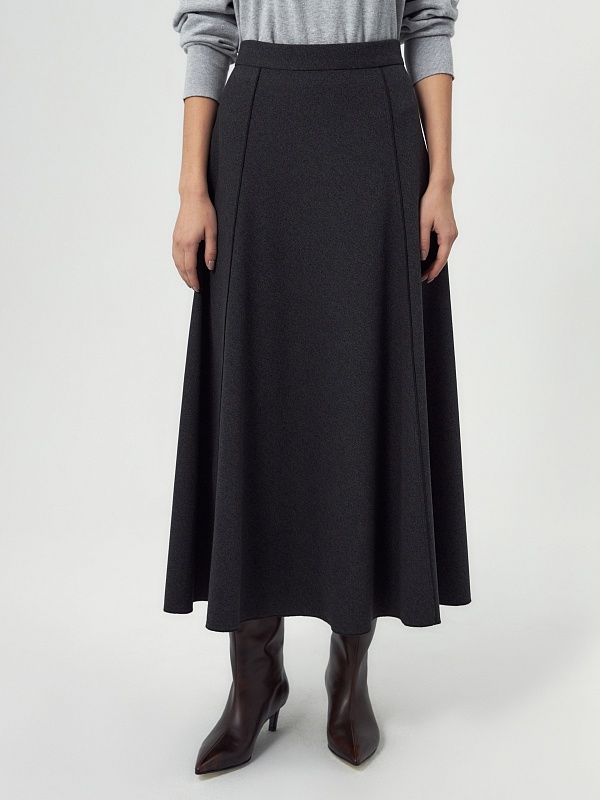 Юбка миди трапециевидной формы с рельефным и открытыми срезами, на притачном поясе, изготовлена из двух-сторонней плотной костюмной ткани темно-серого цвета. На спинке потайная молния.